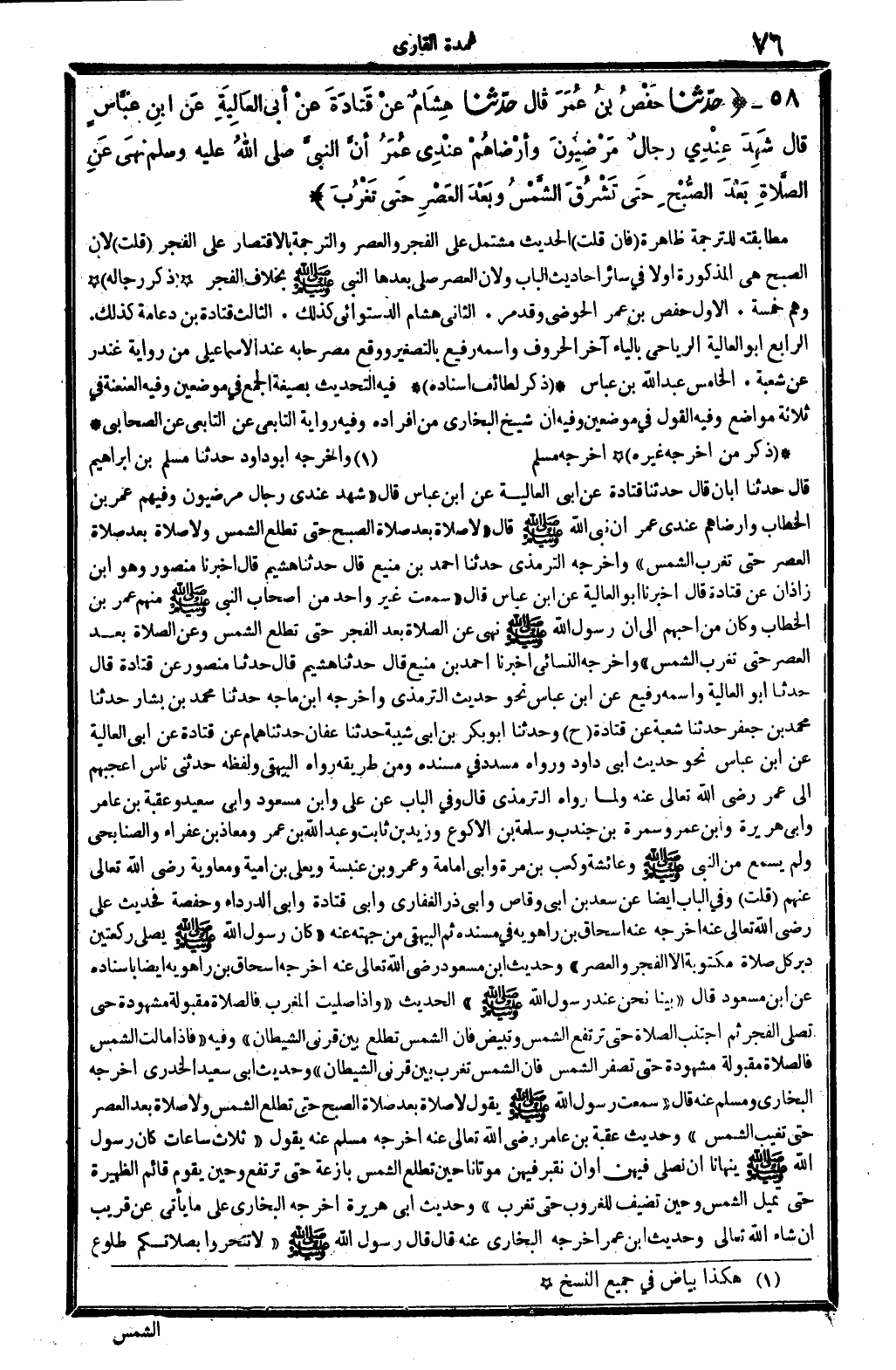 58 - (حَدثنَا حَفْص بن عمر قَالَ حَدثنَا هِشَام عَن قَتَادَة عَن أبي الْعَالِيَة عَن ابْن عَبَّاس قَالَ شهد عِنْدِي رجال مرضيون وأرضاهم عِنْدِي عمر أَن النَّبِي - صَلَّى اللَّهُ عَلَيْهِ وَسَلَّم َ - نهى عَن الصَّلَاة بعد الصُّبْح حَتَّى تشرق الشَّمْس وَبعد الْعَصْر حَتَّى تغرب) مطابقته للتَّرْجَمَة ظَاهِرَة (فَإِن قلت) الحَدِيث مُشْتَمل على الْفجْر وَالْعصر والترجمة بالاقتصار على الْفجْر (قلت) لِأَن الصُّبْح هِيَ الْمَذْكُورَة أَولا فِي سَائِر أَحَادِيث الْبَاب وَلِأَن الْعَصْر صلى بعْدهَا النَّبِي - صَلَّى اللَّهُ عَلَيْهِ وَسَلَّم َ - بِخِلَاف الْفجْر. (ذكر رِجَاله) وهم خَمْسَة. الاول حَفْص بن عمر الحوضي وَقد مر. الثَّانِي هِشَام الدستوَائي كَذَلِك. الثَّالِث قَتَادَة بن دعامة كَذَلِك. الرَّابِع أَبُو الْعَالِيَة الريَاحي بِالْيَاءِ آخر الْحُرُوف واسْمه رفيع بِالتَّصْغِيرِ وَوَقع مُصَرحًا بِهِ عِنْد الْإِسْمَاعِيلِيّ من رِوَايَة غنْدر عَن شُعْبَة. الْخَامِس عبد الله بن عَبَّاس. (ذكر لطائف إِسْنَاده) فِيهِ التحديث بِصِيغَة الْجمع فِي موضِعين وَفِيه العنعنة فِي ثَلَاثَة مَوَاضِع وَفِيه القَوْل فِي موضِعين وَفِيه أَن شيخ البُخَارِيّ من أَفْرَاده وَفِيه رِوَايَة التَّابِعِيّ عَن التَّابِعِيّ عَن الصَّحَابِيّ. (ذكر من أخرجه غَيره) أخرجه مُسلم وَأخرجه أَبُو دَاوُد حَدثنَا مُسلم بن إِبْرَاهِيم قَالَ حَدثنَا أبان قَالَ حَدثنَا قَتَادَة عَن أبي الْعَالِيَة عَن ابْن عَبَّاس قَالَ " شهد عِنْدِي رجال مرضيون وَفِيهِمْ عمر بن الْخطاب وأرضاهم عِنْدِي عمر أَن نَبِي الله - صَلَّى اللَّهُ عَلَيْهِ وَسَلَّم َ - قَالَ " لَا صَلَاة بعد صَلَاة الصُّبْح حَتَّى تطلع الشَّمْس وَلَا صَلَاة بعد صَلَاة الْعَصْر حَتَّى تغرب الشَّمْس " وَأخرجه التِّرْمِذِيّ حَدثنَا أَحْمد بن منيع قَالَ حَدثنَا هشيم قَالَ أخبرنَا مَنْصُور وَهُوَ ابْن زَاذَان عَن قَتَادَة قَالَ أخبرنَا أَبُو الْعَالِيَة عَن ابْن عَبَّاس قَالَ " سَمِعت غير وَاحِد من أَصْحَاب النَّبِي - صَلَّى اللَّهُ عَلَيْهِ وَسَلَّم َ - مِنْهُم عمر بن الْخطاب وَكَانَ من أحبهم إِلَيّ أَن رَسُول الله - صَلَّى اللَّهُ عَلَيْهِ وَسَلَّم َ - نهى عَن الصَّلَاة بعد الْفجْر حَتَّى تطلع الشَّمْس وَعَن الصَّلَاة بعد الْعَصْر حَتَّى تغرب الشَّمْس " وَأخرجه النَّسَائِيّ أخبرنَا أَحْمد بن منيع قَالَ حَدثنَا هشيم قَالَ حَدثنَا مَنْصُور عَن قَتَادَة قَالَ حَدثنَا أَبُو الْعَالِيَة واسْمه رفيع عَن ابْن عَبَّاس نَحْو حَدِيث التِّرْمِذِيّ وَأخرجه ابْن مَاجَه حَدثنَا مُحَمَّد بن بشار حَدثنَا مُحَمَّد بن جَعْفَر حَدثنَا شُعْبَة عَن قَتَادَة (ح) وَحدثنَا أَبُو بكر بن أبي شيبَة حَدثنَا عَفَّان حَدثنَا همام عَن قَتَادَة عَن أبي الْعَالِيَة عَن ابْن عَبَّاس نَحْو حَدِيث أَبُو دَاوُد وَرَوَاهُ مُسَدّد فِي مُسْنده وَمن طَرِيقه رَوَاهُ الْبَيْهَقِيّ وَلَفظه حَدثنِي نَاس أعجبهم إِلَيّ عمر رَضِي الله تَعَالَى عَنهُ وَلما رَوَاهُ التِّرْمِذِيّ قَالَ وَفِي الْبَاب عَن عَليّ وَابْن مَسْعُود وَأبي سعيد وَعقبَة بن عَامر وَأبي هُرَيْرَة وَابْن عمر وَسمرَة بن جُنْدُب وَسَلَمَة بن الْأَكْوَع وَزيد بن ثَابت وَعبد الله بن عمر ومعاذ بن عفراء والصنابحي وَلم يسمع من النَّبِي - صَلَّى اللَّهُ عَلَيْهِ وَسَلَّم َ - وَعَائِشَة وَكَعب بن مرّة وَأبي أُمَامَة وَعَمْرو بن عَنْبَسَة ويعلى بن أُميَّة وَمُعَاوِيَة رَضِي الله تَعَالَى عَنْهُم (قلت) وَفِي الْبَاب أَيْضا عَن سعد بن أبي وَقاص وَأبي ذَر الْغِفَارِيّ وَأبي قَتَادَة وَأبي الدَّرْدَاء وَحَفْصَة فَحَدِيث عَليّ رَضِي الله تَعَالَى عَنهُ أخرجه عَنهُ إِسْحَاق بن رَاهَوَيْه فِي مُسْنده ثمَّ الْبَيْهَقِيّ من جِهَته عَنهُ " أَن رَسُول الله - صَلَّى اللَّهُ عَلَيْهِ وَسَلَّم َ - يُصَلِّي 