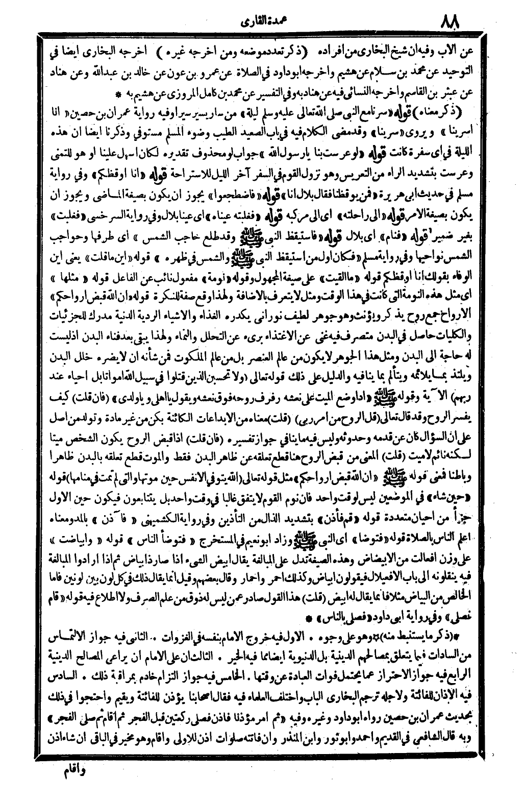 ذكر مَعْنَاهُ: قَوْله: (سرنا مَعَ النَّبِي، صلى الله عَلَيْهِ وَسلم، لَيْلَة) من: سَار يسير سيرا، وَفِيه رِوَايَة عمرَان بن حُصَيْن: (إِنَّا أسرينا) ، ويروى: (سرينا) ، وَقد مضى الْكَلَام فِيهِ فِي بَاب الصَّعِيد الطّيب وضوء الْمُسلم مُسْتَوفى، وَذكرنَا أَيْضا أَن هَذِه اللَّيْلَة فِي أَي سفرة كَانَت. قَوْله: (لَو عرست بِنَا يَا رَسُول الله) ، جَوَاب: لَو، مَحْذُوف تَقْدِيره: لَكَانَ أسهل علينا، أَو هُوَ لِلتَّمَنِّي. وعرست، بتَشْديد الرَّاء من: التَّعْرِيس، وَهُوَ: نزُول الْقَوْم فِي السّفر آخر اللَّيْل للاستراحة. قَوْله: (أَنا أوقظكم) ، وَفِي رِوَايَة مُسلم فِي حَدِيث أبي هُرَيْرَة: (فَمن يوقظنا؟ فَقَالَ بِلَال: أَنا) . قَوْله: (فاضطجعوا) ، يجوز أَن يكون بِصِيغَة الْمَاضِي، وَيجوز أَن يكون بِصِيغَة الْأَمر. قَوْله: (إِلَى رَاحِلَته) أَي: إِلَى مركبه. قَوْله: (فغلبته عَيناهُ) أَي: عينا بِلَال، وَفِي رِوَايَة السَّرخسِيّ: (فَغلبَتْ) بِغَيْر ضمير. قَوْله: (فَنَامَ) ، أَي: بِلَال. قَوْله: (فَاسْتَيْقَظَ النَّبِي صلى الله عَلَيْهِ وَسلم وَقد طلع حَاجِب الشَّمْس) ، أَي: طرفها، وحواجب الشَّمْس نَوَاحِيهَا. وَفِي رِوَايَة مُسلم: (فَكَانَ أول من اسْتَيْقَظَ النَّبِي صلى الله عَلَيْهِ وَسلم وَالشَّمْس فِي ظَهره) . قَوْله: (أَيْن مَا قلت؟) يَعْنِي: أَيْن الْوَفَاء بِقَوْلِك أَنا أوقظكم؟ . قَوْله: (مَا ألقيت) ، على صِيغَة الْمَجْهُول. وَقَوله: (نومَة) مفعول نَائِب عَن الْفَاعِل. قَوْله: (مثلهَا) أَي مثل هَذِه النومة الَّتِي كَانَت فِي هَذَا الْوَقْت، و: مثل، لَا يتعرف بِالْإِضَافَة، وَلِهَذَا وَقع صفة للنكرة. قَوْله: (إِن الله قبض أرواحكم) الْأَرْوَاح: جمع روح، يذكر وَيُؤَنث، وَهُوَ: جَوْهَر لطيف نوراني يكدره الْغذَاء والأشياء الرَّديئَة الدنية، مدرك للجزئيات والكليات، حَاصِل فِي الْبدن متصرف، فِيهِ غنى عَن الاغتذاء، بَرِيء عَن التَّحَلُّل والنماء، وَلِهَذَا يبْقى بعد فنَاء الْبدن إِذْ لَيست لَهُ حَاجَة إِلَى الْبدن، وَمثل هَذَا الْجَوْهَر لَا يكون من عَالم العنصر بل من عَالم الملكوت، فَمن شَأْنه أَن لَا يضرّهُ خلل الْبدن ويلتذ بِمَا يلائمه ويتألم بِمَا يُنَافِيهِ، وَالدَّلِيل على ذَلِك قَوْله تَعَالَى: {وَلَا تحسبن الَّذين قتلوا فِي سَبِيل الله أَمْوَاتًا بل أَحيَاء عِنْد رَبهم} (ال عمرَان: 169) . الْآيَة. وَقَوله: صلى الله عَلَيْهِ وَسلم: (إِذا وضع الْمَيِّت على نعشه رَفْرَف روحه فَوق نعشه، وَيَقُول: يَا أَهلِي وَيَا وَلَدي) فَإِن قلت: كَيفَ يُفَسر الرّوح وَقد قَالَ تَعَالَى: {قل الرّوح من أَمر رَبِّي} (الْإِسْرَاء: 18) . قلت: مَعْنَاهُ من الإبداعات الكائنة: بكن من غير مَادَّة، وتولد من أصل، على أَن السُّؤَال كَانَ عَن قدمه وحدوثه، وَلَيْسَ فِيهِ مَا يُنَافِي جَوَاز تَفْسِيره. فَإِن قلت: إِذا قبض الرّوح يكون الشَّخْص مَيتا، لكنه نَائِم لَا ميت؟ قلت: الْمَعْنى من قبض الرّوح هُنَا قطع تعلقه عَن ظَاهر الْبدن فَقَط، وَالْمَوْت قطع تعلقه بِالْبدنِ ظَاهرا وَبَاطنا، فَمَعْنَى قَوْله صلى الله عَلَيْهِ وَسلم , (إِن الله قبض أرواحكم) ، مثل قَوْله تَعَالَى: {الله يتوفى الْأَنْفس حِين مَوتهَا وَالَّتِي لم تمت فِي منامها} (الزمر: 42) . قَوْله: (حِين شَاءَ) ، فِي الْمَوْضِعَيْنِ لَيْسَ لوقت وَاحِد، فَإِن نوم الْقَوْم لَا يتَّفق غَالِبا فِي وَقت وَاحِد، بل يتتابعون فَيكون حِين الأول جزأ من أحيان مُتعَدِّدَة. قَوْله: (قُم فَأذن) ، بتَشْديد الذَّال، من التأذين. وَفِي رِوَايَة الْكشميهني: (فَأذن) ، بِالْمدِّ وَمَعْنَاهُ: أعلم النَّاس بِالصَّلَاةِ. قَوْله: (فَتَوَضَّأ) أَي: النَّبِي صلى الله عَلَيْهِ وَسلم، وَزَاد أَبُو نعيم فِي (الْمُسْتَخْرج) : فَتَوَضَّأ النَّاس) . قَوْله: (وابياضت) على وزن: افعالت، من الابيضاض، وَهَذِه الصِّيغَة تدل على الْمُبَالغَة، يُقَال: أَبيض الشَّيْء إِذا صَار ذَا ب