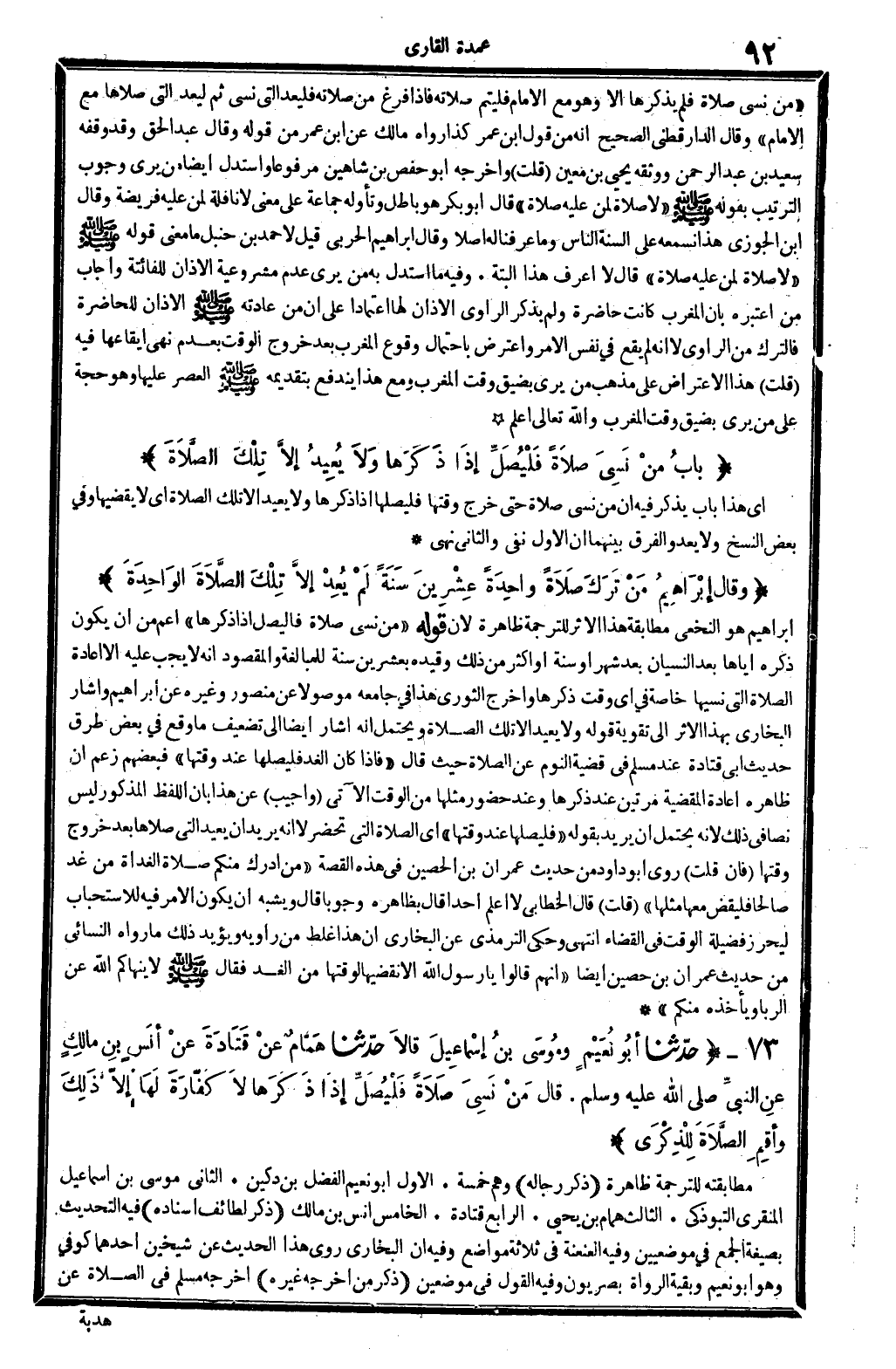 " من نسي صَلَاة فَلم يذكرهَا إِلَّا وَهُوَ مَعَ الإِمَام فليتم صلَاته فَإِذا فرغ من صلَاته فليعد الَّتِي نسي ثمَّ ليعد الَّتِي صلاهَا مَعَ الإِمَام " وَقَالَ الدَّارَقُطْنِيّ صَحِيح أَنه من قَول ابْن عمر كَذَا رَوَاهُ مَالك عَن ابْن عمر من قَوْله وَقَالَ عبد الْحق وَقد وَقفه سعيد بن عبد الرَّحْمَن وَوَثَّقَهُ يحيى بن معِين (قلت) وَأخرجه أَبُو حَفْص بن شاهين مَرْفُوعا وَاسْتدلَّ أَيْضا من يرى وجوب التَّرْتِيب بقوله - صَلَّى اللَّهُ عَلَيْهِ وَسَلَّم َ - " لَا صَلَاة من عَلَيْهِ صَلَاة " قَالَ أَبُو بكر هُوَ بَاطِل وتأوله جمَاعَة على معنى لَا نَافِلَة لمن عَلَيْهِ فَرِيضَة وَقَالَ ابْن الْجَوْزِيّ هَذَا نَسْمَعهُ على أَلْسِنَة النَّاس وَمَا عرفنَا لَهُ أصلا وَقَالَ إِبْرَاهِيم الْحَرْبِيّ قيل لِأَحْمَد بن حَنْبَل مَا معنى قَوْله - صَلَّى اللَّهُ عَلَيْهِ وَسَلَّم َ - " لَا صَلَاة من عَلَيْهِ صَلَاة " قَالَ لَا أعرف هَذَا الْبَتَّةَ. وَفِيه مَا اسْتدلَّ بِهِ من يرى عدم مَشْرُوعِيَّة الْأَذَان للفائتة وَأجَاب من اعْتَبرهُ بِأَن الْمغرب كَانَت حَاضِرَة وَلم يذكر الرَّاوِي الْأَذَان لَهَا اعْتِمَادًا على أَن من عَادَته - صَلَّى اللَّهُ عَلَيْهِ وَسَلَّم َ - الْأَذَان للحاضرة فالترك من الرَّاوِي لِأَنَّهُ لم يَقع فِي نفس الْأَمر وَاعْترض بِاحْتِمَال وُقُوع الْمغرب بعد خُرُوج الْوَقْت بعد نهي إيقاعها فِيهِ (قلت) هَذَا الِاعْتِرَاض على مَذْهَب من يرى بِضيق وَقت الْمغرب وَمَعَ هَذَا ينْدَفع بتقديمه - صَلَّى اللَّهُ عَلَيْهِ وَسَلَّم َ - الْعَصْر عَلَيْهَا وَهُوَ حجَّة على من يرى بِضيق وَقت الْمغرب وَالله تَعَالَى أعلم