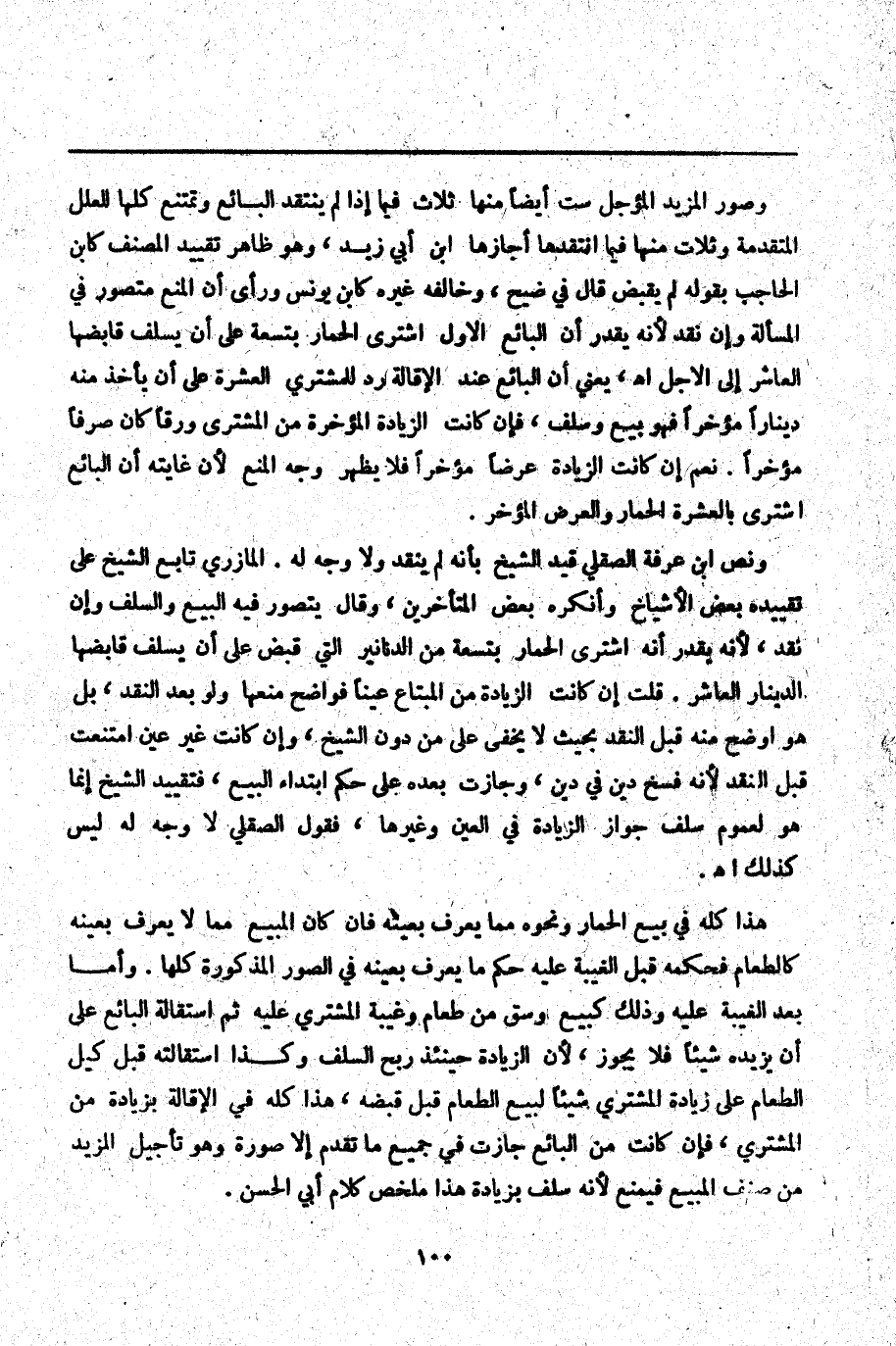 قُلْتُ: إنْ كَانَتْ الزِّيَادَةُ مِنْ الْمُبْتَاعِ عَيْنًا فَوَاضِحٌ مَنْعُهَا وَلَوْ بَعْدَ النَّقْدِ، بَلْ هُوَ أَوْضَحُ مِنْهُ قَبْلَ النَّقْدِ بِحَيْثُ لَا يَخْفَى عَلَى مَنْ دُونِ الشَّيْخِ، وَإِنْ كَانَتْ غَيْرَ عَيْنٍ امْتَنَعَتْ قَبْلَ النَّقْدِ لِأَنَّهُ فَسْخُ دَيْنٍ فِي دَيْنٍ، وَجَازَتْ بَعْدَهُ عَلَى حُكْمِ ابْتِدَاءِ الْبَيْعِ، فَتَقْيِيدُ الشَّيْخِ إنَّمَا هُوَ لِعُمُومِ سَلَفِ جَوَازِ الزِّيَادَةِ فِي الْعَيْنِ وَغَيْرِهَا، فَقَوْلُ الصِّقِلِّيِّ لَا وَجْهَ لَهُ لَيْسَ كَذَلِكَ اهـ. هَذَا كُلُّهُ فِي بَيْعِ الْحِمَارِ وَنَحْوِهِ مِمَّا يُعْرَفُ بِعَيْنِهِ فَإِنْ كَانَ الْمَبِيعُ مِمَّا لَا يُعْرَفُ بِعَيْنِهِ كَالطَّعَامِ فَحُكْمُهُ قَبْلَ الْغَيْبَةِ عَلَيْهِ حُكْمُ مَا يُعْرَفُ بِعَيْنِهِ فِي الصُّوَرِ الْمَذْكُورَةِ كُلِّهَا. وَأَمَّا بَعْدَ الْغَيْبَةِ عَلَيْهِ وَذَلِكَ كَبَيْعِ وَسْقٍ مِنْ طَعَامٍ وَغَيْبَةِ الْمُشْتَرِي عَلَيْهِ ثُمَّ اسْتِقَالَةِ الْبَائِعِ عَلَى أَنْ يَزِيدَهُ شَيْئًا فَلَا يَجُوزُ لِأَنَّ الزِّيَادَةَ حِينَئِذٍ رِبْحُ السَّلَفِ وَكَذَا اسْتِقَالَتُهُ قَبْلَ كَيْلِ الطَّعَامِ عَلَى زِيَادَةِ الْمُشْتَرِي شَيْئًا لِبَيْعِ الطَّعَامِ قَبْلَ قَبْضِهِ، هَذَا كُلُّهُ فِي الْإِقَالَةِ بِزِيَادَةٍ مِنْ الْمُشْتَرِي، فَإِنْ كَانَتْ مِنْ الْبَائِعِ جَازَتْ فِي جَمِيعِ مَا تَقَدَّمَ إلَّا صُورَةً وَهُوَ تَأْجِيلُ الْمَزِيدِ مِنْ صِنْفِ الْمَبِيعِ فَيُمْنَعُ لِأَنَّهُ سَلَفٌ بِزِيَادَةٍ هَذَا مُلَخَّصُ كَلَامِ أَبِي الْحَسَنِ.