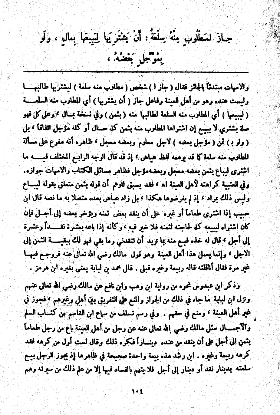 ـــــــــــــــــــــــــــــQوَالْأُمَّهَاتِ مُبْتَدِئًا بِالْجَائِزِ فَقَالَ (جَازَ لِ) شَخْصٍ (مَطْلُوبٍ مِنْهُ سِلْعَةٌ) لِيَشْتَرِيَهَا طَالِبُهَا وَلَيْسَتْ عِنْدَهُ وَهُوَ مِنْ أَهْلِ الْعِينَةِ وَفَاعِلُ جَازَ (أَنْ يَشْتَرِيَهَا) أَيْ الْمَطْلُوبُ مِنْهُ السِّلْعَةُ (لِيَبِيعَهَا) أَيْ الْمَطْلُوبُ مِنْهُ السِّلْعَةُ لِطَالِبِهَا مِنْهُ (بِثَمَنٍ) وَفِي نُسْخَةٍ بِمَالٍ، وَعَلَى كُلٍّ فَهُوَ صِلَةُ يَشْتَرِي لَا يَبِيعُ إنْ اشْتَرَاهَا الْمَطْلُوبُ مِنْهُ بِثَمَنٍ كُلِّهِ حَالٍّ أَوْ كُلِّهِ مُؤَجَّلٍ اتِّفَاقًا، بَلْ (وَلَوْ بِ) ثَمَنٍ (مُؤَجَّلٍ بَعْضُهُ) لِأَجَلٍ مَعْلُومٍ وَبَعْضُهُ مُعَجَّلٍ، ظَاهِرُهُ أَنَّهُ مُفَرَّعٌ عَلَى مَسْأَلَةِ الْمَطْلُوبِ مِنْهُ سِلْعَةٌ كَمَا قَدْ يُوهِمُهُ لَفْظُ عِيَاضٍ، إذْ قَدْ قَالَ: الْوَجْهُ الرَّابِعُ الْمُخْتَلَفُ فِيهِ مَا اُشْتُرِيَ لِيُبَاعَ بِثَمَنٍ بَعْضُهُ مُعَجَّلٌ وَبَعْضُهُ مُؤَجَّلٌ فَظَاهِرُ مَسَائِلِ الْكِتَابِ وَالْأُمَّهَاتِ جَوَازُهُ.