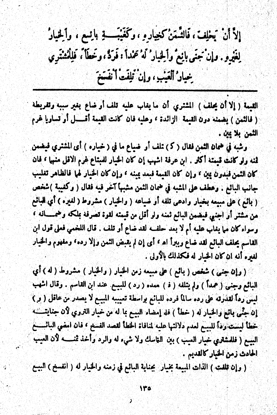 ـــــــــــــــــــــــــــــQالْقِيمَةُ (إلَّا أَنْ يَحْلِفَ) الْمُشْتَرِي أَنَّ مَا يُغَابُ عَلَيْهِ تَلِفَ أَوْ ضَاعَ بِغَيْرِ سَبَبِهِ وَتَفْرِيطِهِ (فَالثَّمَنُ) يَضْمَنُهُ دُونَ الْقِيمَةِ الزَّائِدَةِ، وَعَلَيْهِ فَإِنْ كَانَتْ الْقِيمَةُ أَقَلَّ أَوْ تَسَاوَيَا غَرِمَ الثَّمَنَ بِلَا يَمِينٍ. وَشَبَّهَ فِي ضَمَانِ الثَّمَنِ فَقَالَ (كَ) : تَلَفِ أَوْ ضَيَاعِ مَا فِي (خِيَارِهِ) أَيْ الْمُشْتَرِي فَيَضْمَنُ ثَمَنَهُ وَلَوْ كَانَتْ قِيمَتُهُ أَكْثَرَ. ابْنُ عَرَفَةَ أَشْهَبُ إنْ كَانَ الْخِيَارُ لِلْمُبْتَاعِ غَرِمَ الْأَقَلَّ مِنْهُمَا، فَإِنْ كَانَ الثَّمَنَ فَبِدُونِ يَمِينٍ، وَإِنْ كَانَ الْقِيمَةَ فَبَعْدَ يَمِينِهِ، وَإِنْ كَانَ الْخِيَارُ لَهُمَا فَالظَّاهِرُ تَغْلِيبُ جَانِبِ الْبَائِعِ.