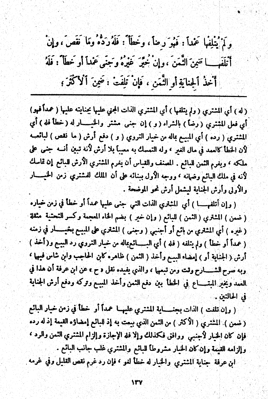 ـــــــــــــــــــــــــــــQلَهُ) أَيْ الْمُشْتَرِي (وَلَمْ يُتْلِفْهَا) أَيْ الْمُشْتَرِي الذَّاتَ الْمَجْنِيَّ عَلَيْهَا بِجِنَايَتِهِ عَلَيْهَا (عَمْدًا فَهُوَ) أَيْ فِعْلُ الْمُشْتَرِي (رِضًا) بِالشِّرَاءِ (وَ) إنْ جَنَى مُشْتَرٍ وَالْخِيَارُ لَهُ (خَطَأً فَلَهُ) أَيْ الْمُشْتَرِي (رَدُّهُ) أَيْ الْمَبِيعِ بِمَا لَهُ مِنْ خِيَارِ التَّرَوِّي (وَ) دَفَعَ أَرْشَ (مَا نَقَصَ) لِبَائِعِهِ لِأَنَّ الْخَطَأَ كَالْعَمْدِ فِي مَالِ الْغَيْرِ، وَلَهُ التَّمَسُّكُ بِهِ مَعِيبًا بِلَا أَرْشٍ لِأَنَّهُ تَبَيَّنَ أَنَّهُ جَنَى عَلَى مِلْكِهِ، وَيَغْرَمُ الثَّمَنَ لِلْبَائِعِ. الْمُصَنِّفُ وَالْقِيَاسُ أَنْ يَغْرَمَ الْمُشْتَرِي الْأَرْشَ لِلْبَائِعِ إنْ تَمَاسَكَ لِأَنَّهُ فِي مِلْكِ الْبَائِعِ وَضَمَانِهِ، وَوَجْهُ الْأَوَّلِ بِبِنَائِهِ عَلَى أَنَّ الْمِلْكَ لِلْمُشْتَرِي زَمَنَ الْخِيَارِ وَالْأَوْلَى وَأَرْشُ الْجِنَايَةِ لِيَشْمَلَ أَرْشَ نَحْوِ الْمُوضِحَةِ. (وَإِنْ أَتْلَفَهَا) أَيْ الْمُشْتَرِي الذَّاتَ الَّتِي جَنَى عَلَيْهَا عَمْدًا أَوْ خَطَأً فِي زَمَنِ خِيَارِهِ (ضَمِنَ) الْمُشْتَرِي (الثَّمَنَ) لِلْبَائِعِ (وَإِنْ خُيِّرَ) بِضَمِّ الْخَاءِ الْمُعْجَمَةِ وَكَسْرِ التَّحْتِيَّةِ مُثَقَّلَةً (غَيْرُهُ) أَيْ الْمُشْتَرِي مِنْ بَائِعٍ أَوْ أَجْنَبِيٍّ (وَجَنَى) الْمُشْتَرِي عَلَى الْمَبِيعِ بِخِيَارٍ فِي زَمَنِهِ (عَمْدًا أَوْ خَطَأً) وَلَمْ يُتْلِفْهُ (فَلَهُ) أَيْ الْبَائِعِ بِمَا لَهُ مِنْ خِيَارِ التَّرَوِّي رَدُّ الْبَيْعِ وَ (أَخْذُ) أَرْشِ (الْجِنَايَةِ أَوْ) إمْضَاءُ الْبَيْعِ وَأَخْذُ (الثَّمَنِ) ظَاهِرُهُ كَابْنِ الْحَاجِبِ وَابْنِ شَاسٍ فِيهِمَا، وَبِهِ صَرَّحَ الشَّارِحُ وتت وَمَنْ تَبِعَهُمَا، وَاَلَّذِي يُفِيدُهُ نَقْلُ " ح " عَنْ ابْنِ عَرَفَةَ أَنَّ هَذَا فِي الْعَمْدِ وَيُخَيَّرُ الْمُبْتَاعُ فِي الْخَطَأِ بَيْنَ دَفْعِ الثَّمَنِ وَأَخْذِ الْمَبِيعِ وَتَرْكِهِ وَدَفْعِ أَرْشِ الْجِنَايَةِ فِي الْحَالَتَيْنِ. .