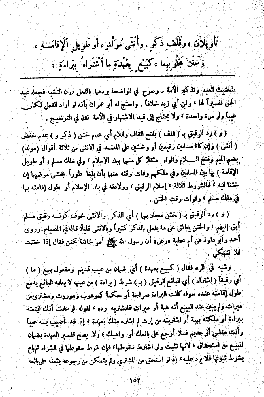 (وَ) رُدَّ الرَّقِيقُ بِ (قَلَفٍ) بِفَتْحِ الْقَافِ وَاللَّامِ أَيْ عَدَمِ خَتْنٍ (ذَكَرٍ وَ) عَدَمِ خَفْضِ (أُنْثَى) وَإِنْ كَانَا مُسْلِمَيْنِ رَفِيعَيْنِ أَوْ وَخْشَيْنِ عَلَى الْمُعْتَمَدِ فِي الْأُنْثَى مِنْ ثَلَاثَةِ أَقْوَالٍ (مُوَلَّدٍ) بِضَمِّ الْمِيمِ وَفَتْحِ اللَّامِ وَالْوَاوِ مُثَقَّلًا كُلٌّ مِنْهُمَا بِبَلَدِ الْإِسْلَامِ، وَفِي مِلْكِ مُسْلِمٍ (أَوْ طَوِيلِ الْإِقَامَةِ) بِهَا بَيْنَ الْمُسْلِمِينَ وَفِي مِلْكِهِمْ وَفَاتَ وَقْتُهُ مِنْهُمَا بِأَنْ بَلَغَا طَوْرًا يَخْشَى مَرَضَهُمَا إنْ خُتِنَا فِيهِ، فَالشُّرُوطُ ثَلَاثَةٌ، إسْلَامُ الرَّقِيقِ، وَوِلَادَتُهُ فِي بَلَدِ الْإِسْلَامِ أَوْ طُولِ إقَامَتِهِ بِهَا فِي مِلْكِ مُسْلِمٍ، وَفَوَاتُ وَقْتِ الْخَتْنِ. (وَ) رُدَّ الرَّقِيقُ بِ (خَتْنِ مَجْلُوبِهِمَا) أَيْ الذَّكَرِ وَالْأُنْثَى خَوْفَ كَوْنِهِ رَقِيقَ مُسْلِمٍ أَبَقَ إلَيْهِمْ، وَالْخَتْنُ يُطْلَقُ عَلَى مَا يُفْعَلُ بِالذَّكَرِ كَثِيرًا وَبِالْأُنْثَى قَلِيلًا قَالَهُ فِي الْمِصْبَاحِ. وَرَوَى أَحْمَدُ وَأَبُو دَاوُد عَنْ أُمِّ عَطِيَّةَ - رَضِيَ اللَّهُ عَنْهَا - «أَنَّ رَسُولَ اللَّهِ - صَلَّى اللَّهُ عَلَيْهِ وَسَلَّمَ - أَمَرَ خَاتِنَةً تَخْتِنُ فَقَالَ: إذَا خَتَنْت فَلَا تُنْهِكِي» .