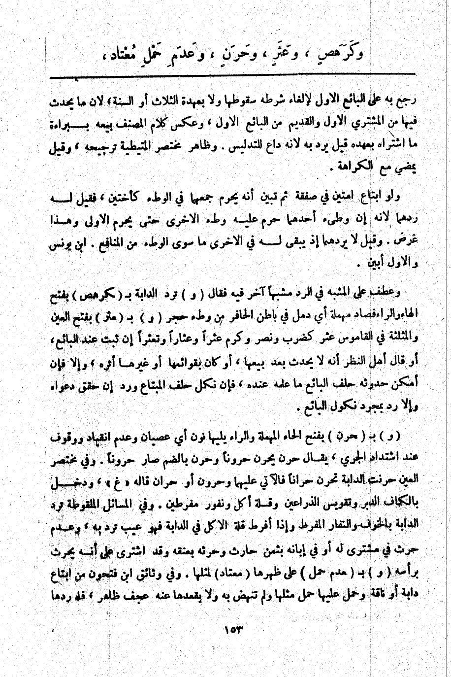 وَقِيلَ: لَا يَرُدُّهُمَا إذْ يَبْقَى لَهُ فِي الْأُخْرَى مَا سِوَى الْوَطْءِ مِنْ الْمَنَافِعِ. ابْنُ يُونُسَ وَالْأَوَّلُ أَبْيَنُ. وَعَطَفَ عَلَى الْمُشَبَّهِ فِي الرَّدِّ مُشَبَّهًا آخَرَ فِيهِ فَقَالَ: (وَ) تُرَدُّ الدَّابَّةُ بِ (كَرَهَصٍ) بِفَتْحِ الْهَاءِ وَالرَّاءِ فَصَادٍ مُهْمَلَةٍ أَيْ دُمَّلٍ فِي بَاطِنِ الْحَافِرِ مِنْ وَطْءِ حَجَرٍ (وَ) بِ (عَثَرٍ) بِفَتْحِ الْعَيْنِ وَالْمُثَلَّثَةِ فِي الْقَامُوسِ عَثَرَ كَضَرَبَ وَنَصَرَ وَكَرَمَ عَثْرًا وَعِثَارًا وَتَعَثُّرًا إنْ ثَبَتَ عِنْدَ الْبَائِعِ، أَوْ قَالَ أَهْلُ النَّظَرِ: إنَّهُ لَا يَحْدُثُ بَعْدَ بَيْعِهَا، أَوْ كَانَ بِقَوَائِمِهَا أَوْ غَيْرِهَا أَثَرُهُ، وَإِلَّا فَإِنْ أَمْكَنَ حُدُوثُهُ حَلَفَ الْبَائِعُ مَا عَلِمَهُ عِنْدَهُ، فَإِنْ نَكَلَ حَلَفَ الْمُبْتَاعُ وَرَدَّ إنْ حَقَّقَ دَعْوَاهُ وَإِلَّا رَدَّ بِمُجَرَّدِ نُكُولِ الْبَائِعِ. (وَ) بِ (حَرَنٍ) بِفَتْحِ الْحَاءِ الْمُهْمَلَةِ وَالرَّاءِ يَلِيهَا نُونٌ أَيْ عِصْيَانٌ وَعَدَمُ انْقِيَادٍ وَوُقُوفٍ عِنْدَ اشْتِدَادِ الْجَرْيِ، يُقَالُ حَرَنَ يَحْرُنُ حُرُونًا وَحَرُنَ بِالضَّمِّ صَارَ حَرُونًا. وَفِي مُخْتَصَرِ الْعَيْنِيِّ حَرَنَتْ الدَّابَّةُ تَحْرُنُ حِرَانًا فَالْآتِي عَلَيْهِمَا وَحُرُونٌ أَوْ حِرَانٌ قَالَهُ " غ "، وَدَخَلَ بِالْكَافِ الدُّبُرُ وَتَقْوِيسُ الذِّرَاعَيْنِ وَقِلَّةُ أَكْلٍ وَنُفُورٌ مُفْرَطَيْنِ. وَفِي الْمَسَائِلِ الْمَلْقُوطَةِ تُرَدُّ الدَّابَّةُ بِالْخَوْفِ وَالنِّفَارِ الْمُفْرَطِ وَإِذَا أَفْرَطَ قِلَّةُ الْأَكْلِ فِي الدَّابَّةِ فَهُوَ عَيْبٌ تُرَدُّ بِهِ، وَعَدَمُ حَرْثٍ فِي مُشْتَرٍ لَهُ أَوْ فِي إبَّانِهِ بِثَمَنِ حَارِثٍ وَحَرَثَهُ بِعُنُقِهِ وَقَدْ اشْتَرَى عَلَى أَنَّهُ يَحْرُثُ بِرَأْسِهِ (وَ) بِ (عَدَمِ حَمْلٍ) عَلَى ظَهْرِهَا (مُعْتَادٍ) لِمِثْلِهَا.