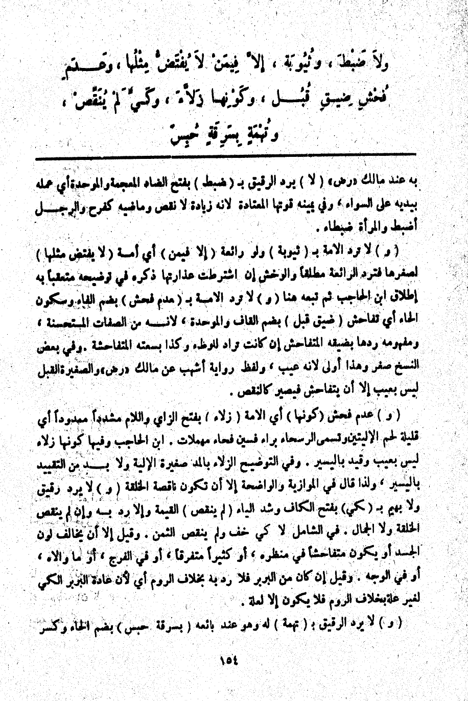 وَلَا بُدَّ مِنْ التَّقْيِيدِ بِالْيَسِيرِ، وَلِذَا قَالَ فِي الْمَوَّازِيَّةِ وَالْوَاضِحَةِ: إلَّا أَنْ تَكُونَ نَاقِصَةَ الْخِلْقَةِ (وَ) لَا يُرَدُّ رَقِيقٌ وَلَا بَهِيمٌ بِ (كَيٍّ) بِفَتْحِ الْكَافِ وَشَدِّ الْيَاءِ (لَمْ يُنْقِصْ) الْقِيمَةَ وَإِلَّا رُدَّ بِهِ وَإِنْ لَمْ يُنْقِصْ الْخِلْقَةَ وَلَا الْجَمَالَ. فِي الشَّامِلِ لَا كَيِّ خُفٍّ وَلَمْ يُنْقِصْ الثَّمَنَ. وَقِيلَ: إلَّا أَنْ يُخَالِفَ لَوْنَ الْجَسَدِ أَوْ يَكُونَ مُتَفَاحِشًا فِي مَنْظَرِهِ، أَوْ كَثِيرًا مُتَفَرِّقًا، أَوْ فِي الْفَرْجِ، أَوْ مَا وَالَاهُ، أَوْ فِي الْوَجْهِ. وَقِيلَ: إنْ كَانَ مِنْ الْبَرْبَرِ فَلَا يُرَدُّ بِهِ بِخِلَافِ الرُّومِ أَيْ لِأَنَّ عَادَةَ الْبَرْبَرِ الْكَيُّ لِغَيْرِ عِلَّةٍ بِخِلَافِ الرُّومِ فَلَا يَكُونُ إلَّا لِعِلَّةٍ. .