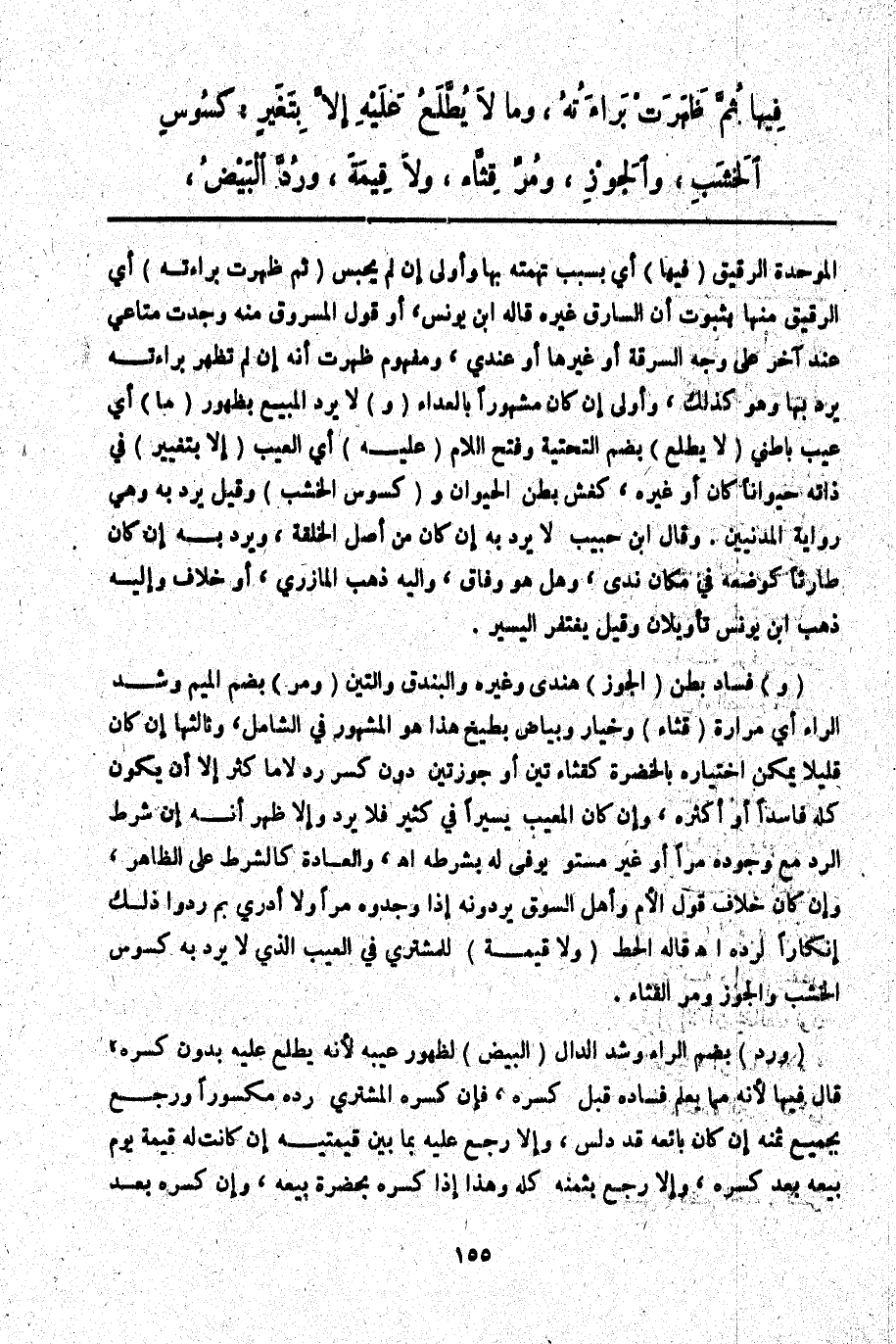 ـــــــــــــــــــــــــــــQالْمُوَحَّدَةِ الرَّقِيقُ (فِيهَا) أَيْ بِسَبَبِ تُهْمَتِهِ بِهَا وَأَوْلَى إنْ لَمْ يُحْبَسْ (ثُمَّ ظَهَرَتْ بَرَاءَتُهُ) أَيْ الرَّقِيقِ مِنْهَا بِثُبُوتِ أَنَّ السَّارِقَ غَيْرُهُ قَالَهُ ابْنُ يُونُسَ، أَوْ قَوْلُ الْمَسْرُوقِ مِنْهُ وَجَدْت مَتَاعِي عِنْدَ آخَرَ عَلَى وَجْهِ السَّرِقَةِ أَوْ غَيْرِهَا أَوْ عِنْدِي، وَمَفْهُومُ ظَهَرَتْ أَنَّهُ إنْ لَمْ تَظْهَرْ بَرَاءَتُهُ يُرَدُّ بِهَا وَهُوَ كَذَلِكَ وَأَوْلَى إنْ كَانَ مَشْهُورًا بِالْعَدَاءِ (وَ) لَا يُرَدُّ الْمَبِيعُ بِظُهُورِ (مَا) أَيْ عَيْبٍ بَاطِنِيٍّ (لَا يُطَّلَعُ) بِضَمِّ التَّحْتِيَّةِ وَفَتْحِ اللَّامِ (عَلَيْهِ) أَيْ الْعَيْبِ (إلَّا بِتَغْيِيرٍ) فِي ذَاتِهِ حَيَوَانًا كَانَ أَوْ غَيْرَهُ، كَغِشِّ بَطْنِ الْحَيَوَانِ وَ (كَسُوسِ الْخَشَبِ) وَقِيلَ: يُرَدُّ بِهِ وَهِيَ رِوَايَةُ الْمَدَنِيِّينَ. وَقَالَ ابْنُ حَبِيبٍ: لَا يُرَدُّ بِهِ إنْ كَانَ مِنْ أَصْلِ الْخِلْقَةِ، وَيُرَدُّ بِهِ إنْ كَانَ طَارِئًا كَوَضْعِهِ فِي مَكَان نَدِيٍّ، وَهَلْ هُوَ وِفَاقٌ، وَإِلَيْهِ ذَهَبَ الْمَازِرِيُّ، أَوْ خِلَافٌ وَإِلَيْهِ ذَهَبَ ابْنُ يُونُسَ تَأْوِيلَانِ وَقِيلَ: يُغْتَفَرُ الْيَسِيرُ (وَ) فَسَادُ بَطْنِ (الْجَوْزِ) هِنْدِيٌّ وَغَيْرُهُ وَالْبُنْدُقِ وَالتِّينِ (وَمُرِّ) بِضَمِّ الْمِيمِ وَشَدِّ الرَّاءِ أَيْ مَرَارَةُ (قِثَّاءٍ) وَخِيَارٍ وَبَيَاضِ بِطِّيخٍ هَذَا هُوَ الْمَشْهُورُ فِي الشَّامِلِ، وَثَالِثُهَا إنْ كَانَ قَلِيلًا يُمْكِنُ اخْتِيَارُهُ بِالْخُضْرَةِ كَقِثَّاءَتَيْنِ أَوْ جَوْزَتَيْنِ دُونَ كَسْرٍ رَدَّ لَا مَا كَثُرَ إلَّا أَنْ يَكُونَ كُلُّهُ فَاسِدًا أَوْ أَكْثَرُهُ، وَإِنْ كَانَ الْمَعِيبُ يَسِيرًا فِي كَثِيرٍ فَلَا يُرَدُّ وَإِلَّا ظَهَرَ أَنَّهُ إنْ شَرَطَ الرَّدَّ مَعَ وُجُودِهِ مُرًّا أَوْ غَيْرَ مُسْتَوٍ يُوفَى لَهُ بِشَرْطِهِ. اهـ. وَالْعَادَةُ كَالشَّرْطِ عَلَى الظَّاهِرِ، وَإِنْ كَانَ خِلَافَ قَوْلِ الْأُمِّ وَأَهْلُ السُّوقِ يَرُدُّونَهُ إذَا وَجَدُوهُ مُرًّا وَلَا أَدْرِي بِمَ رَدُّوا ذَلِكَ إنْكَارًا لِرَدِّهِ اهـ قَالَهُ الْحَطّ (وَلَا قِيمَةَ) لِلْمُشْتَرَى فِي الْعَيْبِ الَّذِي لَا يُرَدُّ بِهِ كَسُوسِ الْخَشَبِ وَالْجَوْزِ وَمُرِّ الْقِثَّاءِ. .