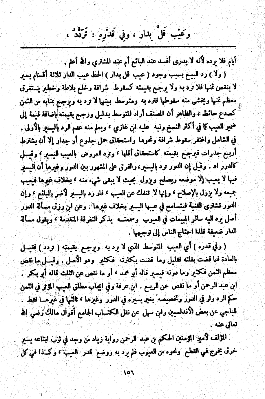 وَعَنْ ابْنِ رِزْقٍ مَسْأَلَةُ الدُّورِ أَصْلٌ يُرَدُّ إلَيْهِ سَائِرُ الْمَبِيعَاتِ فِي الْعُيُوبِ وَسَمِعْتُهُ يَذْكُرُ التَّفْرِقَةَ الْمُتَقَدِّمَةَ، وَيَقُولُ مَسْأَلَةُ الدَّارِ ضَعِيفَةٌ فَلِذَا احْتَاجَ النَّاسُ إلَى تَوْجِيهِهَا. (وَفِي قَدْرِهِ) أَيْ الْعَيْبِ الْمُتَوَسِّطِ الَّذِي لَا يُرَدُّ بِهِ وَيَرْجِعُ بِقِيمَتِهِ (تَرَدُّدٌ) فَقِيلَ: بِالْعَادَةِ فَمَا قَضَتْ بِقِلَّتِهِ فَقَلِيلٌ وَمَا قَضَتْ بِكَثْرَتِهِ فَكَثِيرٌ وَهُوَ الْأَصْلُ. وَقِيلَ: مَا نَقَصَ مُعْظَمَ الثَّمَنِ فَكَثِيرٌ وَمَا دُونَهُ فَيَسِيرٌ قَالَهُ أَبُو مُحَمَّدٍ، أَوْ مَا نَقَصَ عَنْ الثُّلُثِ قَالَهُ أَبُو بَكْرِ بْنُ عَبْدِ الرَّحْمَنِ أَوْ مَا نَقَصَ عَنْ الرُّبُعِ. ابْنُ عَرَفَةَ وَفِي إيجَابِ مُطْلَقِ الْعَيْبِ الْمُؤَثِّرِ فِي الثَّمَنِ حُكْمُ الرَّدِّ وَلَوْ فِي الدُّورِ وَتَخْصِيصُهُ بِغَيْرِ يَسِيرِهِ فِي الدُّورِ وَغَيْرِهَا، ثَالِثُهَا فِي غَيْرِهَا فَقَطْ. الْبَاجِيَّ عَنْ بَعْضِ الْأَنْدَلُسِيِّينَ وَابْنِ سَهْلٍ عَنْ نَقْلِ الْكِتَابِ الْجَامِعِ أَقْوَالُ مَالِكٍ - رَضِيَ اللَّهُ تَعَالَى عَنْهُ -.