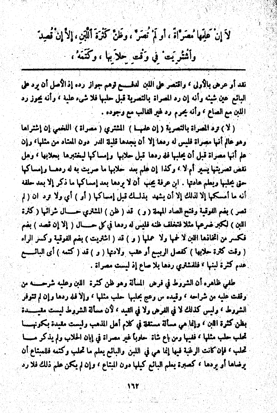 ابْنُ عَرَفَةَ يَجِبُ أَنْ لَا يَرُدَّهَا بَعْدَ إمْسَاكِهَا مَا ذُكِرَ إلَّا بَعْدَ حَلِفِهِ أَنَّهُ مَا أَمْسَكَهَا إلَّا لِذَلِكَ إلَّا أَنْ يُشْهِدَ بِذَلِكَ قَبْلَ إمْسَاكِهَا (أَوْ) أَيْ وَلَا تُرَدُّ إنْ (لَمْ تُصَرَّ) بِضَمِّ الْفَوْقِيَّةِ وَفَتْحِ الصَّادِ الْمُهْمَلَةِ (وَ) قَدْ (ظَنَّ) الْمُشْتَرِي حَالَ شِرَائِهَا (كَثْرَةَ اللَّبَنِ) لِكِبَرِ ضَرْعِهَا مَثَلًا فَتَخَلَّفُ ظَنُّهُ فَلَيْسَ لَهُ رَدُّهَا فِي كُلِّ حَالٍ (إلَّا إنْ قُصِدَ) بِضَمٍّ فَكَسْرٍ مِنْ اتِّخَاذِهَا اللَّبَنُ لَا لَحْمُهَا وَلَا عَمَلُهَا (وَ) قَدْ (اُشْتُرِيَتْ) بِضَمِّ الْفَوْقِيَّةِ وَكَسْرِ الرَّاءِ (وَقْتَ كَثْرَةِ حِلَابِهَا) كَفَصْلِ الرَّبِيعِ أَوْ عَقِبَ وِلَادَتِهَا (وَ) قَدْ (كَتَمَهُ) أَيْ الْبَائِعُ عَدَمَ كَثْرَةِ لَبَنِهَا، فَلِلْمُشْتَرِي رَدُّهَا بِلَا صَاعٍ إذْ لَيْسَتْ مُصَرَّاةً. طفي ظَاهِرُهُ أَنَّ الشُّرُوطَ فِي فَرْضِ الْمَسْأَلَةِ وَهُوَ ظَنُّ كَثْرَةِ اللَّبَنِ وَعَلَيْهِ شَرَحَهُ مَنْ وَقَفْت عَلَيْهِ مِنْ شُرَّاحِهِ، وَقَيَّدَهُ س وعج بِحَلْبِهَا حَلْبَ مِثْلِهَا، وَإِلَّا فَلَهُ رَدُّهَا وَإِنْ لَمْ تَتَوَفَّرْ الشُّرُوطُ، وَلَيْسَ كَذَلِكَ لَا فِي الْفَرْضِ وَلَا فِي الْقَيْدِ، لِأَنَّ مَسْأَلَةَ الشُّرُوطِ لَيْسَتْ مُقَيَّدَةً بِظَنِّ كَثْرَةِ اللَّبَنِ، وَإِنَّمَا هِيَ مَسْأَلَةٌ مُسْتَقِلَّةٌ فِي كَلَامِ أَهْلِ الْمَذْهَبِ وَلَيْسَتْ مُقَيَّدَةً بِكَوْنِهَا تُحْلَبُ حَلْبَ مِثْلِهَا، فَفِيهَا وَمَنْ بَاعَ شَاةً حَلُوبًا غَيْرَ مُصَرَّاةٍ فِي إبَّانِ الْحِلَابِ وَلَمْ يَذْكُرْ مَا تَحْلُبُ، فَإِنْ كَانَتْ الرَّغْبَةُ فِيهَا إنَّمَا هِيَ فِي اللَّبَنِ وَالْبَائِعُ يَعْلَمُ مَا تَحْلُبُ وَكَتَمَهُ فَلِلْمُبْتَاعِ أَنْ يَرْضَاهَا أَوْ يَرُدَّهَا، كَصُبْرَةٍ يَعْلَمُ الْبَائِعُ كَيْلَهَا دُونَ الْمُبْتَاعِ، وَإِنْ لَمْ يَكُنْ عَلِمَ ذَلِكَ فَلَا رَدَّ