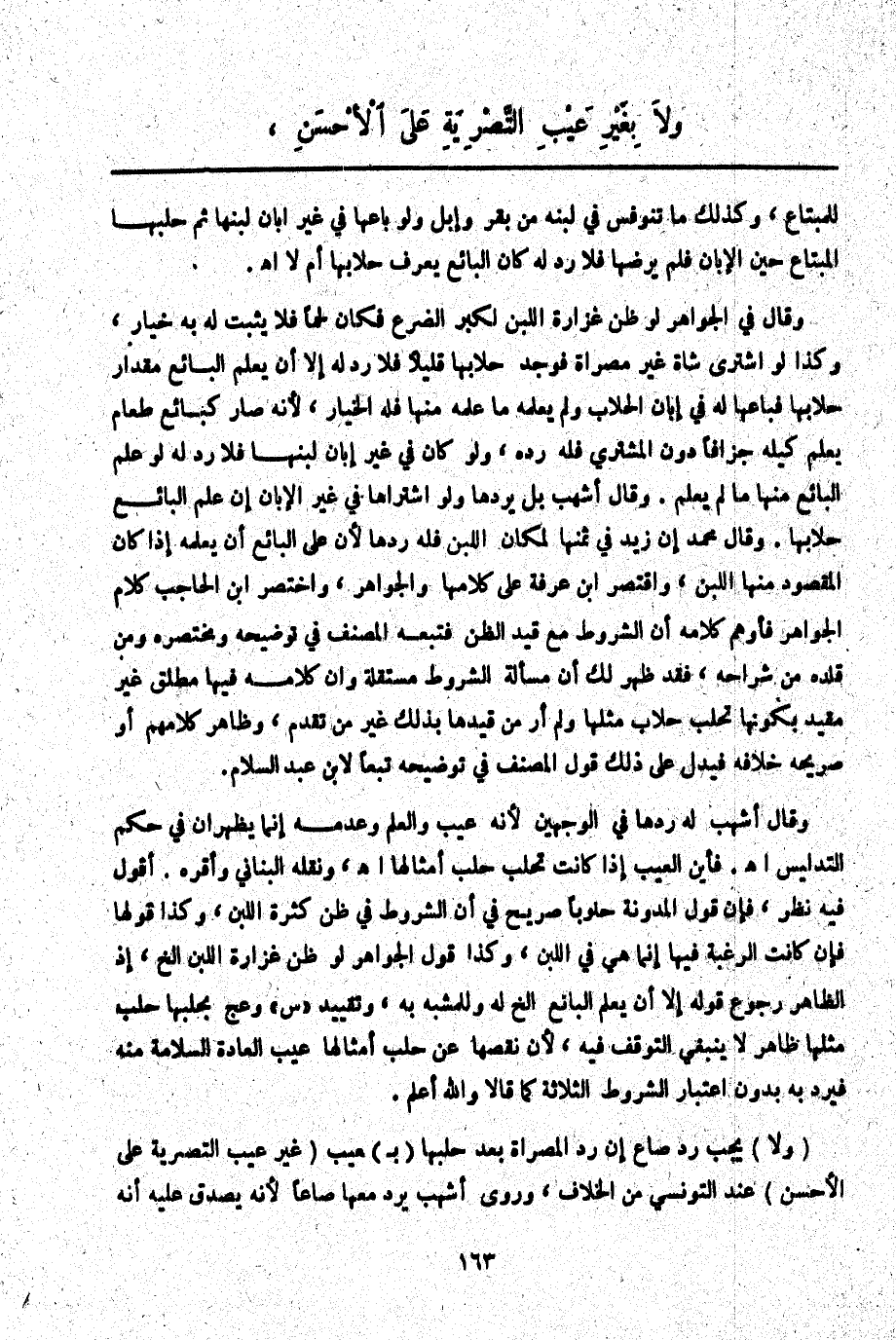 وَقَالَ فِي الْجَوَاهِرِ: لَوْ ظَنَّ غَزَارَةَ اللَّبَنِ لِكِبَرِ الضَّرْعِ فَكَانَ لَحْمًا فَلَا يَثْبُتُ لَهُ بِهِ خِيَارٌ، وَكَذَا لَوْ اشْتَرَى شَاةً غَيْرَ مُصَرَّاةٍ فَوَجَدَ حِلَابَهَا قَلِيلًا فَلَا رَدَّ لَهُ إلَّا أَنْ يَعْلَمَ الْبَائِعُ مِقْدَارَ حِلَابِهَا فَبَاعَهَا لَهُ فِي إبَّانِ الْحِلَابِ وَلَمْ يُعْلِمْهُ مَا عَلِمَهُ مِنْهَا فَلَهُ الْخِيَارُ لِأَنَّهُ صَارَ كَبَائِعِ طَعَامٍ يَعْلَمُ كَيْلَهُ جُزَافًا دُونَ الْمُشْتَرِي فَلَهُ رَدُّهُ، وَلَوْ كَانَ فِي غَيْرِ إبَّانِ لَبَنِهَا فَلَا رَدَّ لَهُ لَوْ عَلِمَ الْبَائِعُ مِنْهَا مَا لَمْ يَعْلَمْ. وَقَالَ أَشْهَبُ: بَلْ يَرُدُّهَا وَلَوْ اشْتَرَاهَا فِي غَيْرِ الْإِبَّانِ إنْ عَلِمَ الْبَائِعُ حِلَابَهَا. وَقَالَ مُحَمَّدٌ: إنْ زِيدَ فِي ثَمَنِهَا لِمَكَانِ اللَّبَنِ فَلَهُ رَدُّهَا لِأَنَّ عَلَى الْبَائِعِ أَنْ يُعْلِمَهُ إذَا كَانَ الْمَقْصُودُ مِنْهَا اللَّبَنَ، وَاقْتَصَرَ ابْنُ عَرَفَةَ عَلَى كَلَامِهَا وَالْجَوَاهِرِ، وَاخْتَصَرَ ابْنُ الْحَاجِبِ كَلَامَ الْجَوَاهِرِ فَأَوْهَمَ كَلَامُهُ أَنَّ الشُّرُوطَ مَعَ قَيْدِ الظَّنِّ فَتَبِعَهُ الْمُصَنِّفُ فِي تَوْضِيحِهِ وَمُخْتَصَرِهِ وَمَنْ قَلَّدَهُ مِنْ شُرَّاحِهِ، فَقَدْ ظَهَرَ لَكَأَنَّ مَسْأَلَةَ الشُّرُوطِ مُسْتَقِلَّةٌ وَأَنَّ كَلَامَهُ فِيهَا مُطْلَقٌ غَيْرُ مُقَيَّدٍ بِكَوْنِهَا تُحْلَبُ حِلَابَ مِثْلِهَا وَلَمْ أَرَ مَنْ قَيَّدَهَا بِذَلِكَ غَيْرَ مَنْ تَقَدَّمَ وَظَاهِرُ كَلَامِهِمْ أَوْ صَرِيحُهُ خِلَافُهُ فَيَدُلُّ عَلَى ذَلِكَ قَوْلُ الْمُصَنِّفِ فِي تَوْضِيحِهِ تَبَعًا لِابْنِ عَبْدِ السَّلَامِ. وَقَالَ أَشْهَبُ: لَهُ رَدُّهَا فِي الْوَجْهَيْنِ لِأَنَّهُ عَيْبٌ وَالْعِلْمُ وَعَدَمُهُ إنَّمَا يَظْهَرَانِ فِي حُكْمِ التَّدْلِيسِ اهـ.