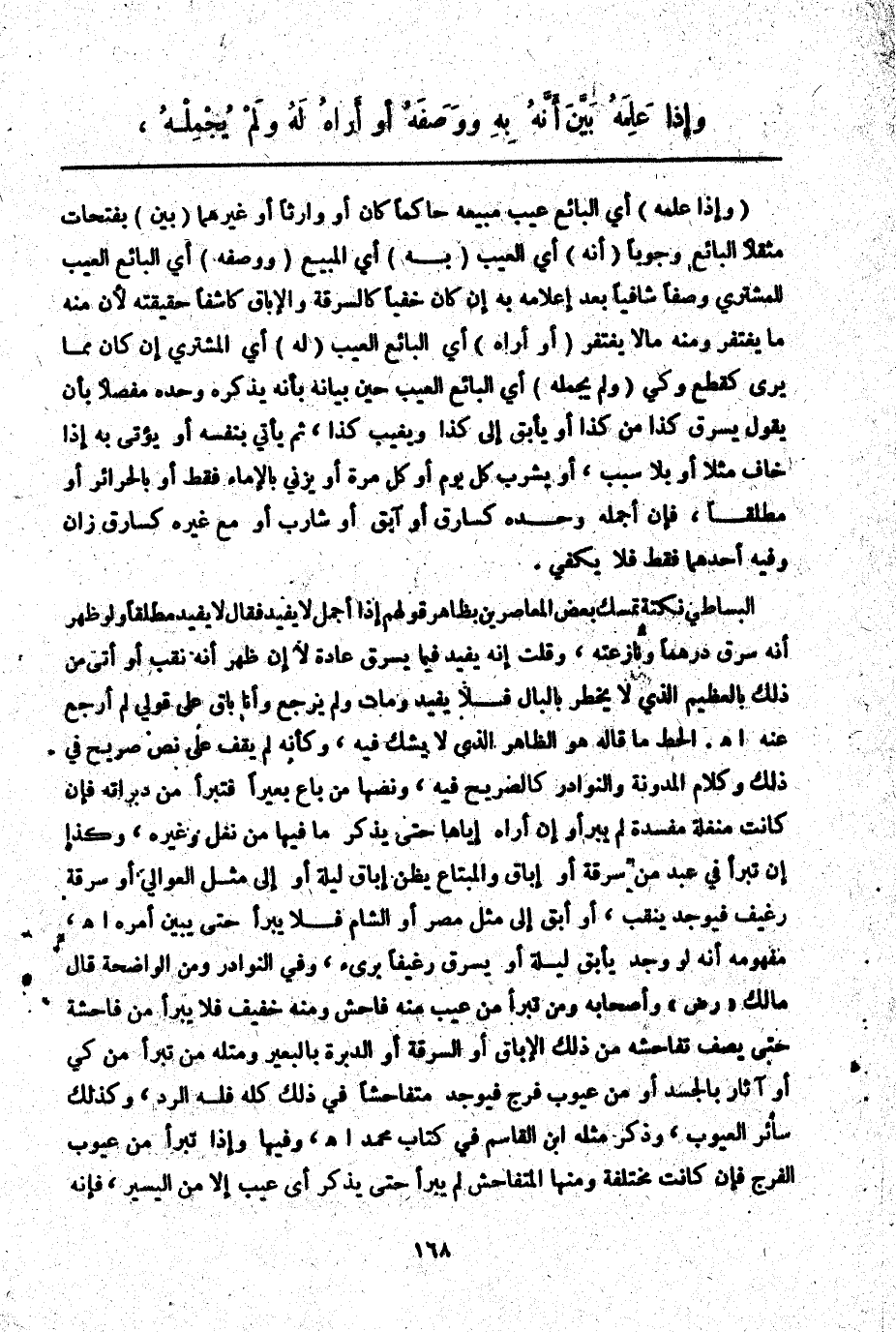 ـــــــــــــــــــــــــــــQوَإِذَا عَلِمَهُ) أَيْ الْبَائِعُ عَيْبَ مَبِيعِهِ حَاكِمًا كَانَ أَوْ وَارِثًا أَوْ غَيْرَهُمَا (بَيَّنَ) بِفَتَحَاتٍ مُثَقَّلًا الْبَائِعُ وُجُوبًا (أَنَّهُ) أَيْ الْعَيْبَ (بِهِ) أَيْ الْمَبِيعِ (وَوَصَفَهُ) أَيْ الْبَائِعُ الْعَيْبَ لِلْمُشْتَرِي وَصْفًا شَافِيًا بَعْدَ إعْلَامِهِ بِهِ إنْ كَانَ خَفِيًّا كَالسَّرِقَةِ وَالْإِبَاقِ كَاشِفًا حَقِيقَتَهُ لِأَنَّ مِنْهُ مَا يُغْتَفَرُ وَمِنْهُ مَا لَا يُغْتَفَرُ (أَوْ أَرَاهُ) أَيْ الْبَائِعُ الْعَيْبَ (لَهُ) أَيْ الْمُشْتَرِي إنْ كَانَ مِمَّا يُرَى كَقَطْعٍ وَكَيٍّ (وَلَمْ يُجْمِلْهُ) أَيْ الْبَائِعُ الْعَيْبَ حِينَ بَيَانِهِ بِأَنَّهُ يَذْكُرُهُ وَحْدَهُ مُفَصَّلًا بِأَنْ يَقُولَ: يَسْرِقُ كَذَا مِنْ كَذَا أَوْ يَأْبَقُ إلَى كَذَا وَيَغِيبُ كَذَا، ثُمَّ يَأْتِي بِنَفْسِهِ أَوْ يُؤْتَى بِهِ إذَا خَافَ مَثَلًا أَوْ بِلَا سَبَبٍ، أَوْ يَشْرَبُ كُلَّ يَوْمٍ أَوْ كُلَّ مَرَّةٍ أَوْ يَزْنِي بِالْإِمَاءِ فَقَطْ أَوْ بِالْحَرَائِرِ أَوْ مُطْلَقًا، فَإِنْ أَجْمَلَهُ وَحْدَهُ كَسَارِقٍ أَوْ آبِقٍ أَوْ شَارِبٍ أَوْ مَعَ غَيْرِهِ كَسَارِقٍ زَانٍ وَفِيهِ أَحَدُهُمَا فَقَطْ فَلَا يَكْفِي. الْبِسَاطِيُّ نُكْتَةٌ تَمَسَّكَ بَعْضُ الْمُعَاصِرِينَ بِظَاهِرِ قَوْلِهِمْ إذَا أَجْمَلَ لَا يُفِيدُ فَقَالَ: لَا يُفِيدُ مُطْلَقًا وَلَوْ ظَهَرَ أَنَّهُ سَرَقَ دِرْهَمًا وَنَازَعْتُهُ، وَقُلْت: إنَّهُ يُفِيدُ فِيمَا يَسْرِقُ عَادَةً لَا إنْ ظَهَرَ أَنَّهُ نَقَّبَ أَوْ أَتَى مِنْ ذَلِكَ بِالْعَظِيمِ الَّذِي لَا يَخْطُرُ بِالْبَالِ فَلَا يُفِيدُ وَمَاتَ وَلَمْ يَرْجِعْ وَأَنَا بَاقٍ عَلَى قَوْلِي لَمْ أَرْجِعْ عَنْهُ اهـ.