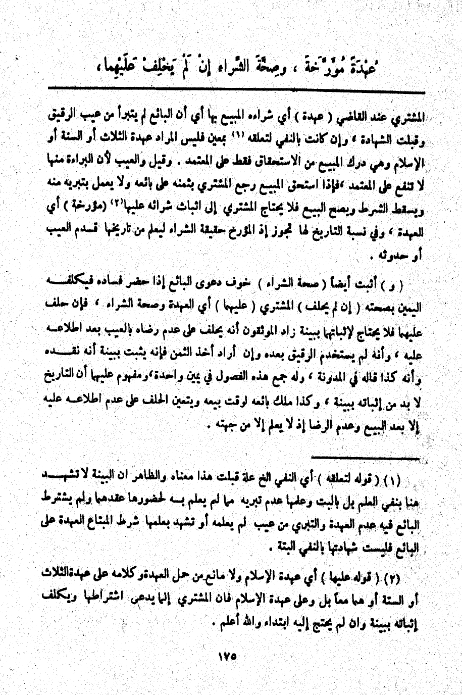 ـــــــــــــــــــــــــــــQالْمُشْتَرِي عِنْدَ الْقَاضِي (عُهْدَةً) أَيْ شِرَاءَهُ الْمَبِيعَ بِهَا أَيْ أَنَّ الْبَائِعَ لَمْ يَتَبَرَّأْ مِنْ عَيْبِ الرَّقِيقِ وَقُبِلَتْ الشَّهَادَةُ، وَإِنْ كَانَتْ بِالنَّفْيِ لِتَعَلُّقِهِ بِمُعَيَّنٍ فَلَيْسَ الْمُرَادُ عُهْدَةَ الثَّلَاثِ أَوْ السَّنَةِ أَوْ الْإِسْلَامِ وَهِيَ دَرْكُ الْمَبِيعِ مِنْ الِاسْتِحْقَاقِ فَقَطْ عَلَى الْمُعْتَمَدِ. وَقِيلَ: وَالْعَيْبُ لِأَنَّ الْبَرَاءَةَ مِنْهَا لَا تَنْفَعُ عَلَى الْمُعْتَمَدِ، فَإِذَا اسْتَحَقَّ الْمَبِيعَ رَجَعَ الْمُشْتَرِي بِثَمَنِهِ عَلَى بَائِعِهِ وَلَا يُعْمَلُ بِتَبَرِّيهِ مِنْهُ وَيَسْقُطُ الشَّرْطُ وَيَصِحُّ الْبَيْعُ فَلَا يَحْتَاجُ الْمُشْتَرِي إلَى إثْبَاتِ شِرَائِهِ عَلَيْهَا (مُؤَرَّخَةً) أَيْ الْعُهْدَةُ، وَفِي نِسْبَةِ التَّارِيخِ لَهَا تَجَوُّزٌ إذْ الْمُؤَرَّخُ حَقِيقَةً الشِّرَاءُ لِيُعْلَمَ مِنْ تَارِيخِهَا قِدَمُ الْعَيْبِ أَوْ حُدُوثُهُ. (وَ) أَثْبَتَ أَيْضًا (صِحَّةَ الشِّرَاءِ) خَوْفَ دَعْوَى الْبَائِعِ إذَا حَضَرَ فَسَادَهُ فَيُكَلِّفُهُ الْيَمِينَ بِصِحَّتِهِ (إنْ لَمْ يَحْلِفْ) الْمُشْتَرِي (عَلَيْهِمَا) أَيْ الْعُهْدَةِ وَصِحَّةِ الشِّرَاءِ، فَإِنْ حَلَفَ عَلَيْهِمَا فَلَا يَحْتَاجُ لِإِثْبَاتِهِمَا بِبَيِّنَةٍ، زَادَ الْمُوَثَّقُونَ أَنَّهُ يَحْلِفُ عَلَى عَدَمِ رِضَاهُ بِالْعَيْبِ بَعْدَ اطِّلَاعِهِ عَلَيْهِ، وَأَنَّهُ لَمْ يَسْتَخْدِمْ الرَّقِيقَ بَعْدَهُ وَإِنْ أَرَادَ أَخْذَ الثَّمَنِ فَإِنَّهُ يُثْبِتُ بِبَيِّنَةٍ أَنَّهُ نَقَدَهُ وَأَنَّهُ كَذَا قَالَهُ فِي الْمُدَوَّنَةِ، وَلَهُ جَمْعُ هَذِهِ الْفُصُولِ فِي يَمِينٍ وَاحِدَةٍ، وَمَفْهُومُ عَلَيْهِمَا أَنَّ التَّارِيخَ لَا بُدَّ مِنْ إثْبَاتِهِ بِبَيِّنَةٍ، وَكَذَا مِلْكُ بَائِعِهِ لِوَقْتِ بَيْعِهِ وَيَتَعَيَّنُ الْحَلِفُ عَلَى عَدَمِ اطِّلَاعِهِ عَلَيْهِ إلَّا بَعْدَ الْبَيْعِ وَعَدَمِ الرِّضَا إذْ لَا يُعْلَمُ إلَّا مِنْ جِهَتِهِ.