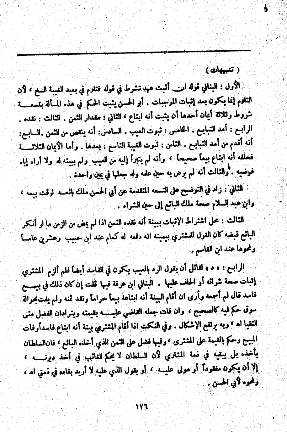 ـــــــــــــــــــــــــــــQتَنْبِيهَاتٌ) الْأَوَّلُ: الْبُنَانِيُّ قَوْلُهُ إنْ أَثْبَتَ عَهْدَ تَشَرُّطٍ فِي قَوْلِهِ فَتَلَوَّمَ فِي بَعِيدِ الْغَيْبَةِ إلَخْ لِأَنَّ التَّلَوُّمَ إنَّمَا يَكُونُ بَعْدَ إثْبَاتِ الْمُوجِبَاتِ. أَبُو الْحَسَنِ يَثْبُتُ الْحُكْمُ فِي هَذِهِ الْمَسْأَلَةِ بِتِسْعَةِ شُرُوطٍ وَثَلَاثَةِ أَيْمَانٍ أَحَدُهَا أَنْ يُثْبِتَ أَنَّهُ ابْتَاعَ، الثَّانِي: مِقْدَارُ الثَّمَنِ. الثَّالِثُ: نَقْدُهُ. الرَّابِعُ: أَمَدُ التَّبَايُعِ. الْخَامِسُ: ثُبُوتُ الْعَيْبِ. السَّادِسُ: أَنَّهُ يُنْقِصُ مِنْ الثَّمَنِ. السَّابِعُ: أَنَّهُ أَقْدَمُ مِنْ أَمَدِ التَّبَايُعِ. الثَّامِنُ: ثُبُوتُ الْغَيْبَةِ التَّاسِعُ: بُعْدُهَا. وَأَمَّا الْأَيْمَانُ الثَّلَاثَةُ فَحَلِفُهُ أَنَّهُ ابْتَاعَ بَيْعًا صَحِيحًا، وَأَنَّهُ لَمْ يَتَبَرَّأْ إلَيْهِ مِنْ الْعَيْبِ وَلَمْ يُبَيِّتْهُ لَهُ وَلَا أَرَاهُ إيَّاهُ فَرَضِيَهُ. وَالثَّالِثُ أَنَّهُ لَمْ يَرْضَ بِهِ حِينَ عَلِمَهُ وَلَهُ جَعْلُهَا فِي يَمِينٍ وَاحِدَةٍ. الثَّانِي: زَادَ فِي التَّوْضِيحِ عَلَى التِّسْعَةِ الْمُتَقَدِّمَةِ عَنْ أَبِي الْحَسَنِ مِلْكَ بَائِعُهُ لِوَقْتِ بَيْعِهِ وَابْنُ عَبْدِ السَّلَامِ صِحَّةَ مِلْكِ الْبَائِعِ إلَى حِينِ الشِّرَاءِ. الثَّالِثُ: مَحَلُّ اشْتِرَاطِ الْإِثْبَاتِ بِبَيِّنَةٍ أَنَّهُ نَقَدَهُ الثَّمَنَ إذَا لَمْ يَمْضِ مِنْ الزَّمَنِ مَا لَوْ أَنْكَرَ الْبَائِعُ قَبْضَهُ كَانَ الْقَوْلُ لِلْمُشْتَرِي بِيَمِينِهِ أَنَّهُ دَفَعَهُ لَهُ كَعَامٍ عِنْدَ ابْنِ حَبِيبٍ وَعِشْرِينَ عَامًا وَنَحْوِهَا عِنْدَ ابْنِ الْقَاسِمِ.