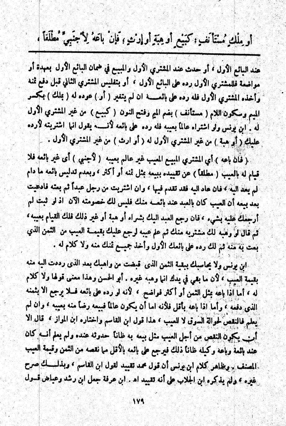 ـــــــــــــــــــــــــــــQعِنْدَ الْبَائِعِ الْأَوَّلِ، أَوْ حَدَثَ عِنْدَ الْمُشْتَرِي الْأَوَّلِ وَالْمَبِيعُ فِي ضَمَانِ الْبَائِعِ الْأَوَّلِ بِعُهْدَةٍ أَوْ مُوَاضَعَةٍ فَلِلْمُشْتَرِي الْأَوَّلِ رَدُّهُ عَلَى الْبَائِعِ الْأَوَّلِ، أَوْ بِتَفْلِيسِ الْمُشْتَرِي الثَّانِي قَبْلَ دَفْعِ ثَمَنِهِ وَأَخَذَهُ الْمُشْتَرِي الْأَوَّلُ فَلَهُ رَدُّهُ عَلَى بَائِعِهِ إنْ لَمْ يَتَغَيَّرْ (أَوْ) عَوْدُهُ لَهُ (بِمِلْكٍ) بِكَسْرِ الْمِيمِ وَسُكُونِ اللَّامِ (مُسْتَأْنَفٍ) بِضَمِّ الْمِيمِ وَفَتْحِ النُّونِ (كَبَيْعٍ) مِنْ غَيْرِ الْمُشْتَرِي الْأَوَّلِ لَهُ. ابْنُ يُونُسَ وَلَوْ اشْتَرَاهُ عَالِمًا بِعَيْبِهِ فَلَهُ رَدُّهُ عَلَى بَائِعِهِ لِأَنَّهُ يَقُولُ: إنَّمَا اشْتَرَيْتُهُ لِأَرُدَّهُ عَلَيْكَ (أَوْ هِبَةٍ) مِنْ غَيْرِ الْمُشْتَرِي الْأَوَّلِ لَهُ (أَوْ إرْثٍ) مِنْ غَيْرِ الْمُشْتَرِي الْأَوَّلِ.