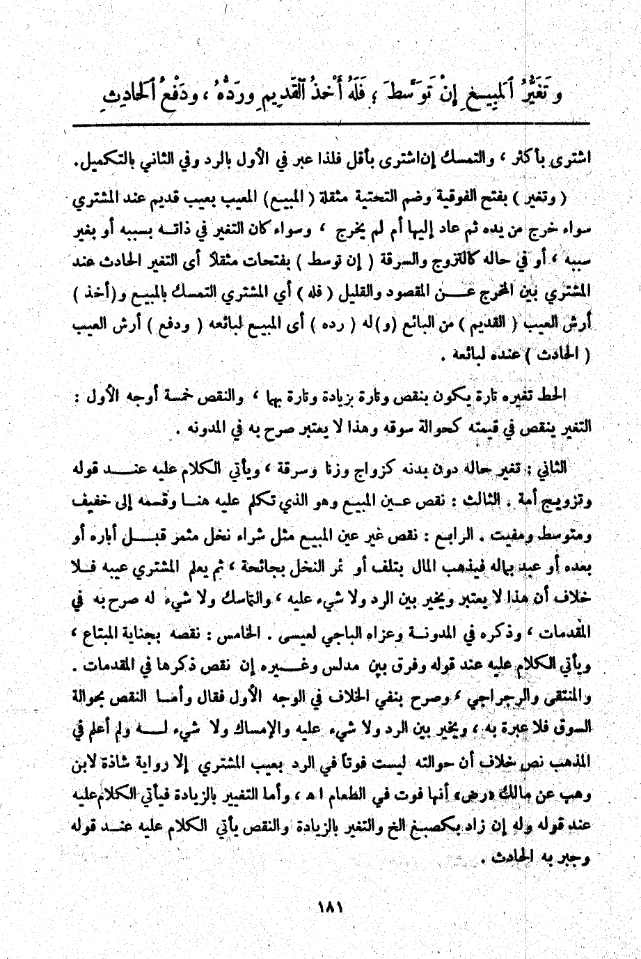 (وَتَغَيُّرُ) بِفَتْحِ الْفَوْقِيَّةِ وَضَمِّ التَّحْتِيَّةِ مُثَقَّلَةً (الْمَبِيعِ) الْمَعِيبِ بِعَيْبٍ قَدِيمٍ عِنْدَ الْمُشْتَرِي سَوَاءٌ خَرَجَ مِنْ يَدِهِ ثُمَّ عَادَ إلَيْهَا أَمْ لَمْ يَخْرُجْ، وَسَوَاءٌ كَانَ التَّغَيُّرُ فِي ذَاتِهِ بِسَبَبِهِ أَوْ بِغَيْرِ سَبَبِهِ، أَوْ فِي حَالِهِ كَالتَّزَوُّجِ وَالسَّرِقَةِ (إنْ تَوَسَّطَ) بِفَتَحَاتٍ مُثَقَّلًا أَيْ التَّغَيُّرُ الْحَادِثُ عِنْدَ الْمُشْتَرِي بَيْنَ الْمَخْرَجِ عَنْ الْمَقْصُودِ وَالْقَلِيلِ (فَلَهُ) أَيْ الْمُشْتَرِي التَّمَسُّكُ بِالْمَبِيعِ وَ (أَخْذُ) أَرْشِ الْعَيْبِ (الْقَدِيمِ) مِنْ الْبَائِعِ (وَ) لَهُ (رَدُّهُ) أَيْ الْمَبِيعِ لِبَائِعِهِ (وَدَفْعُ) أَرْشِ الْعَيْبِ (الْحَادِثِ) عِنْدَهُ لِبَائِعِهِ. الْحَطّ تَغَيُّرُهُ تَارَةً يَكُونُ بِنَقْصٍ وَتَارَةً بِزِيَادَةٍ وَتَارَةً بِهِمَا وَالنَّقْصُ خَمْسَةُ أَوْجُهٍ الْأَوَّلُ: التَّغَيُّرُ يُنْقِصُ فِي قِيمَتِهِ كَحَوَالَةِ سُوقِهِ وَهَذَا لَا يُعْتَبَرُ صَرَّحَ بِهِ فِي الْمُدَوَّنَةِ. الثَّانِي: تَغَيُّرُ حَالِهِ دُونَ بَدَنِهِ كَزَوَاجٍ وَزِنًا وَسَرِقَةٍ وَيَأْتِي الْكَلَامُ عَلَيْهِ عِنْدَ قَوْلِهِ وَتَزْوِيجُ أَمَةٍ. الثَّالِثُ: نَقْصُ عَيْنِ الْمَبِيعِ وَهُوَ الَّذِي تَكَلَّمَ عَلَيْهِ هُنَا وَقَسَّمَهُ إلَى خَفِيفٍ وَمُتَوَسِّطٍ وَمُفِيتٍ. الرَّابِعُ: نَقْصُ غَيْرِ عَيْنِ الْمَبِيعِ مِثْلُ شِرَاءِ نَخْلٍ مُثْمِرٍ قَبْلَ إبَارِهِ أَوْ بَعْدَهُ أَوْ عَبْدٍ بِمَالِهِ فَيَذْهَبُ الْمَالُ بِتَلَفٍ أَوْ ثَمَرُ النَّخْلِ بِجَائِحَةٍ، ثُمَّ يَعْلَمُ الْمُشْتَرِي عَيْبَهُ فَلَا خِلَافَ أَنَّ هَذَا لَا يُعْتَبَرُ وَيُخَيَّرُ بَيْنَ الرَّدِّ وَلَا شَيْءَ عَلَيْهِ، وَالتَّمَاسُكِ وَلَا شَيْءَ لَهُ صَرَّحَ بِهِ فِي الْمُقَدِّمَاتِ، وَذَكَرَهُ فِي الْمُدَوَّنَةِ وَعَزَاهُ الْبَاجِيَّ لِعِيسَى.