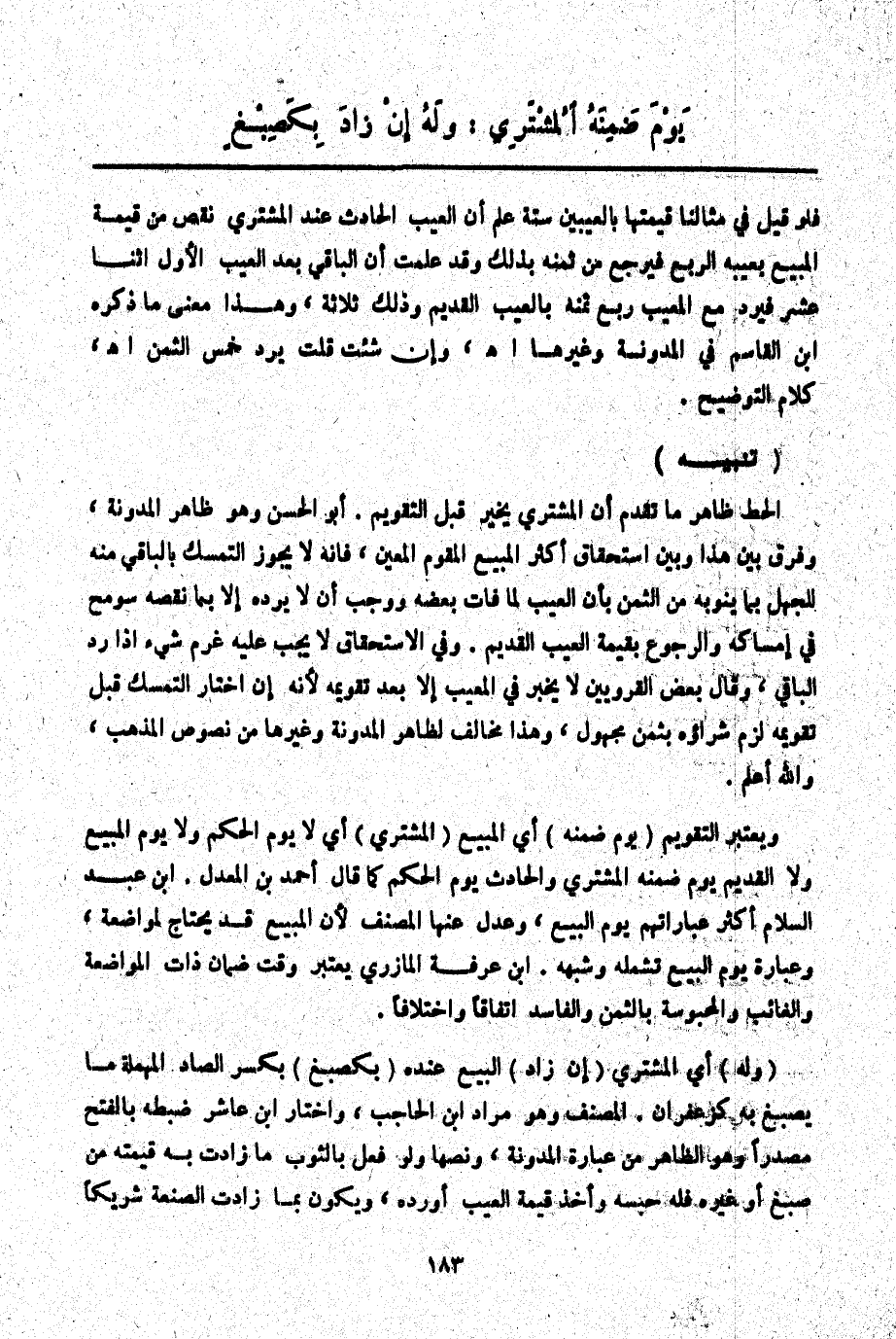 ـــــــــــــــــــــــــــــQفَلَوْ قِيلَ فِي مِثَالِنَا: قِيمَتُهَا بِالْعَيْبَيْنِ سِتَّةٌ عُلِمَ أَنَّ الْعَيْبَ الْحَادِثَ عِنْدَ الْمُشْتَرِي نَقَصَ مِنْ قِيمَةِ الْمَبِيعِ بِعَيْبِهِ الرُّبُعَ فَيَرْجِعُ مِنْ ثَمَنِهِ بِذَلِكَ وَقَدْ عَلِمْت أَنَّ الْبَاقِي بَعْدَ الْعَيْبِ الْأَوَّلِ اثْنَا عَشَرَ فَيَرُدُّ مَعَ الْمَعِيبِ رُبُعَ ثَمَنِهِ بِالْعَيْبِ الْقَدِيمِ وَذَلِكَ ثَلَاثَةٌ، وَهَذَا مَعْنَى مَا ذَكَرَهُ ابْنُ الْقَاسِمِ فِي الْمُدَوَّنَةِ وَغَيْرِهَا. اهـ. وَإِنْ شِئْت قُلْت يَرُدُّ خُمُسَ الثَّمَنِ. اهـ. كَلَامُ التَّوْضِيحِ.