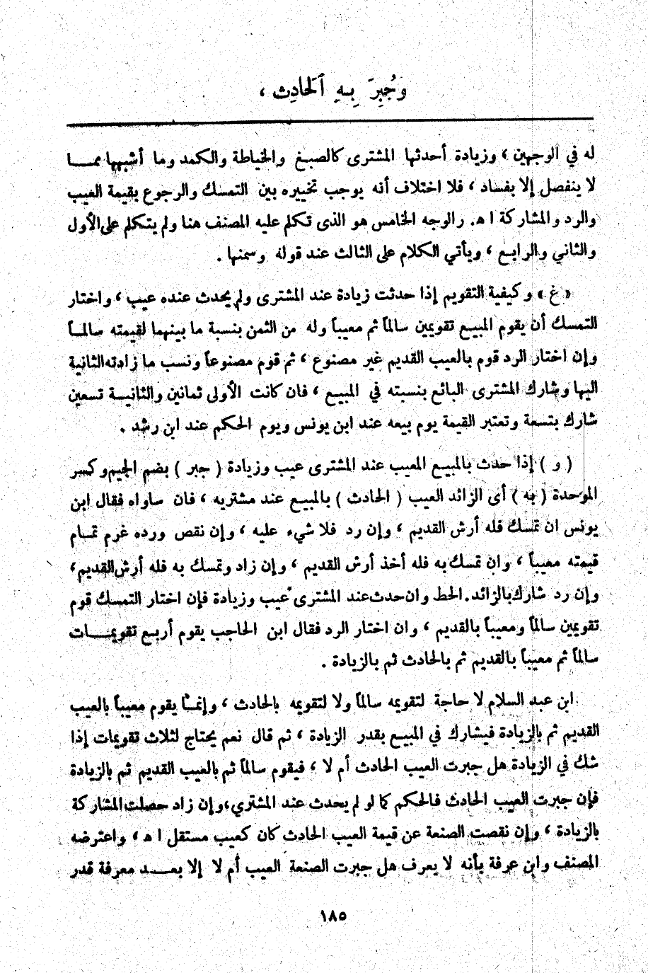ابْنُ عَبْدِ السَّلَامِ لَا حَاجَةَ لِتَقْوِيمِهِ سَالِمًا وَلَا لِتَقْوِيمِهِ بِالْحَادِثِ، وَإِنَّمَا يُقَوِّمُ مَعِيبًا بِالْعَيْبِ الْقَدِيمِ ثُمَّ بِالزِّيَادَةِ فَيُشَارِكُ فِي الْمَبِيعِ بِقَدْرِ الزِّيَادَةِ، ثُمَّ قَالَ: نَعَمْ يَحْتَاجُ لِثَلَاثِ تَقْوِيمَاتٍ إذَا شَكَّ فِي الزِّيَادَةِ هَلْ جَبَرَتْ الْعَيْبَ الْحَادِثَ أَمْ لَا، فَيُقَوِّمُ سَالِمًا ثُمَّ بِالْعَيْبِ الْقَدِيمِ ثُمَّ بِالزِّيَادَةِ فَإِنْ جَبَرَتْ الْعَيْبَ الْحَادِثَ فَالْحُكْمُ كَمَا لَوْ لَمْ يَحْدُثْ عِنْدَ الْمُشْتَرِي، وَإِنْ زَادَ حَصَلَتْ الْمُشَارَكَةُ بِالزِّيَادَةِ، وَإِنْ نَقَصَتْ الصَّنْعَةُ عَنْ قِيمَةِ الْعَيْبِ الْحَادِثِ كَانَ كَعَيْبٍ مُسْتَقِلٍّ. اهـ. وَاعْتَرَضَهُ الْمُصَنِّفُ وَابْنُ عَرَفَةَ بِأَنَّهُ لَا يَعْرِفُ هَلْ جَبَرَتْ الصَّنْعَةُ الْعَيْبَ أَمْ لَا إلَّا بَعْدَ مَعْرِفَةِ قَدْرِ
