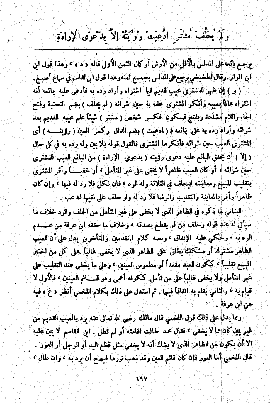 (وَ) إنْ ظَهَرَ لِلْمُشْتَرِي عَيْبٌ قَدِيمٌ فِيمَا اشْتَرَاهُ وَأَرَادَ رَدَّهُ بِهِ فَادَّعَى عَلَيْهِ بَائِعُهُ أَنَّهُ اشْتَرَاهُ عَالِمًا بِعَيْبِهِ وَأَنْكَرَ الْمُشْتَرِي عِلْمَهُ بِهِ حِينَ شِرَائِهِ (لَمْ يَحْلِفْ) بِضَمِّ التَّحْتِيَّةِ وَفَتْحِ الْحَاءِ وَاللَّامِ مُشَدَّدَةً وَبِفَتْحٍ فَسُكُونٍ فَكَسْرٍ شَخْصٌ (مُشْتَرٍ) شَيْئًا عَلِمَ عَيْبَهُ الْقَدِيمَ بَعْدَ شِرَائِهِ وَأَرَادَ رَدَّهُ بِهِ عَلَى بَائِعِهِ فَ (اُدُّعِيَتْ) بِضَمِّ الدَّالِ وَكَسْرِ الْعَيْنِ (رُؤْيَتُهُ) أَيْ الْمُشْتَرِي الْعَيْبَ حِينَ شِرَائِهِ فَأَنْكَرَهَا الْمُشْتَرِي فَالْقَوْلُ قَوْلُهُ بِلَا يَمِينٍ وَلَهُ رَدُّهُ بِهِ فِي كُلِّ حَالٍ (إلَّا) أَنْ يُحَقِّقَ الْبَائِعُ عَلَيْهِ دَعْوَى رُؤْيَتِهِ (بِدَعْوَى الْإِرَاءَةِ) مِنْ الْبَائِعِ الْعَيْبَ لِلْمُشْتَرِي حِينَ شِرَائِهِ، أَوْ كَانَ الْعَيْبُ ظَاهِرًا لَا يَخْفَى عَلَى غَيْرِ الْمُتَأَمِّلِ، أَوْ خَفِيًّا وَأَقَرَّ الْمُشْتَرِي بِتَقْلِيبِ الْمَبِيعِ وَمُعَايَنَتِهِ فَيَحْلِفُ فِي الثَّلَاثَةِ وَلَهُ الرَّدُّ، فَإِنْ نَكَلَ فَلَا رَدَّ لَهُ فِيهَا، وَإِنْ كَانَ ظَاهِرًا وَأَقَرَّ بِالْمُعَايَنَةِ وَالتَّقْلِيبِ وَالرِّضَا فَلَا رَدَّ لَهُ وَلَوْ حَلَفَ عَلَى نَفْيِهَا اهـ عِبْ.