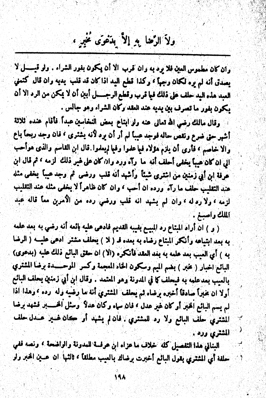 (وَ) إنْ أَرَادَ الْمُبْتَاعُ رَدَّ الْمَبِيعِ بِعَيْبِهِ الْقَدِيمِ فَادَّعَى عَلَيْهِ بَائِعُهُ أَنَّهُ رَضِيَ بِهِ بَعْدَ عِلْمِهِ بِهِ بَعْدَ ابْتِيَاعِهِ وَأَنْكَرَ الْمُبْتَاعُ رِضَاهُ بِهِ بَعْدَهُ فَ (لَا) يَحْلِفُ مُشْتَرٍ ادَّعَى عَلَيْهِ (الرِّضَا بِهِ) أَيْ الْعَيْبِ بَعْدَ عِلْمِهِ بِهِ بَعْدَ الْعَقْدِ فَأَنْكَرَهُ (إلَّا) إنْ حَقَّقَ الْبَائِعُ ذَلِكَ عَلَيْهِ (بِدَعْوَى) الْبَائِعِ إخْبَارَ (مُخْبِرٍ) بِضَمِّ الْمِيمِ وَسُكُونِ الْخَاءِ الْمُعْجَمَةِ وَكَسْرِ الْمُوَحَّدَةِ بِرِضَا الْمُشْتَرِي بِالْعَيْبِ بَعْدَ عِلْمِهِ بِهِ فَيَحْلِفُ كَمَا فِي الْمُدَوَّنَةِ وَهُوَ الْمُعْتَمَدُ. وَقَالَ ابْنُ أَبِي زَمَنِينَ: يَحْلِفُ الْبَائِعُ أَوَّلًا أَنَّ مُخْبِرًا صَادِقًا أَخْبَرَهُ بِرِضَاهُ ثُمَّ يَحْلِفُ الْمُشْتَرِي أَنَّهُ مَا رَضِيَهُ وَلَهُ رَدُّهُ، وَهَذَا إذَا لَمْ يُسَمِّ الْبَائِعُ الْمُخْبِرَ أَوْ كَانَ غَيْرَ عَدْلٍ، فَإِنْ سَمَّاهُ وَكَانَ عَدْلًا وَسُئِلَ الْمُخْبِرُ فَشَهِدَ بِرِضَا الْمُشْتَرِي حَلَفَ الْبَائِعُ وَلَا رَدَّ لِلْمُشْتَرِي. فَإِنْ لَمْ يَشْهَدْ أَوْ كَانَ غَيْرَ عَدْلٍ حَلَفَ الْمُشْتَرِي وَرَدَّ. الْبُنَانِيُّ هَذَا التَّفْصِيلَ كُلَّهُ خِلَافُ مَا عَزَاهُ ابْنُ عَرَفَةَ لِلْمُدَوَّنَةِ وَالْوَاضِحَةِ، وَنَصُّهُ فَفِي حَلِفِهِ أَيْ الْمُشْتَرِي بِقَوْلِ الْبَائِعِ أُخْبِرْت بِرِضَاكَ بِالْعَيْبِ مُطْلَقًا. ثَالِثُهَا إنْ عَيَّنَ الْمُخْبِرَ وَلَوْ