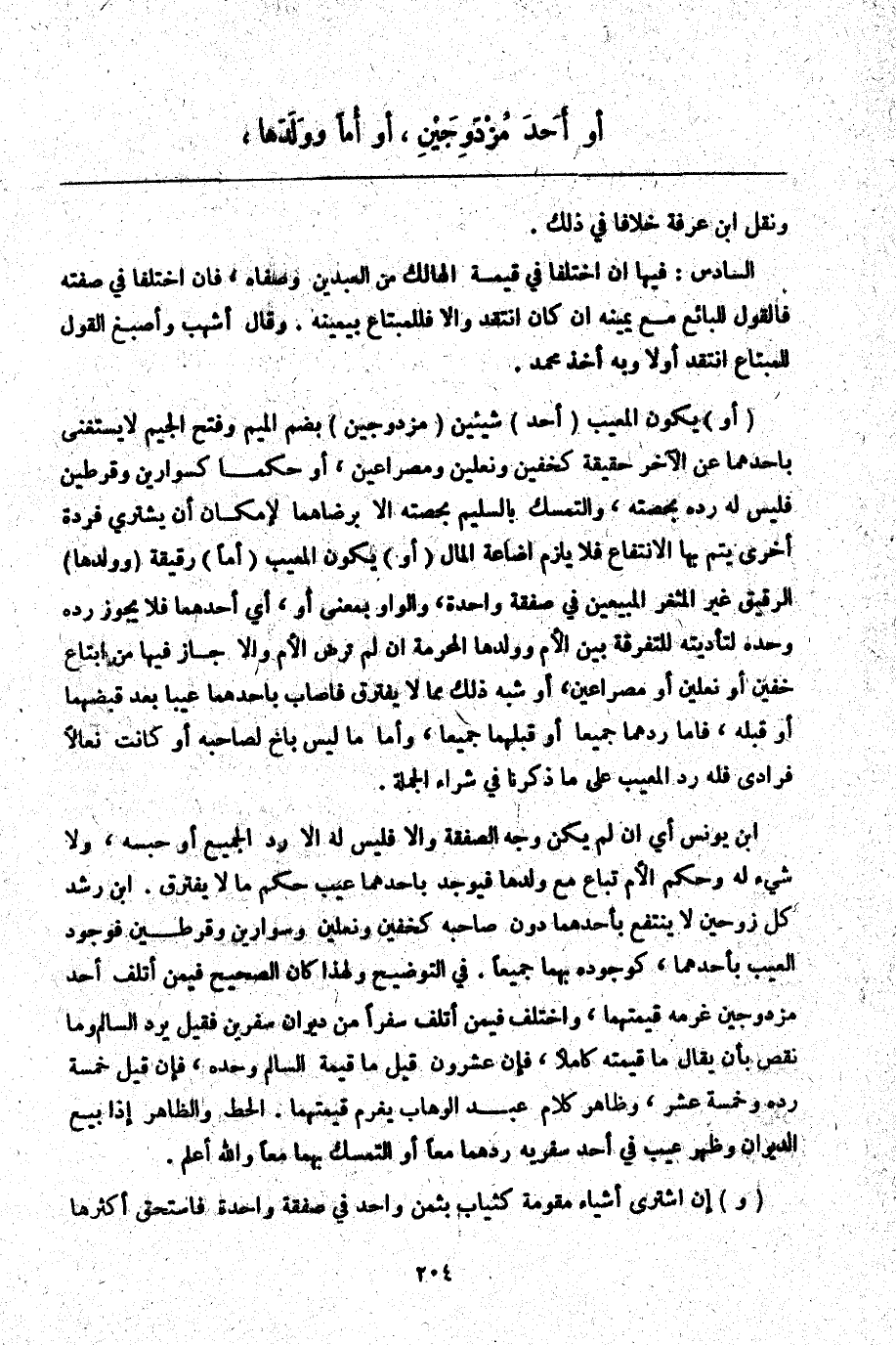 وَقَالَ أَشْهَبُ وَأَصْبَغُ: الْقَوْلُ لِلْمُبْتَاعِ انْتَقَدَ أَوْ لَا وَبِهِ أَخَذَ مُحَمَّدٌ. (أَوْ) يَكُونُ الْمَعِيبُ (أَحَدَ) شَيْئَيْنِ (مُزْدَوِجَيْنِ) بِضَمِّ الْمِيمِ وَفَتْحِ الْجِيمِ لَا يُسْتَغْنَى بِأَحَدِهِمَا عَنْ الْآخَرِ حَقِيقَةً كَخُفَّيْنِ وَنَعْلَيْنِ وَمِصْرَاعَيْنِ، أَوْ حُكْمًا كَسِوَارَيْنِ وَقُرْطَيْنِ فَلَيْسَ لَهُ رَدُّهُ بِحِصَّتِهِ، وَالتَّمَسُّكُ بِالسَّلِيمِ بِحِصَّتِهِ إلَّا بِرِضَاهُمَا لِإِمْكَانِ أَنْ يَشْتَرِيَ فَرِدَّةٌ أُخْرَى يَتِمُّ بِهَا الِانْتِفَاعُ فَلَا يَلْزَمُ إضَاعَةُ الْمَالِ (أَوْ) يَكُونُ الْمَعِيبُ (أُمًّا) رَقِيقَةً (وَوَلَدَهَا) الرَّقِيقَ غَيْرَ الْمُثْغِرِ الْمَبِيعَيْنِ فِي صَفْقَةٍ وَاحِدَةٍ، وَالْوَاوُ بِمَعْنَى أَوْ، أَيْ أَحَدُهُمَا فَلَا يَجُوزُ رَدُّهُ وَحْدَهُ لِتَأْدِيَتِهِ لِلتَّفْرِقَةِ بَيْنَ الْأُمِّ وَوَلَدِهَا الْمُحَرَّمَةِ إنْ لَمْ تَرْضَ الْأُمُّ وَإِلَّا جَازَ فِيهَا مَنْ ابْتَاعَ خُفَّيْنِ أَوْ نَعْلَيْنِ أَوْ مِصْرَاعَيْنِ، أَوْ شِبْهَ ذَلِكَ مِمَّا لَا يَفْتَرِقُ فَأَصَابَ بِأَحَدِهِمَا عَيْبًا بَعْدَ قَبْضِهِمَا أَوْ قَبْلَهُ، فَإِمَّا رَدَّهُمَا جَمِيعًا أَوْ قَبِلَهُمَا جَمِيعًا، وَأَمَّا مَا لَيْسَ بِأَخٍ لِصَاحِبِهِ أَوْ كَانَتْ نِعَالًا فُرَادَى فَلَهُ رَدُّ الْمَعِيبِ عَلَى مَا ذَكَرْنَا فِي شِرَاءِ الْجُمْلَةِ. ابْنُ يُونُسَ أَيْ إنْ لَمْ يَكُنْ وَجْهَ الصَّفْقَةِ وَإِلَّا فَلَيْسَ لَهُ إلَّا رَدُّ الْجَمِيعِ أَوْ حَبْسُهُ، وَلَا شَيْءَ لَهُ وَحُكْمُ الْأُمِّ تُبَاعُ مَعَ وَلَدِهَا فَيُوجَدُ بِأَحَدِهِمَا عَيْبٌ حُكْمُ مَا لَا يَفْتَرِقُ. ابْنُ رُشْدٍ كُلُّ زَوْجَيْنِ لَا يُنْتَفَعُ بِأَحَدِهِمَا دُونَ صَاحِبِهِ كَخُفَّيْنِ وَنَعْلَيْنِ وَسِوَارَيْنِ وَقُرْطَيْنِ فَوُجُودُ الْعَيْبِ بِأَحَدِهِمَا كَوُجُودِهِ بِهِمَا جَمِيعًا.