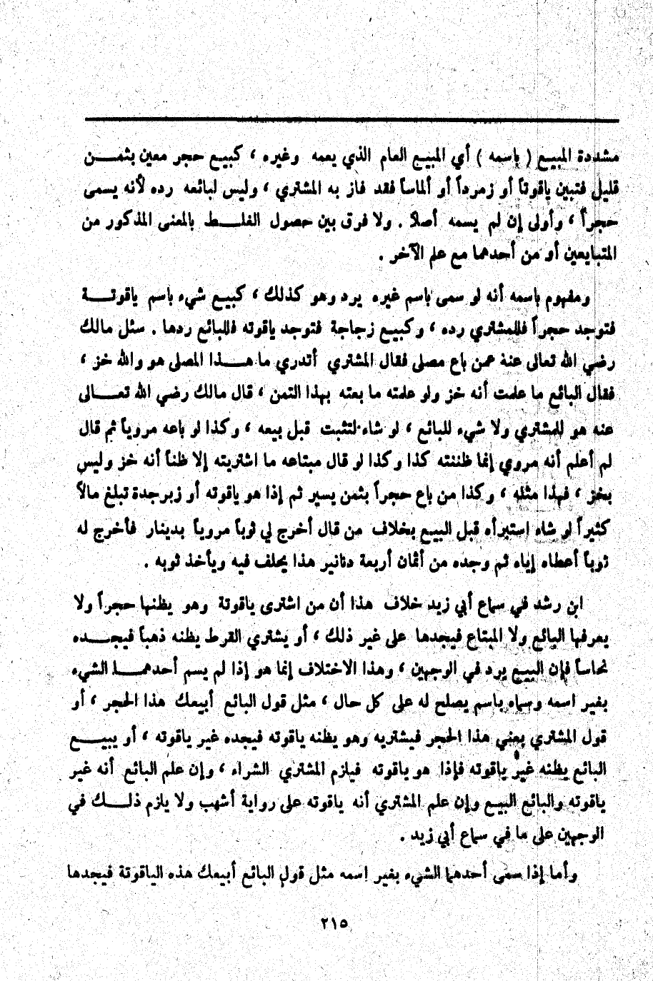 ـــــــــــــــــــــــــــــQمُشَدَّدَةً الْمَبِيعُ (بِاسْمِهِ) أَيْ الْمَبِيعِ الْعَامِّ الَّذِي يَعُمُّهُ وَغَيْرُهُ، كَبَيْعِ حَجَرٍ مُعَيَّنٍ بِثَمَنٍ قَلِيلٍ فَتَبَيَّنَ يَاقُوتًا أَوْ زُمُرُّدًا أَوْ أَلْمَاسًا فَقَدْ فَازَ بِهِ الْمُشْتَرِي، وَلَيْسَ لِبَائِعِهِ رَدُّهُ لِأَنَّهُ يُسَمَّى حَجَرًا وَأَوْلَى إنْ لَمْ يُسَمِّهِ أَصْلًا. وَلَا فَرْقَ بَيْنَ حُصُولِ الْغَلَطِ بِالْمَعْنَى الْمَذْكُورِ مِنْ الْمُتَبَايِعَيْنِ أَوْ مِنْ أَحَدِهِمَا مَعَ عِلْمِ الْآخَرِ وَمَفْهُومُ بِاسْمِهِ أَنَّهُ لَوْ سُمِّيَ بِاسْمِ غَيْرِهِ يُرَدُّ وَهُوَ كَذَلِكَ، كَبَيْعِ شَيْءٍ بِاسْمِ يَاقُوتَةٍ فَتُوجَدُ حَجَرًا فَلِلْمُشْتَرِي رَدُّهُ، وَكَبَيْعِ زُجَاجَةٍ فَتُوجَدُ يَاقُوتَةً فَلِلْبَائِعِ رَدُّهَا.