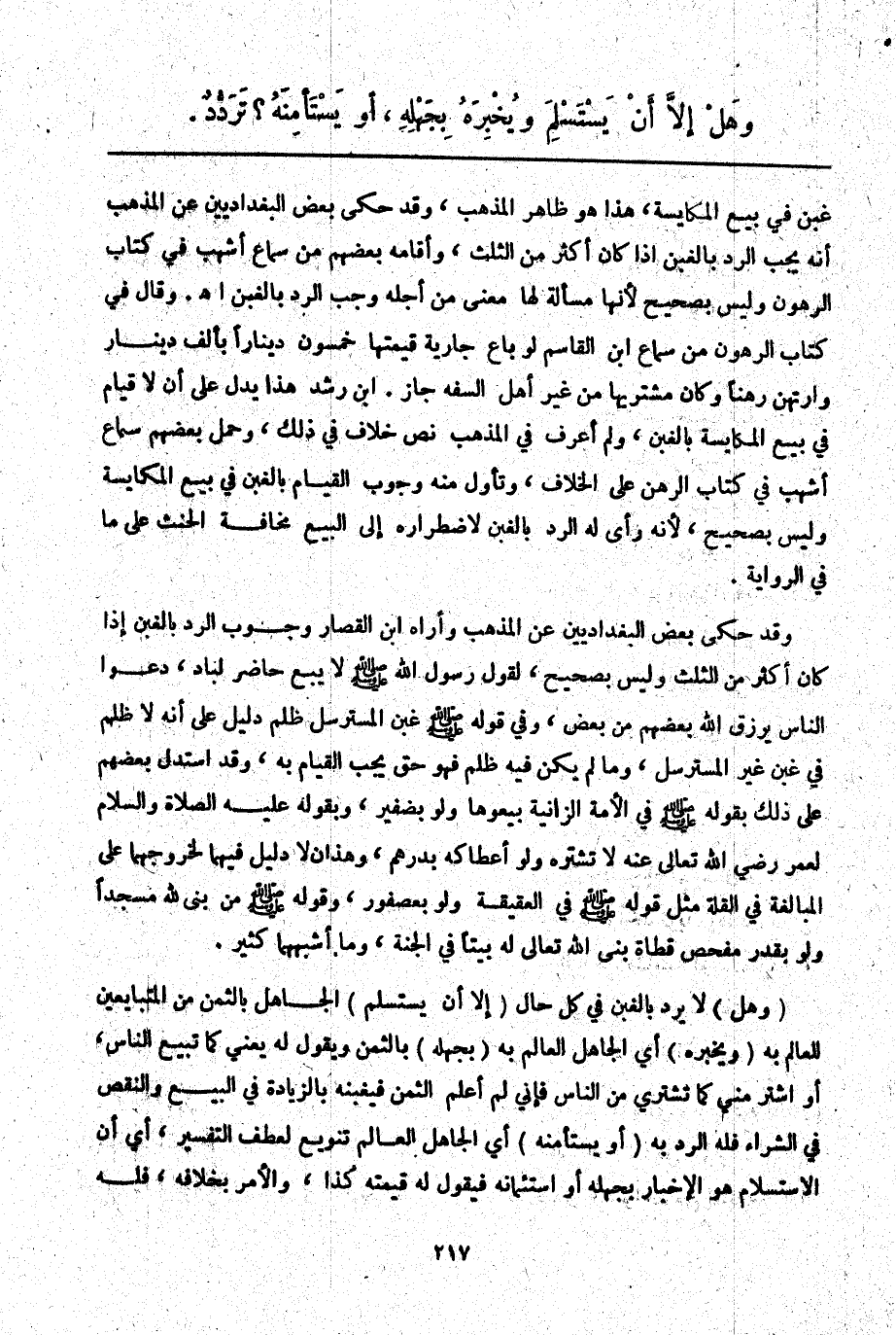 ابْنُ رُشْدٍ هَذَا يَدُلُّ عَلَى أَنْ لَا قِيَامَ فِي بَيْعِ الْمُكَايَسَةِ بِالْغَبْنِ، وَلَمْ أَعْرِفْ فِي الْمَذْهَبِ نَصَّ خِلَافٍ فِي ذَلِكَ، وَحَمَلَ بَعْضُهُمْ سَمَاعَ أَشْهَبَ فِي كِتَابِ الرَّهْنِ عَلَى الْخِلَافِ، وَتَأَوَّلَ مِنْهُ وُجُوبَ الْقِيَامِ بِالْغَبْنِ فِي بَيْعِ الْمُكَايَسَةِ وَلَيْسَ بِصَحِيحٍ لِأَنَّهُ رَأَى لَهُ الرَّدَّ بِالْغَبْنِ لِاضْطِرَارِهِ إلَى الْبَيْعِ مَخَافَةَ الْحِنْثِ عَلَى مَا فِي الرِّوَايَةِ. وَقَدْ حَكَى بَعْضُ الْبَغْدَادِيِّينَ عَنْ الْمَذْهَبِ وَأَرَاهُ ابْنَ الْقَصَّارِ وُجُوبَ الرَّدِّ بِالْغَبْنِ إذَا كَانَ أَكْثَرَ مِنْ الثُّلُثِ وَلَيْسَ بِصَحِيحٍ، لِقَوْلِ رَسُولِ اللَّهِ - صَلَّى اللَّهُ عَلَيْهِ وَسَلَّمَ - «لَا يَبِعْ حَاضِرٌ لِبَادٍ، دَعُوا النَّاسَ يَرْزُقُ اللَّهُ بَعْضَهُمْ مِنْ بَعْضٍ» ، وَفِي قَوْلِهِ - صَلَّى اللَّهُ عَلَيْهِ وَسَلَّمَ - «غَبْنُ الْمُسْتَرْسِلِ ظُلْمٌ» دَلِيلٌ عَلَى أَنَّهُ لَا ظُلْمَ فِي غَبْنِ غَيْرِ الْمُسْتَرْسِلِ، وَمَا لَمْ يَكُنْ فِيهِ ظُلْمٌ فَهُوَ حَقٌّ يَجِبُ الْقِيَامُ بِهِ، وَقَدْ اسْتَدَلَّ بَعْضُهُمْ عَلَى ذَلِكَ بِقَوْلِهِ - صَلَّى اللَّهُ عَلَيْهِ وَسَلَّمَ - فِي الْأَمَةِ الزَّانِيَةِ «بِيعُوهَا وَلَوْ بِضَفِيرٍ» ، «وَبِقَوْلِهِ - عَلَيْهِ الصَّلَاةُ وَالسَّلَامُ - لِعُمَرَ - رَضِيَ اللَّهُ تَعَالَى عَنْهُ - لَا تَشْتَرِهِ وَلَوْ أَعْطَاكَهُ بِدِرْهَمٍ» ، وَهَذَانِ لَا دَلِيلَ فِيهِمَا لِخُرُوجِهِمَا عَلَى الْمُبَالَغَةِ فِي الْقِلَّةِ مِثْلُ قَوْلِهِ - صَلَّى اللَّهُ عَلَيْهِ وَسَلَّمَ - فِي الْعَقِيقَةِ وَلَوْ بِعُصْفُورٍ، وَقَوْلِهِ - صَلَّى اللَّهُ عَلَيْهِ وَسَلَّمَ - «مَنْ بَنَى لِلَّهِ مَسْجِدًا وَلَوْ بِقَدْرِ مَفْحَصِ قَطَاةٍ بَنَى اللَّهُ تَعَالَى لَهُ بَيْتًا فِي الْجَنَّةِ» ، وَمَا أَشْبَهَهُمَا كَثِيرٌ.