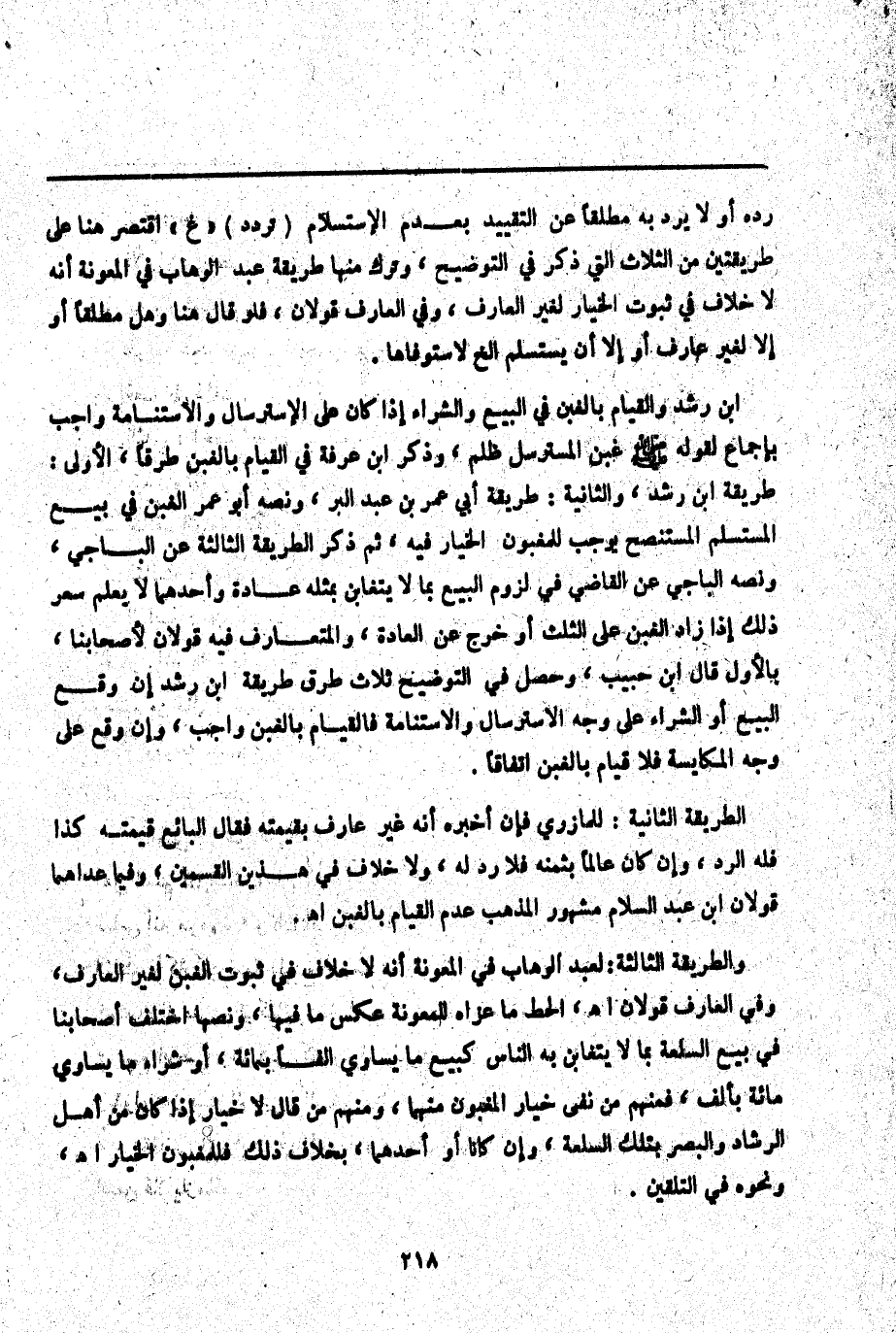ـــــــــــــــــــــــــــــQرَدُّهُ أَوْ لَا يُرَدُّ بِهِ مُطْلَقًا عَنْ التَّقْيِيدِ بِعَدَمِ الِاسْتِسْلَامِ (تَرَدُّدٌ) " غ " اقْتَصَرَ هُنَا عَلَى طَرِيقَتَيْنِ مِنْ الثَّلَاثِ الَّتِي ذَكَرَ فِي التَّوْضِيحِ، وَتَرَكَ مِنْهَا طَرِيقَةَ عَبْدِ الْوَهَّابِ فِي الْمَعُونَةِ أَنَّهُ لَا خِلَافَ فِي ثُبُوتِ الْخِيَارِ لِغَيْرِ الْعَارِفِ، وَفِي الْعَارِفِ قَوْلَانِ، فَلَوْ قَالَ هُنَا: وَهَلْ مُطْلَقًا أَوْ إلَّا لِغَيْرِ عَارِفٍ أَوْ إلَّا أَنْ يَسْتَسْلِمَ إلَخْ لَاسْتَوْفَاهَا ابْنُ رُشْدٍ وَالْقِيَامُ بِالْغَبْنِ فِي الْبَيْعِ وَالشِّرَاءِ إذَا كَانَ عَلَى الِاسْتِرْسَالِ وَالِاسْتِنَامَةِ وَاجِبٌ بِإِجْمَاعٍ لِقَوْلِهِ - صَلَّى اللَّهُ عَلَيْهِ وَسَلَّمَ - غَبْنُ الْمُسْتَرْسِلِ ظُلْمٌ.