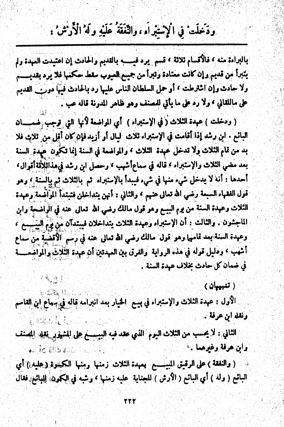 ـــــــــــــــــــــــــــــQبِالْبَرَاءَةِ مِنْهُ، فَالْأَقْسَامُ ثَلَاثَةٌ، قِسْمٌ يَرُدُّ فِيهِ بِالْقَدِيمِ وَالْحَادِثِ إنْ اُعْتِيدَتْ الْعُهْدَةُ وَلَمْ يَتَبَرَّأْ مِنْ قَدِيمٍ وَإِنْ كَانَتْ مُعْتَادَةً وَتَبَرَّأَ مِنْ جَمِيعِ الْعُيُوبِ سَقَطَ حُكْمُهَا فَلَا يَرُدُّ بِقَدِيمٍ وَلَا حَادِثٍ وَإِنْ اُشْتُرِطَتْ، أَوْ حَمَلَ السُّلْطَانُ النَّاسَ عَلَيْهَا رَدَّ بِالْحَادِثِ فِيهَا دُونَ الْقَدِيمِ عَلَى مَا لِلَّقَانِيِّ، وَلَا رَدَّ عَلَى مَا يَأْتِي لِلْمُصَنِّفِ وَهُوَ ظَاهِرُ الْمُدَوَّنَةِ قَالَهُ عِبْ. (وَدَخَلَتْ) عُهْدَةُ الثَّلَاثِ (فِي الِاسْتِبْرَاءِ) أَيْ الْمُوَاضَعَةِ لِأَنَّهَا الَّتِي تُوجِبُ ضَمَانَ الْبَائِعِ. ابْنُ رُشْدٍ إذَا أَقَامَتْ فِي الِاسْتِبْرَاءِ ثَلَاثَ لَيَالٍ أَوْ أَزْيَدَ فَإِنْ كَانَ أَقَلَّ مِنْ ثَلَاثٍ فَلَا بُدَّ مِنْ تَمَامِ الثَّلَاثِ وَلَا تَدْخُلُ عُهْدَةُ الثَّلَاثِ، وَالْمُوَاضَعَةُ فِي السَّنَةِ إنَّمَا تَكُونُ عُهْدَةُ السَّنَةِ بَعْدَ مُضِيِّ الثَّلَاثِ وَالِاسْتِبْرَاءِ، قَالَهُ فِي سَمَاعِ أَشْهَبَ، وَحَصَّلَ ابْنُ رُشْدٍ فِي هَذَا ثَلَاثَةَ أَقْوَالٍ، أَحَدُهَا: أَنَّهُ لَا يَدْخُلُ شَيْءٌ مِنْهَا فِي شَيْءٍ فَيَبْدَأُ بِالِاسْتِبْرَاءِ ثُمَّ بِالثَّلَاثِ ثُمَّ بِالسَّنَةِ، وَهُوَ قَوْلُ الْفُقَهَاءِ السَّبْعَةِ - رَضِيَ اللَّهُ تَعَالَى عَنْهُمْ -، وَالثَّانِي: أَنَّهُنَّ يُتَدَاخَلْنَ فَتُبْتَدَأُ الْمُوَاضَعَةُ وَعُهْدَةُ الثَّلَاثِ وَعُهْدَةُ السَّنَةِ مِنْ يَوْمِ الْبَيْعِ وَهُوَ قَوْلُ مَالِكٍ - رَضِيَ اللَّهُ تَعَالَى عَنْهُ - فِي الْوَاضِحَةِ وَابْنِ الْمَاجِشُونِ.