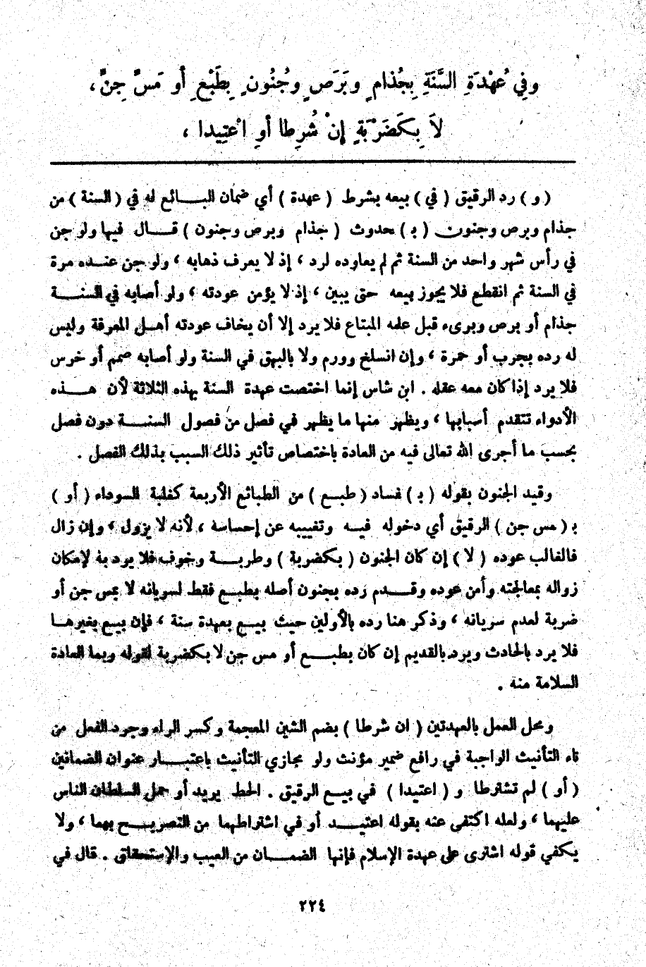 ـــــــــــــــــــــــــــــQ (وَ) رُدَّ الرَّقِيقُ (فِي) بَيْعِهِ بِشَرْطِ (عُهْدَةِ) أَيْ ضَمَانِ الْبَائِعِ لَهُ فِي (السَّنَةِ) مِنْ جُذَامٍ وَبَرَصٍ وَجُنُونٍ (بِ) حُدُوثِ (جُذَامٍ وَبَرَصٍ وَجُنُونٍ) قَالَ فِيهَا: وَلَوْ جُنَّ فِي رَأْسِ شَهْرٍ وَاحِدٍ مِنْ السَّنَةِ ثُمَّ لَمْ يُعَاوِدْهُ لَرُدَّ، إذْ لَا يُعْرَفُ ذَهَابُهُ، وَلَوْ جُنَّ عِنْدَهُ مَرَّةً فِي السَّنَةِ ثُمَّ انْقَطَعَ فَلَا يَجُوزُ بَيْعُهُ حَتَّى يُبَيِّنَ إذْ لَا يُؤْمَنُ عَوْدَتُهُ، وَلَوْ أَصَابَهُ فِي السَّنَةِ جُذَامٌ أَوْ بَرَصٌ وَبَرِئَ قَبْلَ عِلْمِهِ الْمُبْتَاعَ فَلَا يُرَدُّ إلَّا أَنْ يَخَافَ عُودَتَهُ أَهْلُ الْمَعْرِفَةِ وَلَيْسَ لَهُ رَدُّهُ بِجَرَبٍ أَوْ حُمْرَةٍ، وَإِنْ انْسَلَخَ وَوَرِمَ وَلَا بِالْبَهَقِ فِي السَّنَةِ وَلَوْ أَصَابَهُ صَمَمٌ أَوْ خَرَسٌ فَلَا يُرَدُّ إذَا كَانَ مَعَهُ عَقْلُهُ. ابْنُ شَاسٍ إنَّمَا اخْتَصَّتْ عُهْدَةُ السَّنَةِ بِهَذِهِ الثَّلَاثَةِ لِأَنَّ هَذِهِ الْأَدْوَاءَ تَتَقَدَّمُ أَسْبَابُهَا، وَيَظْهَرُ مِنْهَا مَا يَظْهَرُ فِي فَصْلٍ مِنْ فُصُولِ السَّنَةِ دُونَ فَصْلٍ بِحَسَبِ مَا أَجْرَى اللَّهُ تَعَالَى فِيهِ مِنْ الْعَادَةِ بِاخْتِصَاصِ تَأْثِيرِ ذَلِكَ السَّبَبِ بِذَلِكَ الْفَصْلِ. وَقَيَّدَ الْجُنُونَ بِقَوْلِهِ (بِ) فَسَادِ (طَبْعٍ) مِنْ الطَّبَائِعِ الْأَرْبَعَةِ كَغَلَبَةِ السَّوْدَاءِ (أَوْ) بِ (مَسِّ جِنٍّ) الرَّقِيقَ أَيْ دُخُولِهِ فِيهِ وَتَغْيِيبِهِ عَنْ إحْسَاسِهِ لِأَنَّهُ لَا يَزُولُ، وَإِنْ زَالَ فَالْغَالِبُ عَوْدُهُ (لَا) إنْ كَانَ الْجُنُونُ (بِكَضَرْبَةٍ) وَطَرِبَةٍ وَخَوْفٍ فَلَا يُرَدُّ بِهِ لِإِمْكَانِ زَوَالِهِ بِمُعَالَجَتِهِ وَأَمْنِ عَوْدِهِ وَقَدَّمَ رَدَّهُ بِجُنُونٍ أَصْلُهُ بِطَبْعٍ فَقَطْ لِسَرَيَانِهِ لَا بِمَسِّ جِنٍّ أَوْ ضَرْبَةٍ لِعَدَمِ سَرَيَانِهِ، وَذَكَرَ هُنَا رَدَّهُ بِالْأَوَّلِينَ حَيْثُ بِيعَ بِعُهْدَةِ سَنَةٍ، فَإِنْ بِيعَ بِغَيْرِهَا فَلَا يُرَدُّ بِالْحَادِثِ وَيُرَدُّ بِالْقَدِيمِ إنْ كَانَ بِطَبْعٍ أَوْ مَسِّ جِنٍّ لَا بِكَضَرْبَةٍ لِقَوْلِهِ وَبِمَا الْعَادَةُ السَّلَامَةُ مِنْهُ.