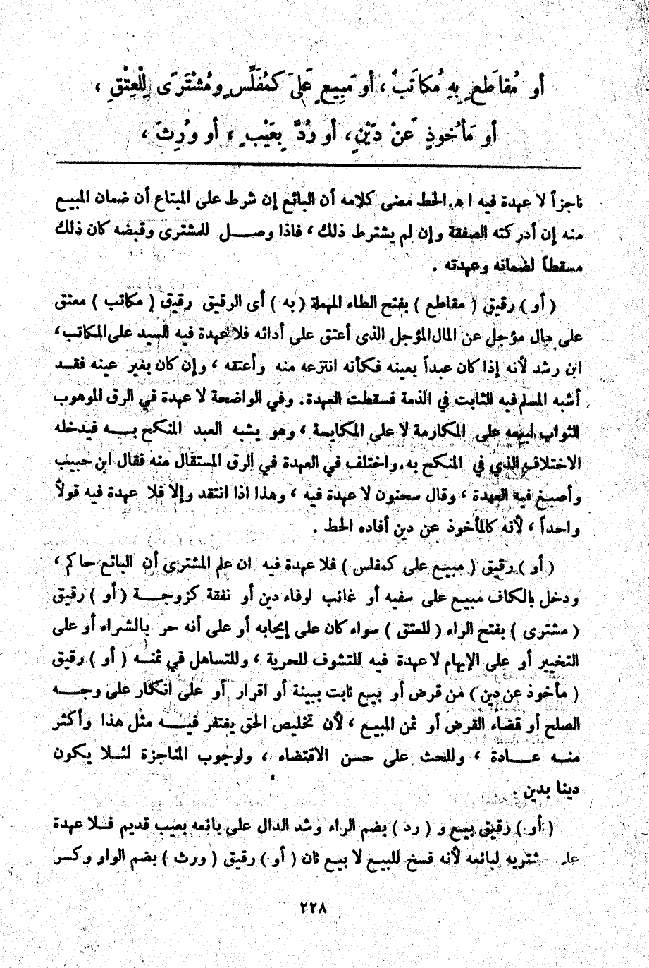 مَعْنَى كَلَامِهِ أَنَّ الْبَائِعَ إنْ شَرَطَ عَلَى الْمُبْتَاعِ أَنَّ ضَمَانَ الْمَبِيعِ مِنْهُ إنْ أَدْرَكَتْهُ الصَّفْقَةُ وَإِنْ لَمْ يَشْتَرِطْ ذَلِكَ، فَإِذَا وَصَلَ لِلْمُشْتَرَى وَقَبَضَهُ كَانَ ذَلِكَ مُسْقِطًا لِضَمَانِهِ وَعُهْدَتِهِ (أَوْ) رَقِيقٍ (مُقَاطَعٍ) بِفَتْحِ الطَّاءِ الْمُهْمَلَةِ (بِهِ) أَيْ الرَّقِيقِ رَقِيقٌ (مُكَاتَبٌ) مُعْتَقٌ عَلَى مَالٍ مُؤَجَّلٍ عَنْ الْمَالِ الْمُؤَجَّلِ الَّذِي أُعْتِقَ عَلَى أَدَائِهِ فَلَا عُهْدَةَ فِيهِ لِلسَّيِّدِ عَلَى الْمُكَاتَبِ ابْنُ رُشْدٍ لِأَنَّهُ إذَا كَانَ عَبْدًا بِعَيْنِهِ فَكَأَنَّهُ انْتَزَعَهُ مِنْهُ وَأَعْتَقَهُ، وَإِنْ كَانَ بِغَيْرِ عَيْنِهِ فَقَدْ أَشْبَهَ الْمُسْلَمَ فِيهِ الثَّابِتَ فِي الذِّمَّةِ فَسَقَطَتْ الْعُهْدَةُ وَفِي الْوَاضِحَةِ لَا عُهْدَةَ فِي الرِّقِّ الْمَوْهُوبِ لِلثَّوَابِ لِبَيْعِهِ عَلَى الْمُكَارَمَةِ لَا عَلَى الْمُكَايَسَةِ، وَهُوَ يُشْبِهُ الْعَبْدَ الْمُنْكَحَ بِهِ فَيَدْخُلُهُ الِاخْتِلَافُ الَّذِي فِي الْمُنْكَحِ بِهِ وَاخْتُلِفَ فِي الْعُهْدَةِ فِي الرِّقِّ الْمُسْتَقَالِ مِنْهُ فَقَالَ ابْنُ حَبِيبٍ وَأَصْبَغُ: فِيهِ الْعُهْدَةُ، وَقَالَ سَحْنُونٌ: لَا عُهْدَةَ فِيهِ، وَهَذَا إذَا انْتَقَدَ وَإِلَّا فَلَا عُهْدَةَ فِيهِ قَوْلًا وَاحِدًا لِأَنَّهُ كَالْمَأْخُوذِ عَنْ دَيْنٍ أَفَادَهُ الْحَطّ (أَوْ) رَقِيقٍ (مَبِيعٍ عَلَى كَمُفَلِّسٍ) فَلَا عُهْدَةَ فِيهِ إنْ عَلِمَ الْمُشْتَرِي أَنَّ الْبَائِعَ حَاكِمٌ، وَدَخَلَ بِالْكَافِ مَبِيعٌ عَلَى سَفِيهٍ أَوْ غَالِبٍ لِوَفَاءِ دَيْنٍ أَوْ نَفَقَةٍ كَزَوْجَةٍ (أَوْ) رَقِيقٍ (مُشْتَرًى) بِفَتْحِ الرَّاءِ (لِلْعِتْقِ) سَوَاءٌ كَانَ عَلَى إيجَابِهِ أَوْ عَلَى أَنَّهُ حُرٌّ بِالشِّرَاءِ أَوْ عَلَى التَّخْيِيرِ أَوْ عَلَى الْإِبْهَامِ لَا عُهْدَةَ فِيهِ لِلتَّشَوُّفِ لِلْحُرِّيَّةِ، وَلِلتَّسَاهُلِ فِي ثَمَنِهِ (أَوْ) رَقِيقٍ (مَأْخُوذٍ عَنْ دَيْنٍ) مِنْ قَرْضٍ أَوْ بَيْعٍ ثَابِتٍ بِبَيِّنَةٍ أَوْ إقْرَارٍ أَوْ عَلَى إنْكَارٍ عَلَى وَجْهِ الصُّلْحِ أَوْ قَضَاءِ الْقَرْضِ أَوْ ثَمَنِ الْمَبِيعِ لِأَنَّ تَخْلِيصَ الْحَقِّ يُغْتَفَرُ فِيهِ مِثْلُ هَذَا وَأَكْثَرُ مِنْهُ عَادَةً، وَلِلْحَثِّ عَلَى حُسْنِ الِاقْتِضَاءِ، وَلِوُجُوبِ الْمُنَاجَزَةِ لِئَلَّا يَكُونَ دَيْنًا بِدَيْنِ (أَوْ) رَقِيقٍ بِيعَ وَ (رُدَّ) بِضَمِّ الرَّاءِ وَشَدِّ الدَّالِ عَلَى بَائِعِهِ بِعَيْبٍ قَدِيمٍ فَلَا عُهْدَةَ عَلَى مُشْتَرِيهِ لِبَائِعِهِ لِأَنَّهُ فَسْخٌ لِلْبَيْعِ لَا بَيْعٌ ثَانٍ.