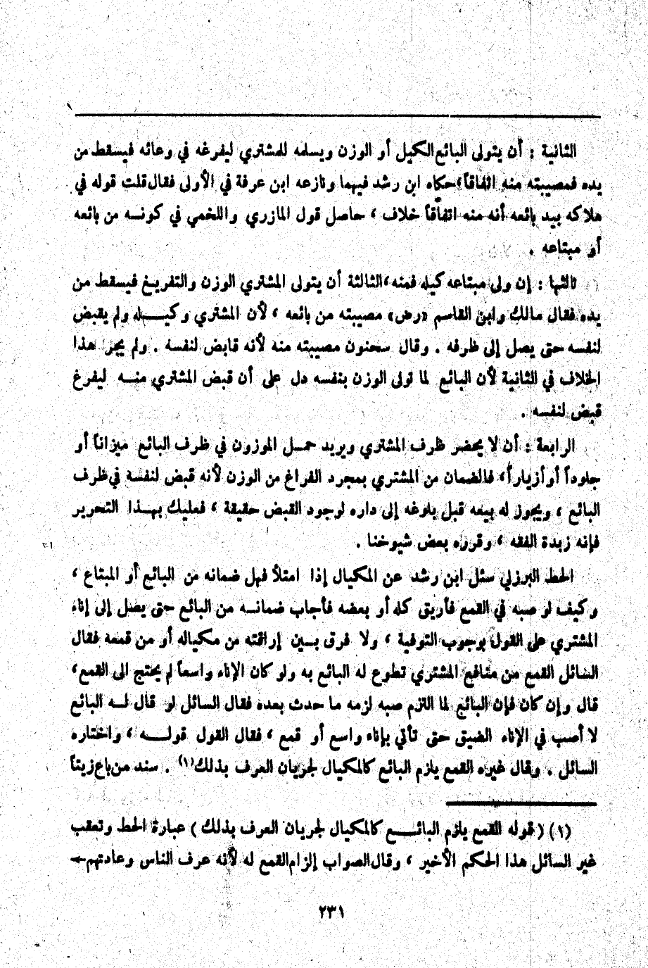 ـــــــــــــــــــــــــــــQالثَّانِيَةُ: أَنْ يَتَوَلَّى الْبَائِعُ الْكَيْلَ أَوْ الْوَزْنَ وَيُسَلِّمُهُ لِلْمُشْتَرِي لِيُفْرِغَهُ فِي وِعَائِهِ فَيَسْقُطُ مِنْ يَدِهِ فَمُصِيبَتُهُ مِنْهُ اتِّفَاقًا، حَكَاهُ ابْنُ رُشْدٍ فِيهِمَا وَنَازَعَهُ ابْنُ عَرَفَةَ فِي الْأُولَى فَقَالَ: قُلْت: قَوْلُهُ فِي هَلَاكِهِ بِيَدِ بَائِعِهِ أَنَّهُ مِنْهُ اتِّفَاقًا خِلَافُ حَاصِلِ قَوْلِ الْمَازِرِيِّ وَاللَّخْمِيِّ فِي كَوْنِهِ مِنْ بَائِعِهِ أَوْ مُبْتَاعِهِ ثَالِثُهَا: إنْ وَلَّى مُبْتَاعُهُ كَيْلَهُ فَمِنْهُ.