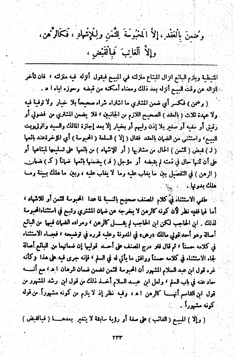 (وَضُمِنَ) بِضَمٍّ فَكَسْرٍ أَيْ ضَمِنَ الْمُشْتَرِي مَا اشْتَرَاهُ شِرَاءً صَحِيحًا بِلَا خِيَارٍ وَلَا تَوْفِيَةٍ فِيهِ وَلَا عُهْدَةِ ثَلَاثٍ (بِالْعَقْدِ) الصَّحِيحِ اللَّازِمِ مِنْ الْجَانِبَيْنِ، فَلَا يَضْمَنُ الْمُشْتَرِي مِنْ فُضُولِيٍّ أَوْ رَقِيقٍ أَوْ سَفِيهٍ أَوْ صَغِيرٍ بِلَا إذْنِ وَلِيِّهِمْ أَوْ بِخِيَارٍ إلَّا بَعْدَ إجَازَةِ الْمَالِكِ وَالسَّيِّدِ وَالْوَلِيِّ وَبَتِّ الْبَيْعِ، وَاسْتَثْنَى مِنْ الضَّمَانِ بِالْعَقْدِ فَقَالَ (إلَّا) السِّلْعَةَ (الْمَحْبُوسَةَ) أَيْ الْمُؤَخَّرَةَ عِنْدَ بَائِعِهَا (لِ) قَبْضِ (الثَّمَنِ) الْحَالِّ مِنْ مُشْتَرِيهَا (أَوْ لِلْإِشْهَادِ) مِنْ بَائِعِهَا عَلَى تَسْلِيمِهَا لِمُبْتَاعِهَا أَوْ عَلَى أَنَّ ثَمَنَهَا حَالٌّ فِي ذِمَّتِهِ لَمْ يَقْبِضْهُ أَوْ مُؤَجَّلٌ (فَ) يَضْمَنُهَا بَائِعُهَا ضَمَانًا (كَ) ضَمَانِ (الرَّهْنِ) فِي التَّفْصِيلِ بَيْنَ مَا يُغَابُ عَلَيْهِ وَمَا لَا يُغَابُ عَلَيْهِ، وَبَيْنَ مَا هَلَكَ بِبَيِّنَةٍ وَمَا هَلَكَ بِدُونِهَا طفي الِاسْتِثْنَاءُ فِي كَلَامِ الْمُصَنِّفِ صَحِيحٌ بِالنِّسْبَةِ لِمَا عَدَا الْمَحْبُوسَةَ لِلثَّمَنِ أَوْ لِلْإِشْهَادِ، أَمَّا لَهُمَا فَفِيهِ نَظَرٌ لِأَنَّ كَوْنَهُ كَالرَّهْنِ لَا يُخْرِجُهُ عَنْ ضَمَانِ الْمُشْتَرِي وَتَبِعَ فِي اسْتِثْنَاءِ الْمَحْبُوسَةِ لِذَلِكَ ابْنُ الْحَاجِبِ لَكِنَّ ابْنَ الْحَاجِبِ لَمْ يَقُلْ كَالرَّهْنِ، وَمُرَادُهُ الضَّمَانُ فِيهِمَا مِنْ الْبَائِعِ أَصَالَةً وَهُوَ أَحَدُ قَوْلَيْ مَالِكٍ " - رَضِيَ اللَّهُ عَنْهُ - " فِي الْمُدَوَّنَةِ وَعَلَيْهِ قَرَّرَهُ فِي تَوْضِيحِهِ، فَجَاءَ الِاسْتِثْنَاءُ فِي كَلَامِهِ حَسَنًا.