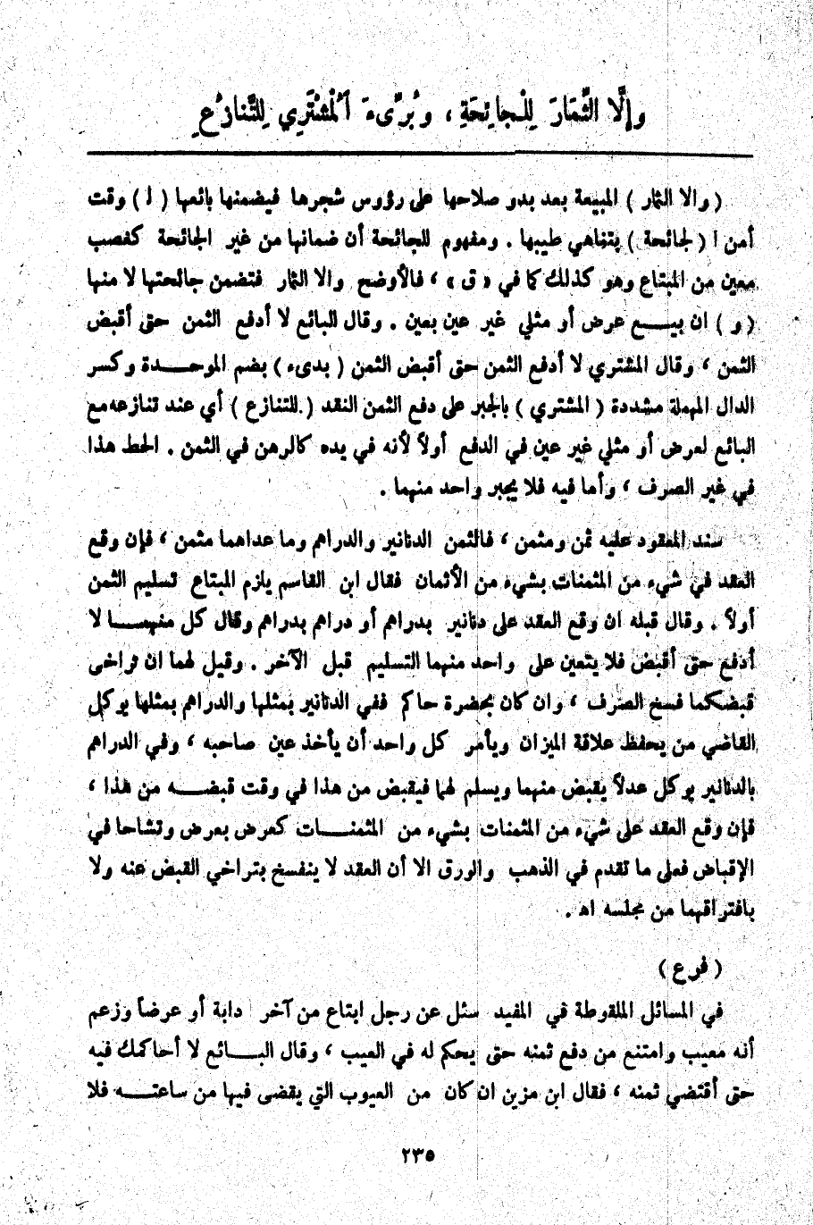 (فَرْعٌ) فِي الْمَسَائِلِ الْمَلْقُوطَةِ فِي الْمُفِيدِ سُئِلَ عَنْ رَجُلٍ ابْتَاعَ مِنْ آخَرَ دَابَّةً أَوْ عَرْضًا وَزَعَمَ أَنَّهُ مَعِيبٌ وَامْتَنَعَ مِنْ دَفْعِ ثَمَنِهِ حَتَّى يُحْكَمَ لَهُ فِي الْعَيْبِ، وَقَالَ الْبَائِعُ: لَا أُحَاكِمُك فِيهِ حَتَّى أَقْتَضِيَ ثَمَنَهُ، فَقَالَ ابْنُ مُزَيْنٍ: إنْ كَانَ مِنْ الْعُيُوبِ الَّتِي يُقْضَى فِيهَا مِنْ سَاعَتِهِ فَلَا