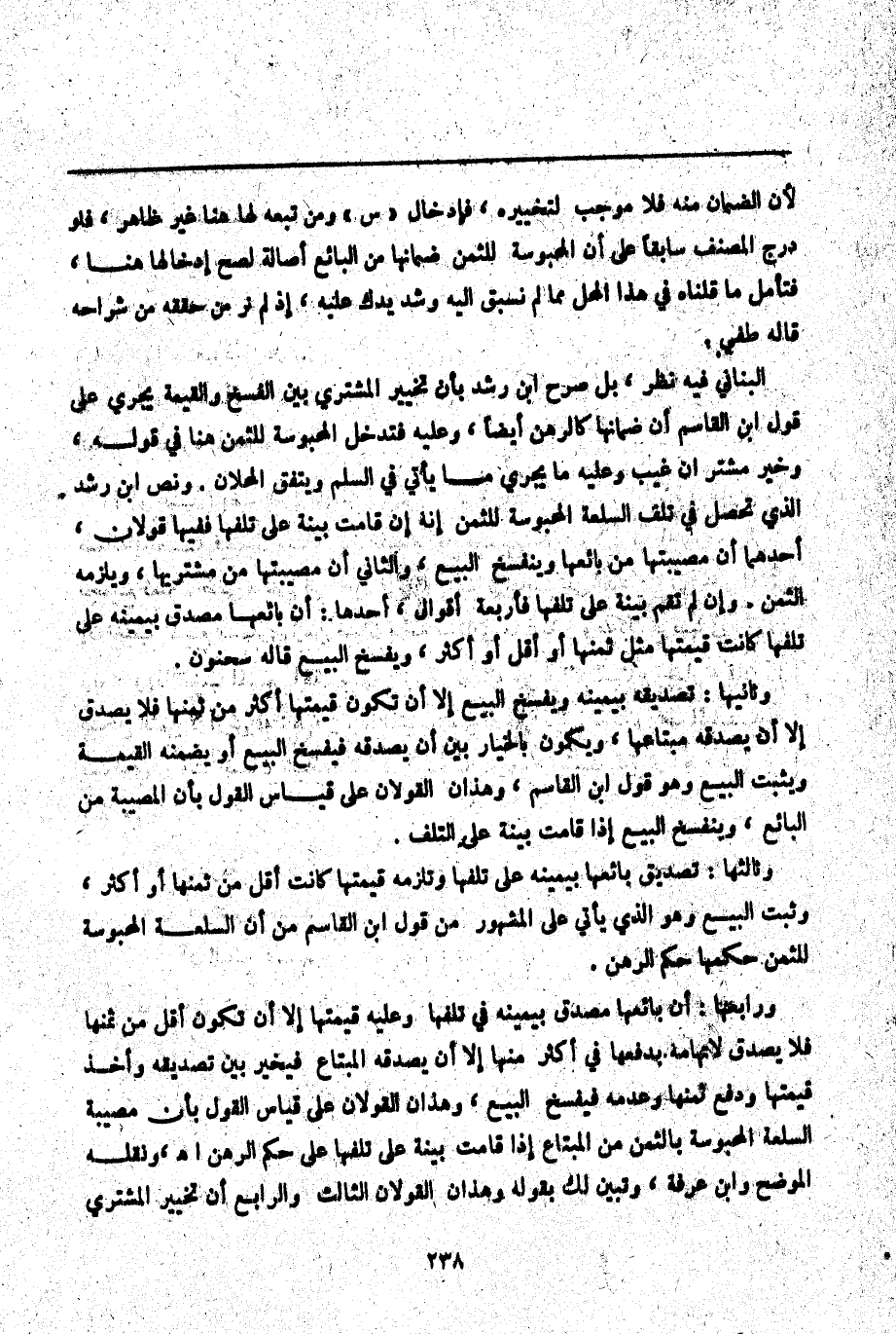 ـــــــــــــــــــــــــــــQلِأَنَّ الضَّمَانَ مِنْهُ فَلَا مُوجِبَ لِتَخْيِيرِهِ، فَإِدْخَالُ " س " وَمَنْ تَبِعَهُ لَهَا هُنَا غَيْرُ ظَاهِرٍ، فَلَوْ دَرَجَ الْمُصَنِّفُ سَابِقًا عَلَى أَنَّ الْمَحْبُوسَةَ لِلثَّمَنِ ضَمَانُهَا مِنْ الْبَائِعِ أَصَالَةً لَصَحَّ إدْخَالُهَا هُنَا، فَتَأَمَّلْ مَا قُلْنَاهُ فِي هَذَا الْمَحِلِّ مِمَّا لَمْ نُسْبَقْ إلَيْهِ وَشُدَّ يَدَكَ عَلَيْهِ، إذْ لَمْ نَرَ مَنْ حَقَّقَهُ مِنْ شُرَّاحِهِ قَالَهُ طفي الْبُنَانِيُّ فِيهِ نَظَرٌ، بَلْ صَرَّحَ ابْنُ رُشْدٍ بِأَنَّ تَخْيِيرَ الْمُشْتَرِي بَيْنَ الْفَسْخِ وَالْقِيمَةِ يَجْرِي عَلَى قَوْلِ ابْنِ الْقَاسِمِ أَنَّ ضَمَانَهَا كَالرَّهْنِ أَيْضًا، وَعَلَيْهِ فَتَدْخُلُ الْمَحْبُوسَةُ لِلثَّمَنِ هُنَا فِي قَوْلِهِ، وَخُيِّرَ مُشْتَرٍ إنْ غَيَّبَ وَعَلَيْهِ مَا يَجْرِي مَا يَأْتِي فِي السَّلَمِ وَيُتَّفَقُ الْمَحِلَّانِ وَنَصُّ ابْنِ رُشْدٍ الَّذِي تَحَصَّلَ فِي تَلَفِ السِّلْعَةِ الْمَحْبُوسَةِ لِلثَّمَنِ أَنَّهُ إنْ قَامَتْ بَيِّنَةٌ عَلَى تَلَفِهَا فَفِيهَا قَوْلَانِ، أَحَدُهُمَا أَنَّ مُصِيبَتَهَا مِنْ بَائِعِهَا وَيَنْفَسِخُ الْبَيْعُ، وَالثَّانِي أَنَّ مُصِيبَتَهَا مِنْ مُشْتَرِيهَا، وَيَلْزَمُهُ الثَّمَنُ وَإِنْ لَمْ تَقُمْ بَيِّنَةٌ عَلَى تَلَفِهَا فَأَرْبَعَةُ أَقْوَالٍ، أَحَدُهَا: أَنَّ بَائِعَهَا مُصَدَّقٌ بِيَمِينِهِ عَلَى تَلَفِهَا كَانَتْ قِيمَتُهَا مِثْلَ ثَمَنِهَا أَوْ أَقَلَّ أَوْ أَكْثَرَ، وَيُفْسَخُ الْبَيْعُ قَالَهُ سَحْنُونٌ وَثَانِيهَا: تَصْدِيقُهُ بِيَمِينِهِ وَيُفْسَخُ الْبَيْعُ إلَّا أَنْ تَكُونَ قِيمَتُهَا أَكْثَرَ مِنْ ثَمَنِهَا فَلَا يُصَدَّقُ إلَّا أَنْ يُصَدِّقَهُ مُبْتَاعُهَا، وَيَكُونُ بِالْخِيَارِ بَيْنَ أَنْ يُصَدِّقَهُ فَيَفْسَخُ الْبَيْعَ أَوْ يُضَمِّنُهُ الْقِيمَةَ وَيُثْبِتُ الْبَيْعَ وَهُوَ قَوْلُ ابْنِ الْقَاسِمِ، وَهَذَانِ الْقَوْلَانِ عَلَى قِيَاسِ الْقَوْلِ بِأَنَّ الْمُصِيبَةَ مِنْ الْبَائِعِ، وَيَنْفَسِخُ الْبَيْعُ إذَا قَامَتْ بَيِّنَةٌ عَلَى التَّلَفِ.