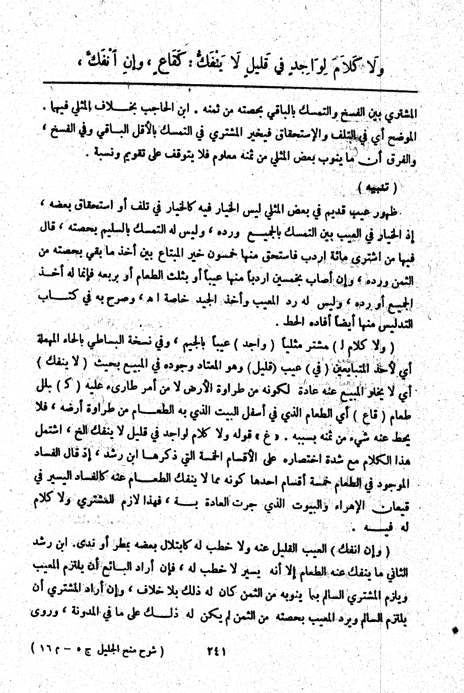 (تَنْبِيهٌ) ظُهُورُ عَيْبٍ قَدِيمٍ فِي بَعْضِ الْمِثْلِيِّ لَيْسَ الْخِيَارُ فِيهِ كَالْخِيَارِ فِي تَلَفٍ أَوْ اسْتِحْقَاقِ بَعْضِهِ إذْ الْخِيَارُ فِي الْعَيْبِ بَيْنَ التَّمَسُّكِ بِالْجَمِيعِ وَرَدِّهِ، وَلَيْسَ لَهُ التَّمَسُّكُ بِالسَّلِيمِ بِحِصَّتِهِ، قَالَ فِيهَا: مَنْ اشْتَرَى مِائَةَ إرْدَبّ فَاسْتُحِقَّ مِنْهَا خَمْسُونَ خُيِّرَ الْمُبْتَاعُ بَيْنَ أَخْذِ مَا بَقِيَ بِحِصَّتِهِ مِنْ الثَّمَنِ وَرَدِّهِ، وَإِنْ أَصَابَ بِخَمْسِينَ إرْدَبًّا مِنْهَا عَيْبًا أَوْ بِثُلُثِ الطَّعَامِ أَوْ بِرُبُعِهِ فَإِنَّمَا لَهُ أَخْذُ الْجَمِيعِ أَوْ رَدُّهُ، وَلَيْسَ لَهُ رَدُّ الْمَعِيبِ وَأَخْذُ الْجَيِّدِ خَاصَّةً اَ هـ، وَصَرَّحَ بِهِ فِي كِتَابِ التَّدْلِيسِ مِنْهَا أَيْضًا أَفَادَهُ الْحَطّ (وَلَا كَلَامَ لِ) مُشْتَرٍ مِثْلِيًّا (وَاجِدٍ) عَيْبًا بِالْجِيمِ، وَفِي نُسْخَةِ الْبِسَاطِيِّ بِالْحَاءِ الْمُهْمَلَةِ أَيْ لِأَحَدِ الْمُتَبَايِعَيْنِ (فِي) عَيْبٍ (قَلِيلٍ) وَهُوَ الْمُعْتَادُ وُجُودُهُ فِي الْمَبِيعِ بِحَيْثُ (لَا يَنْفَكُّ) أَيْ لَا يَخْلُو الْمَبِيعُ عَنْهُ عَادَةً لِكَوْنِهِ مِنْ طَرَاوَةِ الْأَرْضِ لَا مِنْ أَمْرٍ طَارِئٍ عَلَيْهِ (كَ) بَلَلِ طَعَامٍ (قَاعٍ) أَيْ الطَّعَامِ الَّذِي فِي أَسْفَلِ الْبَيْتِ الَّذِي بِهِ الطَّعَامُ مِنْ طَرَاوَةِ أَرْضِهِ، فَلَا يُحَطُّ عَنْهُ شَيْءٌ مِنْ ثَمَنِهِ بِسَبَبِهِ " غ " قَوْلُهُ وَلَا كَلَامَ لِوَاجِدٍ فِي قَلِيلٍ لَا يَنْفَكُّ إلَخْ، اشْتَمَلَ هَذَا الْكَلَامُ مَعَ شِدَّةِ اخْتِصَارِهِ عَلَى الْأَقْسَامِ الْخَمْسَةِ الَّتِي ذَكَرَهَا ابْنُ رُشْدٍ، إذْ قَالَ: الْفَسَادُ الْمَوْجُودُ فِي الطَّعَامِ خَمْسَةُ أَقْسَامٍ أَحَدُهَا كَوْنُهُ مِمَّا لَا يَنْفَكُّ الطَّعَامُ عَنْهُ كَالْفَسَادِ الْيَسِيرِ فِي قِيعَانِ الْإِهْرَاءِ وَالْبُيُوتِ الَّذِي جَرَتْ الْعَادَةُ بِهِ، فَهَذَا لَازِمٌ لِلْمُشْتَرِي وَلَا كَلَامَ لَهُ فِيهِ.