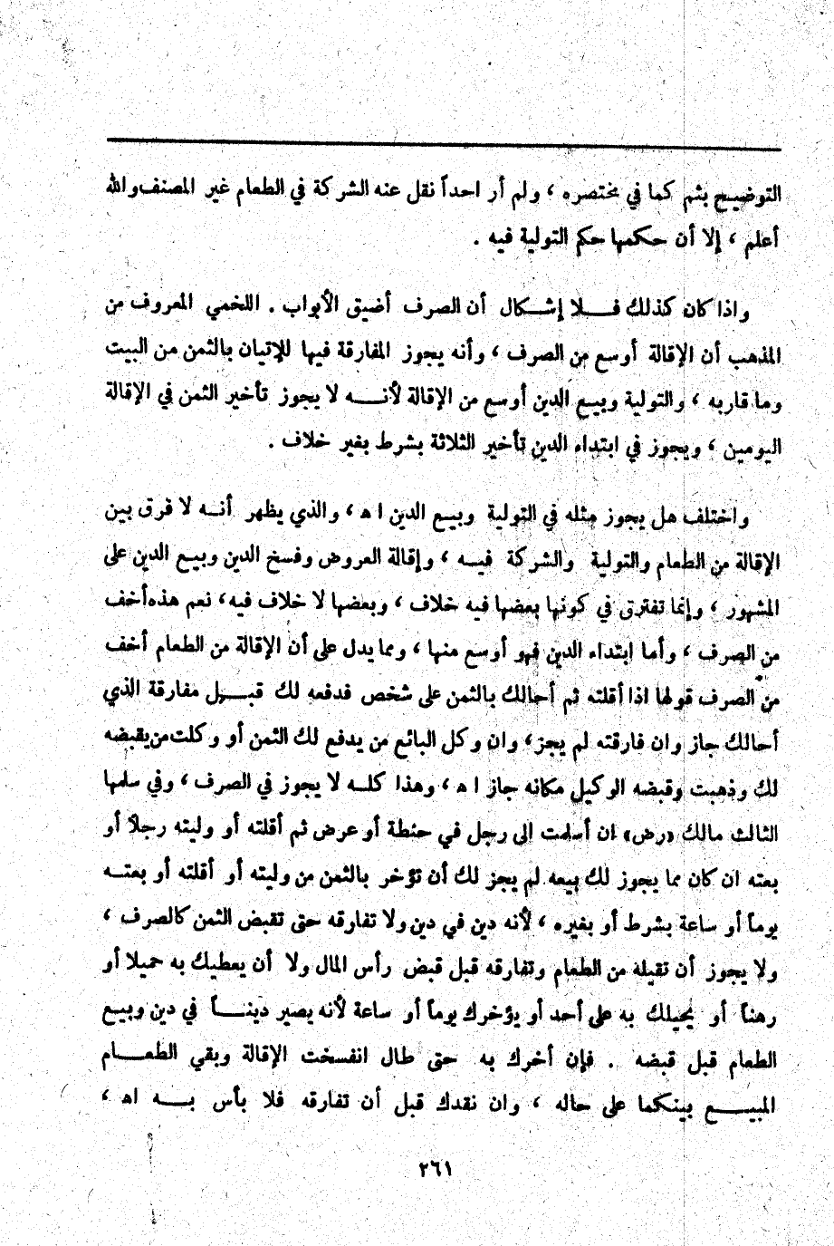 ـــــــــــــــــــــــــــــQالتَّوْضِيحِ بِثُمَّ كَمَا فِي مُخْتَصَرِهِ، وَلَمْ أَرَ أَحَدًا نَقَلَ عَنْهُ الشَّرِكَةَ فِي الطَّعَامِ غَيْرَ الْمُصَنِّفِ وَاَللَّهُ أَعْلَمُ، إلَّا أَنَّ حُكْمَهَا حُكْمُ التَّوْلِيَةِ فِيهِ وَإِذَا كَانَ كَذَلِكَ فَلَا إشْكَالَ أَنَّ الصَّرْفَ أَضْيَقُ الْأَبْوَابِ اللَّخْمِيُّ الْمَعْرُوفُ مِنْ الْمَذْهَبِ أَنَّ الْإِقَالَةَ أَوْسَعُ مِنْ الصَّرْفِ، وَأَنَّهُ يَجُوزُ الْمُفَارَقَةُ فِيهَا لِلْإِتْيَانِ بِالثَّمَنِ مِنْ الْبَيْتِ وَمَا قَارَبَهُ، وَالتَّوْلِيَةُ وَبَيْعُ الدَّيْنِ أَوْسَعُ مِنْ الْإِقَالَةِ لِأَنَّهُ لَا يَجُوزُ تَأْخِيرُ الثَّمَنِ فِي الْإِقَالَةِ الْيَوْمَيْنِ، وَيَجُوزُ فِي ابْتِدَا الدَّيْنِ تَأْخِيرُ الثَّلَاثَةِ بِشَرْطٍ بِغَيْرِ خِلَافٍ وَاخْتُلِفَ هَلْ يَجُوزُ مِثْلُهُ فِي التَّوْلِيَةِ وَبَيْعِ الدَّيْنِ اهـ.