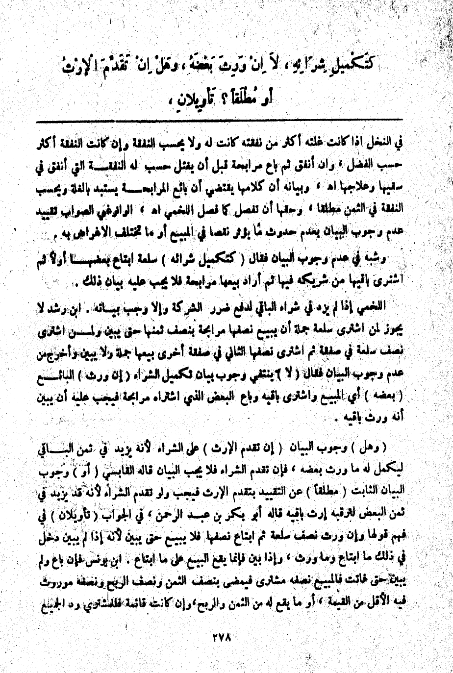 ابْنُ رُشْدٍ لَا يَجُوزُ لِمَنْ اشْتَرَى سِلْعَةً جُمْلَةً أَنْ يَبِيعَ نِصْفَهَا مُرَابَحَةً بِنِصْفِ ثَمَنِهَا حَتَّى يُبَيِّنَ وَلِمَنْ اشْتَرَى نِصْفَ سِلْعَةٍ فِي صَفْقَةٍ ثُمَّ اشْتَرَى نِصْفَهَا الثَّانِيَ فِي صَفْقَةٍ أُخْرَى بَيْعُهَا جُمْلَةً وَلَا يُبَيِّنُ وَأَخْرَجَ مِنْ عَدَمِ وُجُوبِ الْبَيَانِ فَقَالَ: (لَا) يَنْتَفِي وُجُوبُ بَيَانِ تَكْمِيلِ الشِّرَاءِ (إنْ وَرِثَ) الْبَائِعُ (بَعْضَهُ) أَيْ الْمَبِيعِ وَاشْتَرَى بَاقِيَهُ وَبَاعَ الْبَعْضَ الَّذِي اشْتَرَاهُ مُرَابَحَةً فَيَجِبُ عَلَيْهِ أَنْ يُبَيِّنَ أَنَّهُ وَرِثَ بَاقِيَهُ (وَهَلْ) وُجُوبُ الْبَيَانِ (إنْ تَقَدَّمَ الْإِرْثُ) عَلَى الشِّرَاءِ لِأَنَّهُ يُزِيدُ فِي ثَمَنِ الْبَاقِي لِيُكَمِّلَ لَهُ مَا وَرِثَ بَعْضَهُ، فَإِنْ تَقَدَّمَ الشِّرَاءُ فَلَا يَجِبُ الْبَيَانُ قَالَهُ الْقَابِسِيُّ (أَوْ) وُجُوبُ الْبَيَانِ الثَّابِتِ (مُطْلَقًا) عَنْ التَّقْيِيدِ بِتَقَدُّمِ الْإِرْثِ فَيَجِبُ وَلَوْ تَقَدَّمَ الشِّرَاءُ لِأَنَّهُ قَدْ يُزِيدُ فِي ثَمَنِ الْبَعْضِ لِتَرَقُّبِهِ إرْثَ بَاقِيهِ قَالَهُ أَبُو بَكْرِ بْنُ عَبْدِ الرَّحْمَنِ، فِي الْجَوَابِ (تَأْوِيلَانِ) فِي فَهْمِ قَوْلِهَا وَإِنْ وَرِثَ نِصْفَ سِلْعَةٍ ثُمَّ ابْتَاعَ نِصْفَهَا فَلَا يَبِيعُ حَتَّى يُبَيِّنَ لِأَنَّهُ إذَا لَمْ يُبَيِّنْ دَخَلَ فِي ذَلِكَ مَا ابْتَاعَ وَمَا وَرِثَ، وَإِذَا بَيَّنَ فَإِنَّمَا يَقَعُ الْبَيْعُ عَلَى مَا ابْتَاعَ ابْنُ يُونُسَ فَإِنْ بَاعَ وَلَمْ يُبَيِّنْ حَتَّى فَاتَتْ فَالْمَبِيعُ نِصْفُهُ مُشْتَرًى فَيَمْضِي بِنِصْفِ الثَّمَنِ وَنِصْفِ الرِّبْحِ وَنِصْفُهُ مَوْرُوثٌ فِيهِ الْأَقَلُّ مِنْ الْقِيمَةِ، أَوْ مَا يَقَعُ لَهُ مِنْ الثَّمَنِ وَالرِّبْحِ، وَإِنْ كَانَتْ قَائِمَةً فَلِلْمُشْتَرِي رَدُّ الْجَمِيعِ