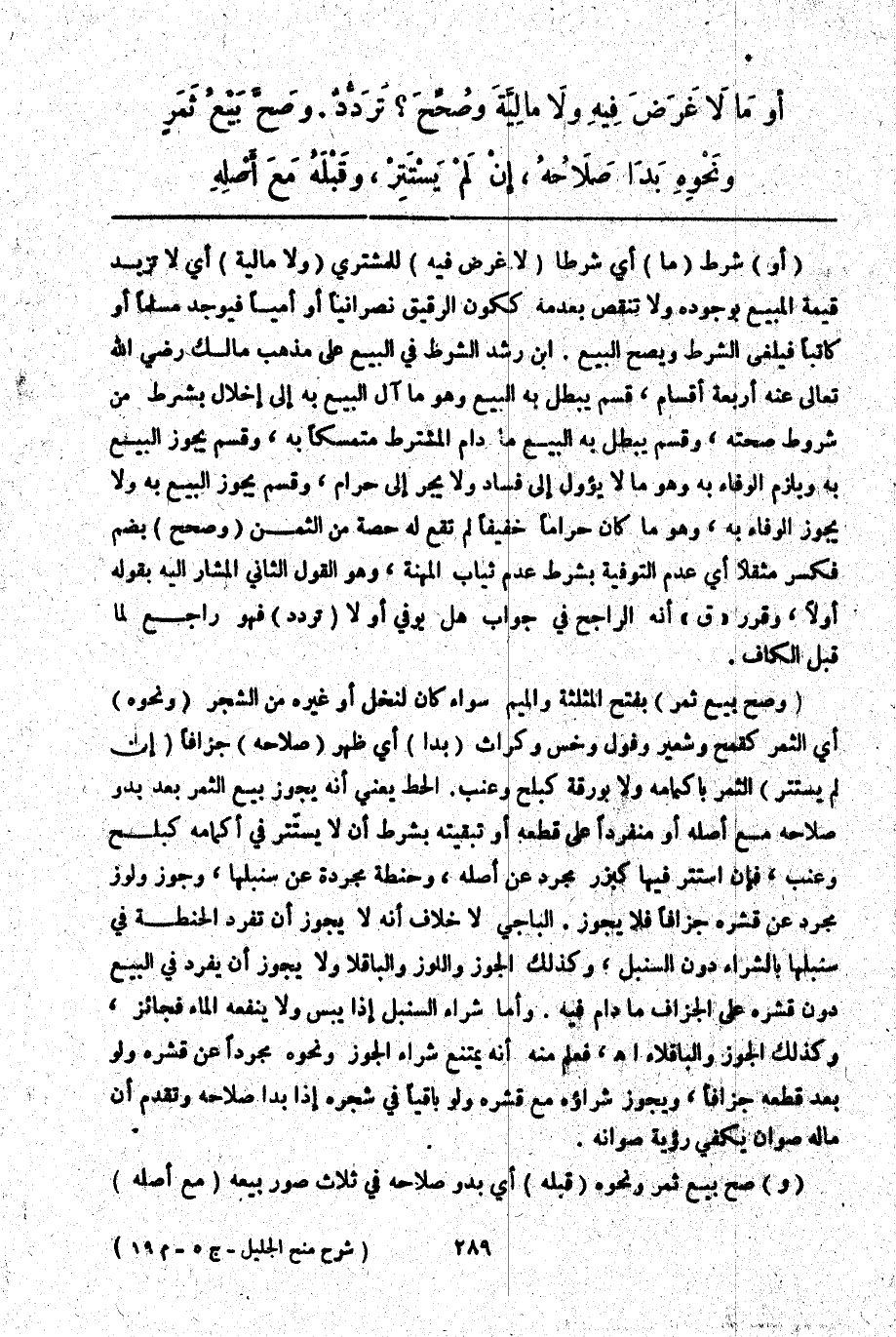 ـــــــــــــــــــــــــــــQأَوْ) شَرَطَ (مَا) أَيْ شَرْطًا (لَا غَرَضَ فِيهِ) لِلْمُشْتَرِي (وَلَا مَالِيَّةَ) أَيْ لَا تَزِيدُ قِيمَةُ الْمَبِيعِ بِوُجُودِهِ وَلَا تَنْقُصُ بِعَدَمِهِ كَكَوْنِ الرَّقِيقِ نَصْرَانِيًّا أَوْ أُمِّيًّا فَيُوجَدُ مُسْلِمًا أَوْ كَاتِبًا فَيُلْغَى الشَّرْطُ وَيَصِحُّ الْبَيْعُ ابْنُ رُشْدٍ الشَّرْطُ فِي الْبَيْعِ عَلَى مَذْهَبِ مَالِكٍ - رَضِيَ اللَّهُ تَعَالَى عَنْهُ - أَرْبَعَةُ أَقْسَامٍ، قِسْمٌ يَبْطُلُ بِهِ الْبَيْعُ وَهُوَ مَا آلَ الْبَيْعُ بِهِ إلَى إخْلَالٍ بِشَرْطٍ مِنْ شُرُوطِ صِحَّتِهِ، وَقِسْمٌ يَبْطُلُ بِهِ الْبَيْعُ مَا دَامَ الْمُشْتَرِطُ مُتَمَسِّكًا بِهِ، وَقِسْمٌ يَجُوزُ الْبَيْعُ بِهِ وَيَلْزَمُ الْوَفَاءُ بِهِ وَهُوَ مَا لَا يَئُولُ إلَى فَسَادٍ وَلَا يَجُرُّ إلَى حَرَامٍ، وَقِسْمٌ يَجُوزُ الْبَيْعُ بِهِ وَلَا يَجُوزُ الْوَفَاءُ بِهِ، وَهُوَ مَا كَانَ حَرَامًا خَفِيفًا لَمْ تَقَعْ لَهُ حِصَّةٌ مِنْ الثَّمَنِ (وَصُحِّحَ) بِضَمٍّ فَكَسْرٍ مُثَقَّلًا أَيْ عَدَمُ التَّوْفِيَةِ بِشَرْطِ عَدَمِ ثِيَابِ الْمَهْنَةِ، وَهُوَ الْقَوْلُ الثَّانِي الْمُشَارُ إلَيْهِ بِقَوْلِهِ أَوَّلًا، وَقَرَّرَ " ق " أَنَّهُ الرَّاجِحُ فِي جَوَابِ هَلْ يُوَفَّى أَوْ لَا (تَرَدُّدٌ) فَهُوَ رَاجِعٌ لِمَا قَبْلَ الْكَافِ.