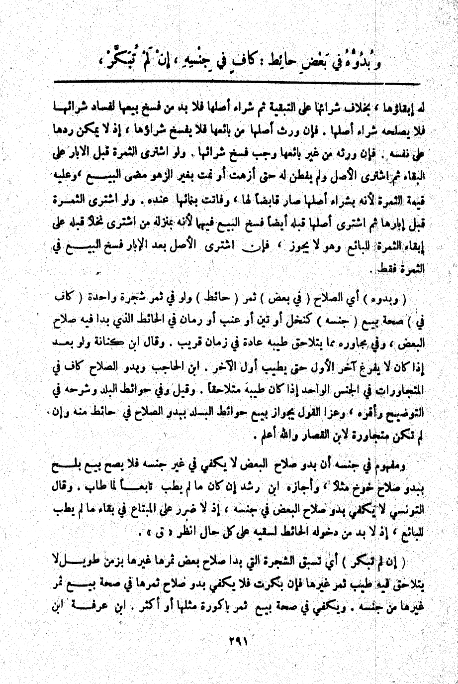(وَبُدُوُّهُ) أَيْ الصَّلَاحِ (فِي بَعْضِ) ثَمَرِ (حَائِطٍ) وَلَوْ فِي ثَمَرِ شَجَرَةٍ وَاحِدَةٍ (كَافٍ فِي) صِحَّةِ بَيْعِ (جِنْسِهِ) كَنَخْلٍ أَوْ تِينٍ أَوْ عِنَبٍ أَوْ رُمَّانٍ فِي الْحَائِطِ الَّذِي بَدَا فِيهِ صَلَاحُ الْبَعْضِ، وَفِي مُجَاوِرِهِ مِمَّا يَتَلَاحَقُ طِيبُهُ عَادَةً فِي زَمَانٍ قَرِيبٍ وَقَالَ ابْنُ كِنَانَةَ: وَلَوْ بَعُدَ إذَا كَانَ لَا يَفْرُغُ آخِرُ الْأَوَّلِ حَتَّى يَطِيبَ أَوَّلُ الْآخِرِ ابْنُ الْحَاجِبِ وَبُدُوُّ الصَّلَاحِ كَافٍ فِي الْمُتَجَاوِرَاتِ فِي الْجِنْسِ الْوَاحِدِ إذَا كَانَ طِيبُهُ مُتَلَاحِقًا وَقِيلَ: وَفِي حَوَائِطِ الْبَلَدِ وَشَرَحَهُ فِي التَّوْضِيحِ وَأَقَرَّهُ، وَعَزَا الْقَوْلَ بِجَوَازِ بَيْعِ حَوَائِطِ الْبَلَدِ بِبُدُوِّ الصَّلَاحِ فِي حَائِطٍ مِنْهُ وَإِنْ لَمْ تَكُنْ مُتَجَاوِرَةً لِابْنِ الْقَصَّارِ وَاَللَّهُ أَعْلَمُ وَمَفْهُومٌ فِي جِنْسه أَنَّ بُدُوَّ صَلَاحِ الْبَعْضِ لَا يَكْفِي فِي غَيْرِ جِنْسِهِ فَلَا يَصِحُّ بَيْعُ بَلَحٍ بِبُدُوِّ صَلَاحِ خَوْخٍ مَثَلًا، وَأَجَازَهُ ابْنُ رُشْدٍ إنْ كَانَ مَا لَمْ يَطِبْ تَابِعًا لِمَا طَابَ وَقَالَ التُّونُسِيُّ: لَا يَكْفِي بُدُوُّ صَلَاحِ الْبَعْضِ فِي جِنْسِهِ، إذْ لَا ضَرَرَ عَلَى الْمُبْتَاعِ فِي بَقَاءِ مَا لَمْ يَطِبْ لِلْبَائِعِ، إذْ لَا بُدَّ مِنْ دُخُولِهِ الْحَائِطَ لِسَقْيِهِ عَلَى كُلِّ حَالٍ اُنْظُرْ " ق " (إنْ لَمْ تُبَكَّرْ) أَيْ تَسْبِقُ الشَّجَرَةُ الَّتِي بَدَا صَلَاحُ بَعْضِ ثَمَرِهَا غَيْرَهَا بِزَمَنٍ طَوِيلٍ لَا يَتَلَاحَقُ فِيهِ طِيبُ ثَمَرِ غَيْرِهَا فَإِنْ بَكَّرَتْ فَلَا يَكْفِي بُدُوُّ صَلَاحِ ثَمَرِهَا فِي صِحَّةِ بَيْعِ ثَمَرِ غَيْرِهَا مِنْ جِنْسِهِ وَيَكْفِي فِي صِحَّةِ بَيْعِ ثَمَرِ بَاكُورَةِ مِثْلِهَا أَوْ أَكْثَرَ.
