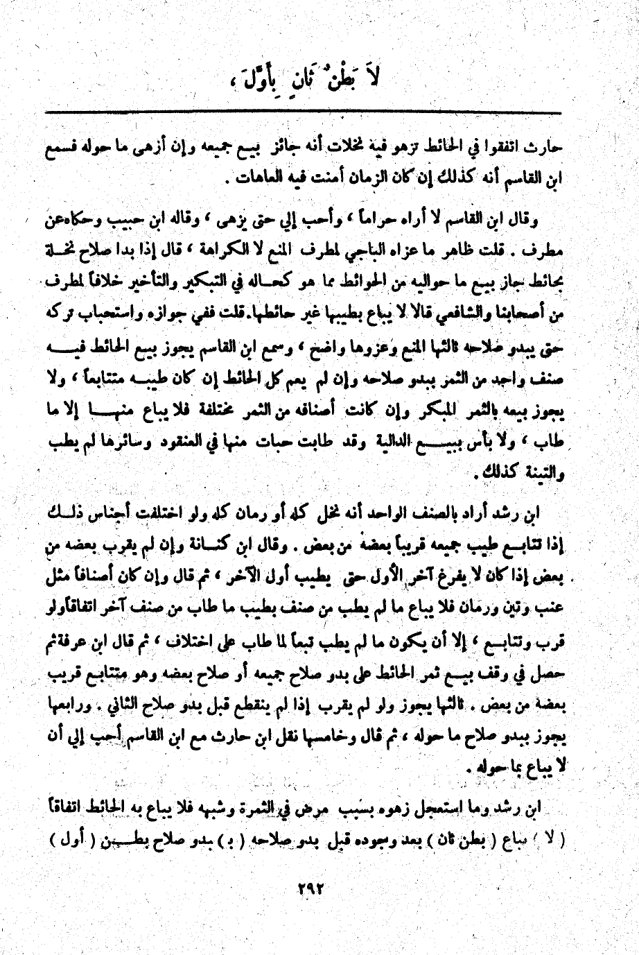 ثُمَّ قَالَ ابْنُ عَرَفَةَ: ثُمَّ حَصَلَ فِي وَقْفِ بَيْعِ ثَمَرِ الْحَائِطِ عَلَى بُدُوِّ صَلَاحِ جَمِيعِهِ أَوْ صَلَاحِ بَعْضِهِ وَهُوَ مُتَتَابِعٌ قَرِيبٌ بَعْضُهُ مِنْ بَعْضٍ ثَالِثُهَا يَجُوزُ وَلَوْ لَمْ يَقْرُبْ إذَا لَمْ يَنْقَطِعْ قَبْلَ بُدُوِّ صَلَاحِ الثَّانِي وَرَابِعُهَا يَجُوزُ بِبُدُوِّ صَلَاحِ مَا حَوْلَهُ، ثُمَّ قَالَ: وَخَامِسُهَا نَقْلُ ابْنِ حَارِثٍ مَعَ ابْنِ الْقَاسِمِ أَحَبُّ إلَيَّ أَنْ لَا يُبَاعَ بِمَا حَوْلَهُ ابْنُ رُشْدٍ وَمَا اسْتَعْجَلَ زَهْوُهُ بِسَبَبِ مَرَضٍ فِي الثَّمَرَةِ وَشِبْهِهِ فَلَا يُبَاعُ بِهِ الْحَائِطُ اتِّفَاقًا (لَا) يُبَاعُ (بَطْنٌ ثَانٍ) بَعْدَ وُجُودِهِ قَبْلَ بُدُوِّ صَلَاحِهِ (بَ) بُدُوِّ صَلَاحِ بَطْنٍ (أَوَّلٍ)