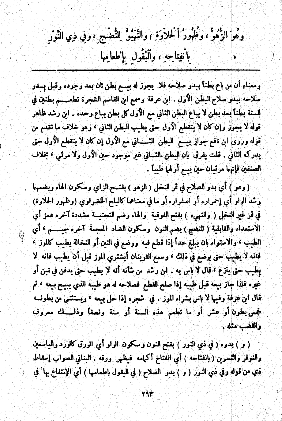 (وَ) بُدُوُّهُ (فِي ذِي النَّوْرِ) بِفَتْحِ النُّونِ وَسُكُونِ الْوَاوِ أَيْ الْوَرَقِ كَالْوَرْدِ وَالْيَاسَمِينِ وَالنَّوْفَرِ وَالنِّسْرِينِ (بِانْفِتَاحِهِ) أَيْ انْفِتَاحِ أَكْمَامِهِ فَيَظْهَرُ وَرَقُهُ الْبُنَانِيُّ الصَّوَابُ إسْقَاطُ ذِي مِنْ قَوْلِهِ وَفِي ذِي النَّوْرِ (وَ) بُدُوُّ الصَّلَاحِ (فِي الْبُقُولِ بِإِطْعَامِهَا) أَيْ الِانْتِفَاعِ بِهَا فِي
