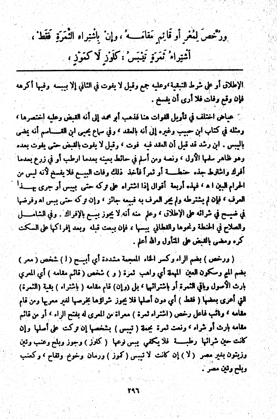 (وَرُخِّصَ) بِضَمِّ الرَّاءِ وَكَسْرِ الْخَاءِ الْمُعْجَمَةِ مُشَدَّدَةً أَيْ أُبِيحَ (لِ) شَخْصٍ (مُعْرٍ) بِضَمِّ الْمِيمِ وَسُكُونِ الْعَيْنِ الْمُهْمَلَةِ أَيْ وَاهِبٍ ثَمَرَةً (وَ) شَخْصٍ (قَائِمٍ مَقَامَهُ) أَيْ الْمُعْرِي بِإِرْثِ الْأُصُولِ وَبَاقِي الثَّمَرَةِ أَوْ بِاشْتِرَائِهِمَا، بَلْ (وَإِنْ) قَامَ مَقَامَهُ (بِاشْتِرَاءِ) بَقِيَّةِ (الثَّمَرَةِ) الَّتِي أَعْرَى بَعْضَهَا (فَقَطْ) أَيْ دُونَ أَصْلِهَا فَلَا يَجُوزُ شِرَاؤُهَا بِخَرْصِهَا لِغَيْرِ مُعْرِيهَا وَمَنْ قَامَ مَقَامَهُ، وَنَائِبُ فَاعِلِ رُخِّصَ (اشْتِرَاءُ ثَمَرَةٍ) مُعْرَاةٍ مِنْ الْمُعْرَى لَهُ بِفَتْحِ الرَّاءِ، أَوْ مِنْ قَائِمٍ مَقَامَهُ بِإِرْثٍ أَوْ شِرَاءٍ، وَنَعَتَ ثَمَرَةً بِجُمْلَةِ (تَيْبَسُ) بِشَخْصِهَا إنْ تُرِكَتْ عَلَى أَصْلِهَا وَإِنْ كَانَتْ حِينَ شِرَائِهَا رَطْبَةً فَلَا يَكْفِي يُبْسُ نَوْعِهَا (كَلَوْزٍ) وَجَوْزٍ وَبَلَحٍ وَعِنَبٍ وَتِينٍ وَزَيْتُونٍ بِغَيْرِ مِصْرَ (لَا) إنْ كَانَتْ لَا تَيْبَسُ (كَمَوْزٍ) وَرُمَّانٍ وَخَوْخٍ وَتُفَّاحٍ، وَكَعِنَبٍ وَبَلَحٍ وَتِينِ مِصْرَ.