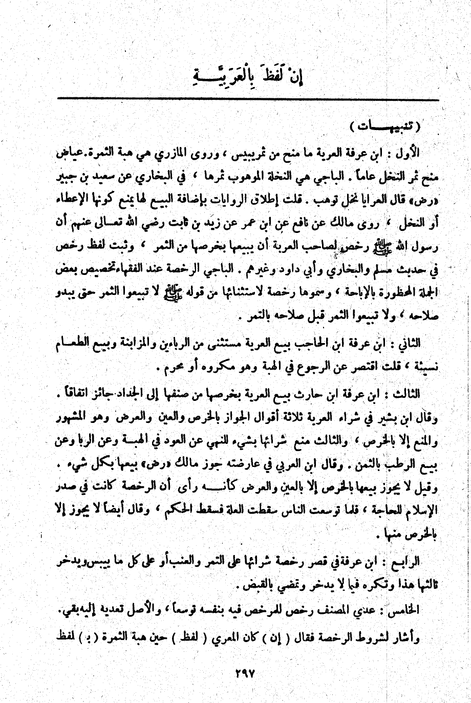 ـــــــــــــــــــــــــــــQتَنْبِيهَاتٌ) الْأَوَّلُ: ابْنُ عَرَفَةَ الْعَرِيَّةُ مَا مُنِحَ مِنْ ثَمَرٍ يَيْبَسُ، وَرَوَى الْمَازِرِيُّ هِيَ هِبَةُ الثَّمَرَةِ عِيَاضٌ مَنْحُ تَمْرِ النَّخْلِ عَامًّا الْبَاجِيَّ هِيَ النَّخْلَةُ الْمَوْهُوبُ ثَمَرُهَا فِي الْبُخَارِيِّ عَنْ سَعِيدِ بْنِ جُبَيْرٍ " - رَضِيَ اللَّهُ عَنْهُ - " قَالَ: الْعَرَايَا نَخْلٌ تُوهَبُ قُلْت: إطْلَاقُ الرِّوَايَاتِ بِإِضَافَةِ الْبَيْعِ لَهَا يَمْنَعُ كَوْنَهَا الْإِعْطَاءَ أَوْ النَّخْلَ رَوَى مَالِكٌ عَنْ نَافِعٍ عَنْ ابْنِ عُمَرَ عَنْ زَيْدِ بْنِ ثَابِتٍ - رَضِيَ اللَّهُ تَعَالَى عَنْهُمْ - «أَنَّ رَسُولَ اللَّهِ - صَلَّى اللَّهُ عَلَيْهِ وَسَلَّمَ - رَخَّصَ لِصَاحِبِ الْعَرِيَّةِ أَنْ يَبِيعَهَا بِخَرْصِهَا مِنْ الثَّمَرِ» ، وَثَبَتَ لَفْظُ رَخَّصَ فِي حَدِيثِ مُسْلِمٍ وَالْبُخَارِيِّ وَأَبِي دَاوُد وَغَيْرِهِمْ الْبَاجِيَّ الرُّخْصَةُ عِنْدَ الْفُقَهَاءِ تَخْصِيصُ بَعْضِ الْجُمْلَةِ الْمَحْظُورَةِ بِالْإِبَاحَةِ، وَسَمَّوْهَا رُخْصَةً لِاسْتِثْنَائِهَا مِنْ قَوْلِهِ - صَلَّى اللَّهُ عَلَيْهِ وَسَلَّمَ - «لَا تَبِيعُوا الثَّمَرَ حَتَّى يَبْدُوَ صَلَاحُهُ، وَلَا تَبِيعُوا الثَّمَرَ قَبْلَ صَلَاحِهِ بِالتَّمْرِ» الثَّانِي: ابْنُ عَرَفَةَ ابْنُ الْحَاجِبِ بَيْعُ الْعَرِيَّةِ مُسْتَثْنًى مِنْ الرِّبَاءَيْنِ وَالْمُزَابَنَةِ وَبَيْعِ الطَّعَامِ نَسِيئَةً، قُلْت اُقْتُصِرَ عَنْ الرُّجُوعِ فِي الْهِبَةِ وَهُوَ مَكْرُوهٌ أَوْ مُحَرَّمٌ الثَّالِثُ: ابْنُ عَرَفَةَ ابْنُ حَارِثٍ بَيْعُ الْعَرِيَّةِ بِخَرْصِهَا مِنْ صِنْفِهَا إلَى الْجِدَادِ جَائِزٌ اتِّفَاقًا وَقَالَ ابْنُ بَشِيرٍ: فِي شِرَاءِ الْعَرِيَّةِ ثَلَاثَةُ أَقْوَالٍ: الْجَوَازُ بِالْخَرْصِ وَالْعَيْنِ وَالْعَرَضِ وَهُوَ الْمَشْهُورُ وَالْمَنْعُ إلَّا بِالْخَرْصِ، وَالثَّالِثُ مَنْعُ شِرَائِهَا بِشَيْءٍ لِلنَّهْيِ عَنْ الْعَوْدِ فِي الْهِبَةِ وَعَنْ الرِّبَا وَعَنْ بَيْعِ الرُّطَبِ بِالثَّمَنِ وَقَالَ ابْنُ الْعَرَبِيِّ فِي عَارِضَتِهِ: جَوَّزَ مَالِكٌ " - رَضِيَ اللَّهُ عَنْهُ - " بَيْعَهَا بِكُلِّ شَيْءٍ وَقِيلَ: لَا يَجُوزُ بَيْعُهَا بِالْخَرْصِ إلَّا بِالْعَيْنِ وَالْعَرَضِ كَأَنَّهُ رَأَى أَنَّ الرُّخْصَةَ كَانَتْ فِي صَدْرِ الْإِسْلَامِ لِلْحَاجَةِ، فَلَمَّا تَوَسَّعَتْ النَّاسُ سَقَطَتْ الْعِلَّةُ فَسَقَطَ الْحُكْمُ، وَقَالَ أَيْضًا: لَا يَجُوزُ إلَّا بِالْخَرْصِ مِنْهَا الرَّابِعُ: ابْنُ عَرَفَةَ فِي قَصْرِ رُخْصَةِ شِرَائِهَا عَلَى التَّمْرِ وَالْعِنَبِ أَوْ عَلَى كُلِّ مَا يَيْبَسُ وَيُدَّخَرُ ثَالِثُهَا هَذَا وَتُكْرَهُ فِيمَا لَا يُدَّخَرُ وَتَمْضِي بِالْقَبْضِ الْخَامِسُ: عَدَّى الْمُصَنِّفُ رُخِّصَ لِلْمُرَخِّصِ فِيهِ بِنَفْسِهِ تَوَسُّعًا وَالْأَصْلُ تَعَدِّيهِ إلَيْهَا بِفِي.