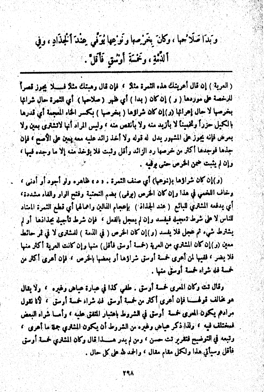 وَبَدَا صَلَاحُهَا، وَكَانَ بِخَرْصِهَا وَنَوْعِهَا يُوَفِّي عِنْدَ الْجَذَاذِ، وَفِي الذِّمَّةِ، وَخَمْسَةَ أَوْسُقٍ فَأَقَلَّ.