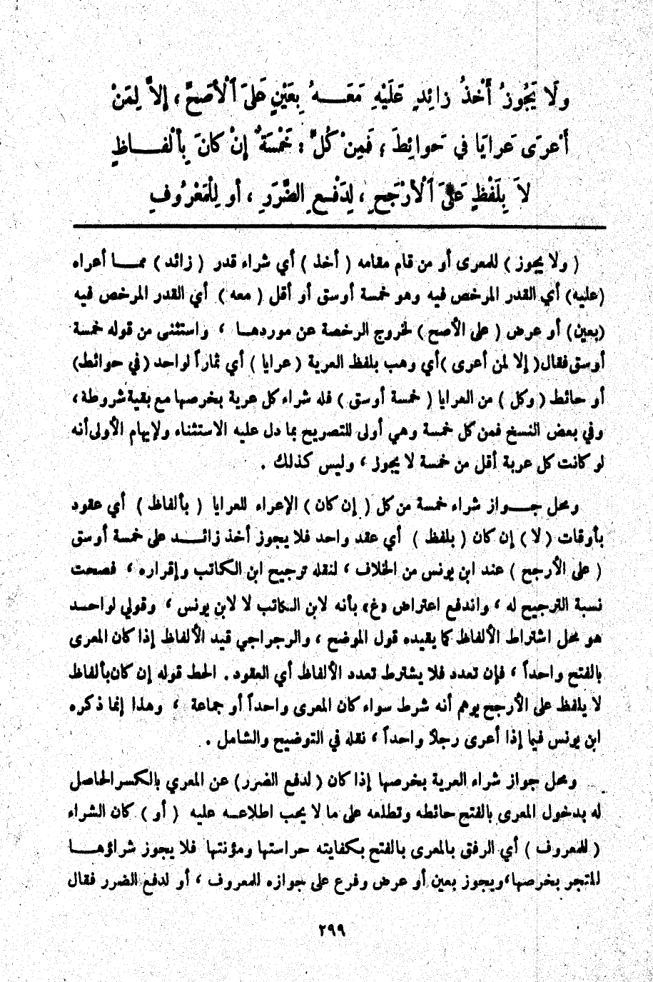 وَمَحِلُّ جَوَازِ شِرَاءِ خَمْسَةٍ مِنْ كُلٍّ (إنْ كَانَ) الْإِعْرَاءُ لِلْعَرَايَا (بِأَلْفَاظٍ) أَيْ عُقُودٍ بِأَوْقَاتٍ (لَا) إنْ كَانَ (بِلَفْظٍ) أَيْ عَقْدٍ وَاحِدٍ فَلَا يَجُوزُ أَخْذُ زَائِدٍ عَلَى خَمْسَةِ أَوْسُقٍ (عَلَى الْأَرْجَحِ) عِنْدَ ابْنِ يُونُسَ مِنْ الْخِلَافِ، لِنَقْلِهِ تَرْجِيحَ ابْنِ الْكَاتِبِ وَإِقْرَارَهُ، فَصَحَّتْ نِسْبَةُ التَّرْجِيحِ لَهُ، وَانْدَفَعَ اعْتِرَاضُ " غ " بِأَنَّهُ لِابْنِ الْكَاتِبِ لَا لِابْنِ يُونُسَ، وَقَوْلِي لِوَاحِدٍ هُوَ مَحِلُّ اشْتِرَاطِ الْأَلْفَاظِ كَمَا يُقَيِّدُهُ قَوْلُ الْمُوَضِّحِ وَالرَّجْرَاجِيُّ قَيَّدَ الْأَلْفَاظَ إذَا كَانَ الْمُعْرَى بِالْفَتْحِ وَاحِدًا، فَإِنْ تَعَدَّدَ فَلَا يُشْتَرَطُ تَعَدُّدُ الْأَلْفَاظِ أَيْ الْعُقُودِ الْحَطّ قَوْلُهُ إنْ كَانَ بِأَلْفَاظٍ لَا بِلَفْظٍ عَلَى الْأَرْجَحِ يُوهِمُ أَنَّهُ شَرْطٌ سَوَاءٌ كَانَ الْمُعْرِي وَاحِدًا أَوْ جَمَاعَةً، وَهَذَا إنَّمَا ذَكَرَهُ ابْنُ يُونُسَ فِيمَا إذَا أَعْرَى رَجُلًا وَاحِدًا، نَقَلَهُ فِي التَّوْضِيحِ وَالشَّامِلِ وَمَحِلُّ جَوَازِ شِرَاءِ الْعَرِيَّةِ بِخَرْصِهَا إذَا كَانَ (لِدَفْعِ الضَّرَرِ) عَنْ الْمُعْرِي بِالْكَسْرِ الْحَاصِلِ لَهُ بِدُخُولِ الْمُعْرَى بِالْفَتْحِ حَائِطَهُ وَتَطَلُّعِهِ عَلَى مَا لَا يَجِبُ اطِّلَاعُهُ عَلَيْهِ (أَوْ) كَانَ الشِّرَاءُ (لِلْمَعْرُوفِ) أَيْ الرِّفْقُ بِالْمُعْرَى بِالْفَتْحِ بِكِفَايَتِهِ حِرَاسَتَهَا وَمُؤْنَتَهَا فَلَا يَجُوزُ شِرَاؤُهَا لِلتَّجْرِ بِخَرْصِهَا، وَيَجُوزُ بِعَيْنٍ أَوْ عَرَضٍ وَفَرَّعَ عَلَى جَوَازِهِ لِلْمَعْرُوفِ، أَوْ لِدَفْعِ الضَّرَرِ فَقَالَ