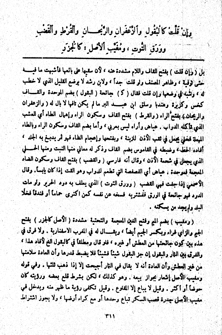 وَضَبَطَهُ فِي الْقَامُوسِ بِضَمِّ الْقَافِ وَذَكَرَ لَهُ مَعَانِيَ مِنْهَا النَّبْتُ وَمِنْهَا الْحُلِيُّ الَّذِي يُجْعَلُ فِي شَحْمَةِ الْأُذُنِ، وَقَالَ: إنَّهُ فَارِسِيٌّ (وَالْقَضْبِ) بِفَتْحِ الْقَافِ وَسُكُونِ الضَّادِ الْمُعْجَمَةِ فَمُوَحَّدَةٌ عِيَاضٌ أَيْ الْفِصْفِصَةِ الَّتِي تُطْعَمُ لِلدَّوَابِّ وَهُوَ الْقَتُّ إذَا كَانَ يَابِسًا وَقَالَ الْأَصْمَعِيُّ: إذَا جَفَّتْ فَهِيَ الْقَضْبُ (وَوَرَقِ التُّوتِ) الَّذِي يُعْلَفُ بِهِ دُودُ الْحَرِيرِ وَلَوْ مَاتَ الدُّودُ فَهُوَ جَائِحَةٌ فِي الْوَرَقِ فَلِمُشْتَرِيهِ فَسْخُهُ عَنْ نَفْسٍ كَمَنْ اكْتَرَى حَمَّامًا أَوْ فُنْدُقًا فَخَلَا الْبَلَدُ وَلَمْ يَجِدْ مَنْ يَسْكُنُهُ (وَمُغَيَّبِ) بِضَمِّ الْمِيمِ وَفَتْحِ الْغَيْنِ الْمُعْجَمَةِ وَالتَّحْتِيَّةِ مُشَدَّدَةً (الْأَصْلِ كَالْجَزَرِ) بِفَتْحِ الْجِيمِ وَالزَّايِ فَرَاءٌ وَبِكَسْرِ الْجِيمِ أَيْضًا، وَيُقَالُ لَهُ فِي الْمُغْرِبِ الإسفنارية وَلَا فَرْقَ فِي هَذِهِ بَيْنَ كَوْنِ جَائِحَتِهَا مِنْ الْعَطَشِ أَوْ غَيْرِهِ، فَلَوْ قَالَ: وَمُطْلَقًا فِي كَالْبُقُولِ إلَخْ لَأَفَادَ هَذَا، وَالْفَرْقُ بَيْنَ الثِّمَارِ وَالْبُقُولِ أَنْ جَذَّ الْبُقُولِ شَيْئًا فَشَيْئًا فَلَا يُضْبَطُ قَدْرُهَا وَأَنَّ الْعَادَةَ سَلَامَتُهَا مِنْ غَيْرِ الْعَطَشِ وَأَنَّ الْعَادَةَ أَنَّهُ لَا يُقَالُ فِي الثِّمَارِ أُجِيحَتْ إلَّا إذَا ذَهَبَ ثُلُثُهَا وَفِي قَوْلِهِ وَمُغَيَّبِ الْأَصْلِ إشْعَارٌ بِجَوَازِ بَيْعِهِ وَهُوَ كَذَلِكَ، لَكِنْ بِشَرْطِ قَلْعِ بَعْضِهِ وَرُؤْيَتِهِ كَانَ حَوْضًا أَوْ أَكْثَرَ وَقِيلَ: لَا يُبَاعُ إلَّا الْمَقْلُوعُ وَقِيلَ: تَكْفِي رُؤْيَةُ مَا ظَهَرَ مِنْهُ وَيَدْخُلُ فِي مُغَيَّبِ الْأَصْلِ جَدَرَةُ قَصَبِ السُّكْرِ تُبَاعُ وَحْدَهَا أَوْ مَعَ كِرَاءِ أَرْضِهَا، وَلَا يَجُوزُ اشْتِرَاطُ