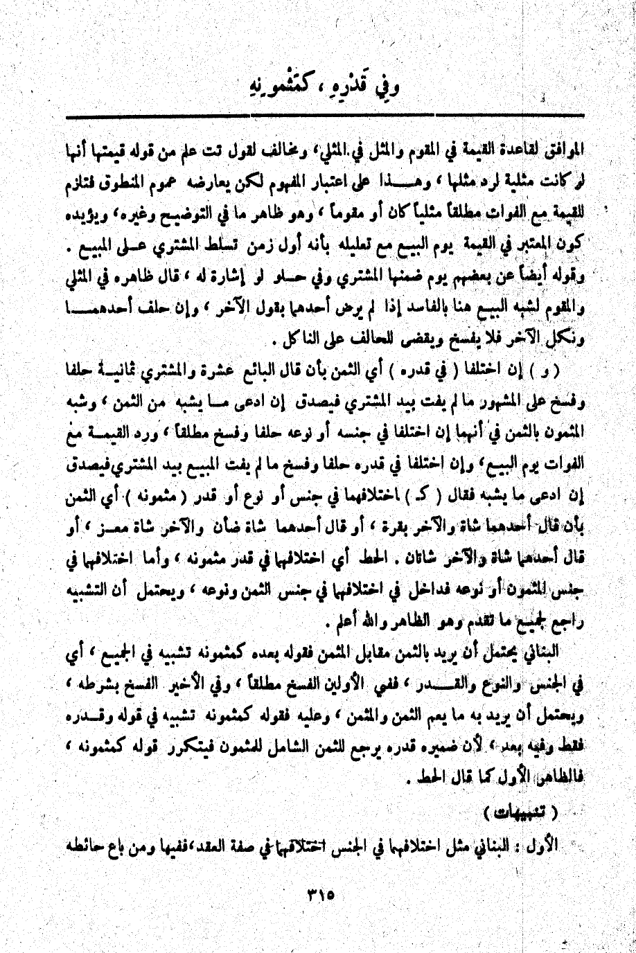 الْبُنَانِيُّ يَحْتَمِلُ أَنْ يُرِيدَ بِالثَّمَنِ مُقَابِلَ الْمُثَمَّنِ فَقَوْلُهُ بَعْدَهُ كَمَثْمُونِهِ تَشْبِيهٌ فِي الْجَمِيعِ، أَيْ فِي الْجِنْسِ وَالنَّوْعِ وَالْقَدْرِ، فَفِي الْأَوَّلَيْنِ الْفَسْخُ مُطْلَقًا، وَفِي الْأَخِيرِ الْفَسْخُ بِشَرْطِهِ، وَيَحْتَمِلُ أَنْ يُرِيدَ بِهِ مَا يَعُمُّ الثَّمَنَ وَالْمُثَمَّنَ، وَعَلَيْهِ فَقَوْلُهُ كَمَثْمُونِهِ تَشْبِيهٌ فِي قَوْلِهِ وَقَدْرِهِ فَقَطْ وَفِيهِ بُعْدٌ لِأَنَّ ضَمِيرَ قَدْرِهِ يَرْجِعُ لِلثَّمَنِ الشَّامِلِ لِلْمَثْمُونِ فَيَتَكَرَّرُ قَوْلُهُ كَمَثْمُونِهِ فَالظَّاهِرُ الْأَوَّلُ كَمَا قَالَ الْحَطّ. (تَنْبِيهَاتٌ) الْأَوَّلُ: الْبُنَانِيُّ مِثْلُ اخْتِلَافِهِمَا فِي الْجِنْسِ اخْتِلَافُهُمَا فِي صِفَةِ الْعَقْدِ، فَفِيهَا وَمَنْ بَاعَ حَائِطَهُ