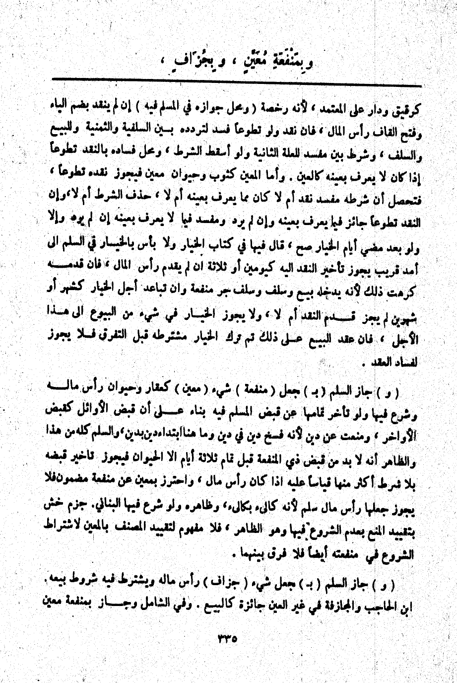 (وَ) جَازَ السَّلَمُ (بِ) جَعْلِ (مَنْفَعَةِ) شَيْءٍ (مُعَيَّنٍ) كَعَقَارٍ وَحَيَوَانٍ رَأْسَ مَالِهِ وَشَرَعَ فِيهَا وَلَوْ تَأَخَّرَ تَمَامُهَا عَنْ قَبْضِ الْمُسْلَمِ فِيهِ بِنَاءً عَلَى أَنَّ قَبْضَ الْأَوَائِلِ كَقَبْضِ الْأَوَاخِرِ، وَمُنِعَتْ عَنْ دَيْنٍ لِأَنَّهُ فَسْخُ دَيْنٍ فِي دَيْنٍ وَمَا هُنَا ابْتِدَاءُ دَيْنٍ بِدَيْنٍ، وَالسَّلَمُ كُلُّهُ مِنْ هَذَا وَالظَّاهِرُ أَنَّهُ لَا بُدَّ مِنْ قَبْضِ ذِي الْمَنْفَعَةِ قَبْلَ تَمَامِ ثَلَاثَةِ أَيَّامٍ إلَّا الْحَيَوَانَ فَيَجُوزُ تَأْخِيرُ قَبْضِهِ بِلَا شَرْطٍ أَكْثَرَ مِنْهَا قِيَاسًا عَلَيْهِ إذَا كَانَ رَأْسَ مَالٍ، وَاحْتُرِزَ بِمُعَيَّنٍ عَنْ مَنْفَعَةِ مَضْمُونٍ فَلَا يَجُوزُ جَعْلُهَا رَأْسَ مَالِ سَلَمٍ لِأَنَّهُ كَالِئٌ بِكَالِئٍ، وَظَاهِرُهُ وَلَوْ شَرَعَ فِيهَا الْبُنَانِيُّ. جَزَمَ خش بِتَقْيِيدِ الْمَنْعِ بِعَدَمِ الشُّرُوعِ فِيهَا وَهُوَ الظَّاهِرُ، فَلَا مَفْهُومَ لِتَقْيِيدِ الْمُصَنِّفِ بِالْمُعَيَّنِ لِاشْتِرَاطِ الشُّرُوعِ فِي مَنْفَعَتِهِ أَيْضًا فَلَا فَرْقَ بَيْنَهُمَا.