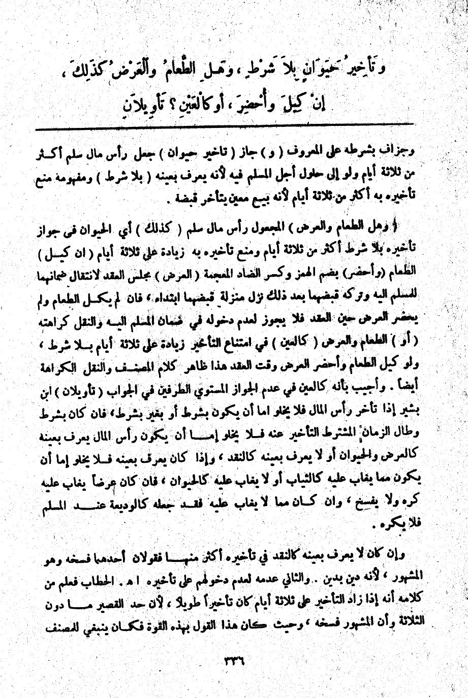 وَتَأْخِيرُ حَيَوَانٍ بِلَا شَرْطٍ، وَهَلْ الطَّعَامُ وَالْعَرْضُ كَذَلِكَ، إنْ كِيلَ وَأُحْضِرَ، أَوْ كَالْعَيْنِ؟ تَأْوِيلَانِ