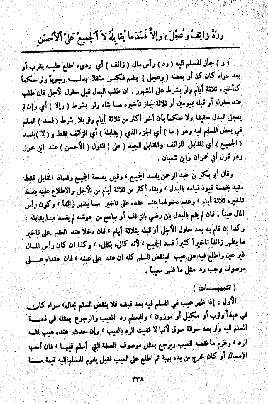 ـــــــــــــــــــــــــــــQ (وَ) جَازَ لِلْمُسْلَمِ إلَيْهِ (رَدُّ) رَأْسِ مَالٍ (زَائِفٍ) أَيْ رَدِيءٍ اطَّلَعَ عَلَيْهِ بِقُرْبٍ أَوْ بُعْدٍ سَوَاءٌ كَانَ كُلَّهُ أَوْ بَعْضَهُ (وَعُجِّلَ) بِضَمٍّ فَكَسْرٍ مُثَقَّلًا بَدَلُهُ وُجُوبًا وَلَوْ حُكْمًا كَتَأْخِيرِهِ ثَلَاثَةَ أَيَّامٍ وَلَوْ بِشَرْطٍ عَلَى الْمَشْهُورِ. إنْ طَلَبَ الْبَدَلَ قَبْلَ حُلُولِ الْأَجَلِ فَإِنْ طَلَبَ عِنْدَ حُلُولِهِ أَوْ قَبْلَهُ بِيَوْمَيْنِ أَوْ ثَلَاثَةٍ جَازَ تَأْخِيرُهُ مَا شَاءَ وَلَوْ بِشَرْطٍ (وَإِلَّا) أَيْ وَإِنْ لَمْ يُعَجِّلْ الْبَدَلَ حَقِيقَةً وَلَا حُكْمًا بِأَنْ أَخَّرَ أَكْثَرَ مِنْ ثَلَاثَةِ أَيَّامٍ وَلَوْ بِلَا شَرْطٍ (فَسَدَ) السَّلَمُ فِي بَعْضِ الْمُسْلَمِ فِيهِ وَهُوَ (مَا) أَيْ الْجُزْءُ الَّذِي (يُقَابِلُهُ) أَيْ الزَّائِفُ فَقَطْ و (لَا) يَفْسُدُ (الْجَمِيعُ) أَيْ الْمُقَابِلُ لِلزَّائِفِ وَالْمُقَابِلُ الْجَيِّدُ (عَلَى) الْقَوْلِ (الْأَحْسَنِ) عِنْدَ ابْنِ مُحْرِزٍ وَهُوَ قَوْلُ أَبِي عِمْرَانَ وَابْنِ شَعْبَانَ.